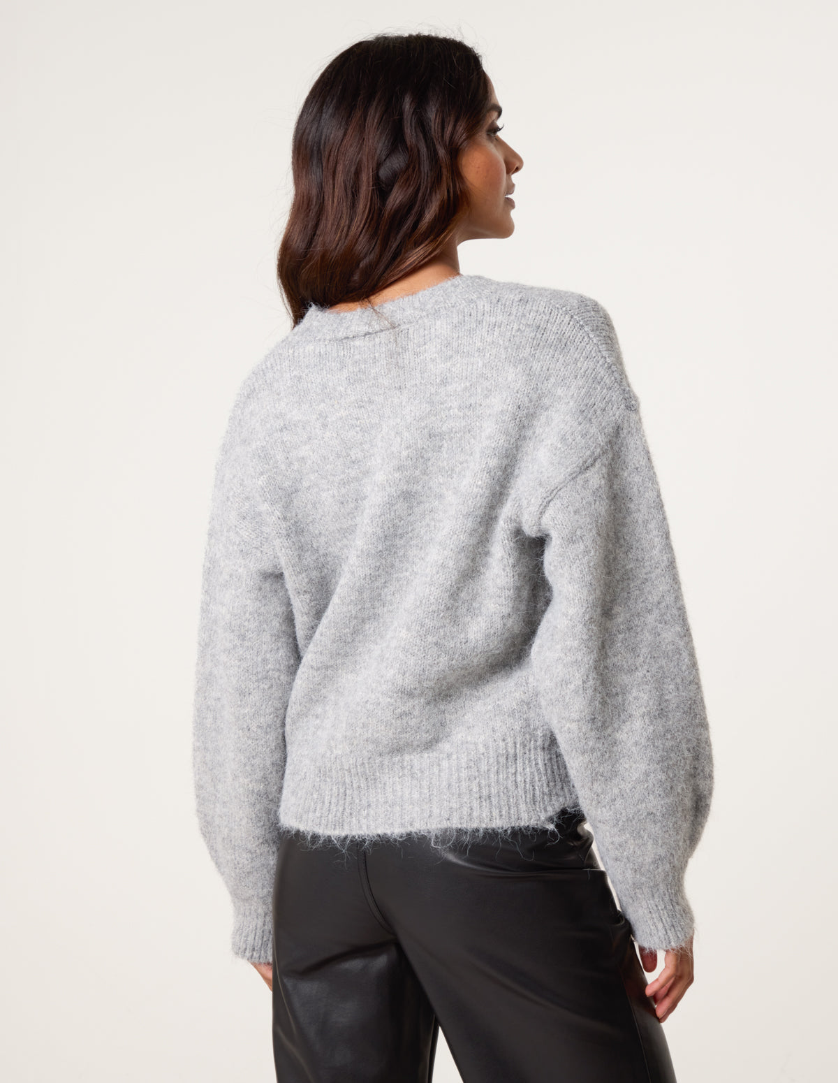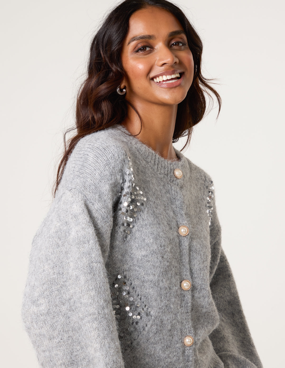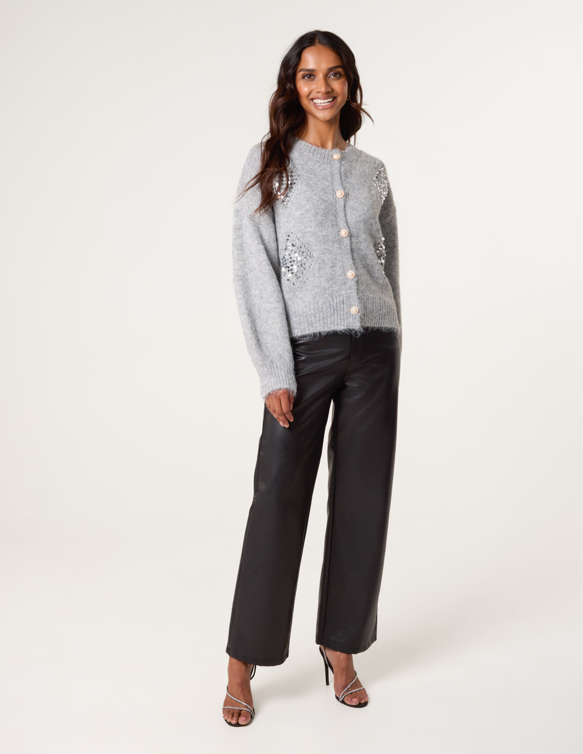 Glam up your party looks while staying warm this AW. Team this sequin soft touch cardi with a basic grey top with sheer tights and PU shorts.