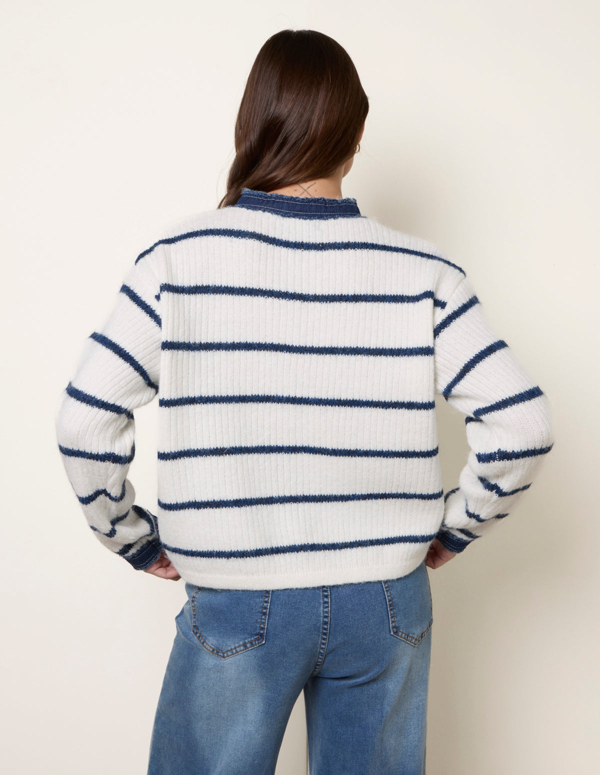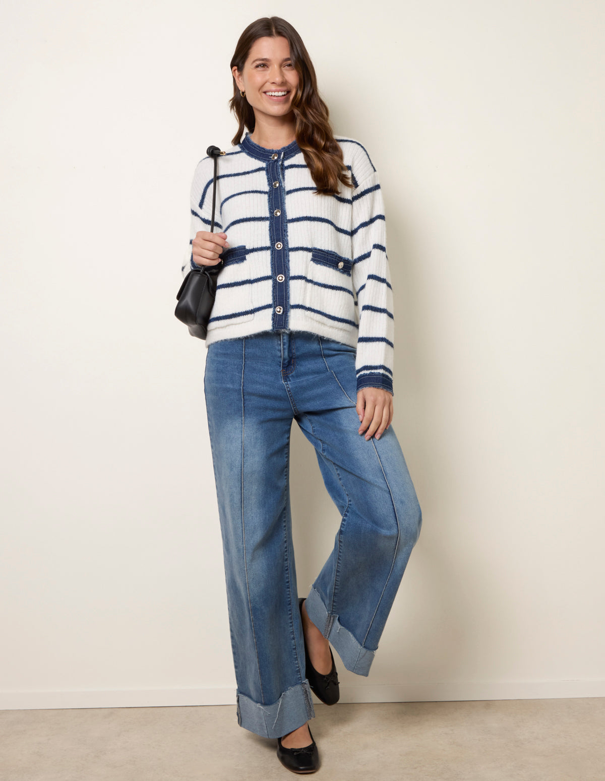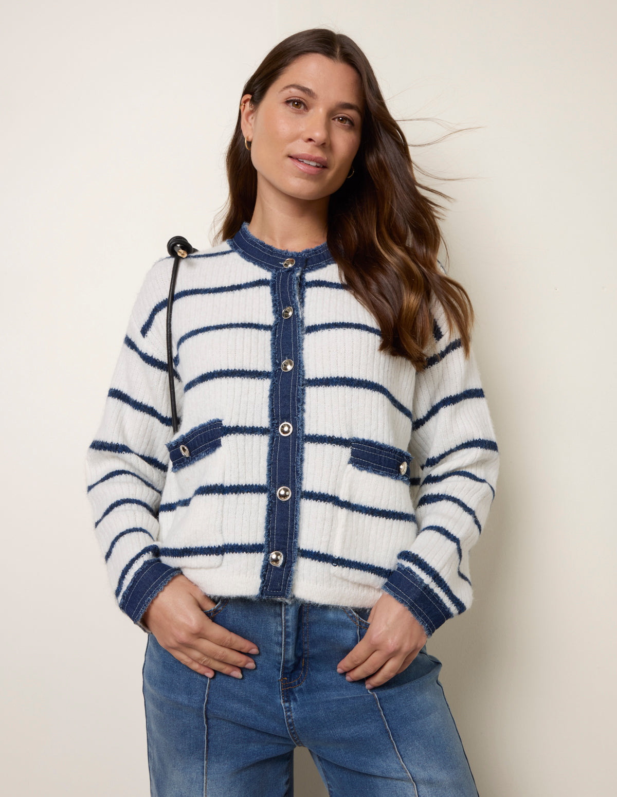 Add a cosy touch to your look with this stripped cardigan. Its textural denim touch, bring a stylish touch to the button-up knit.