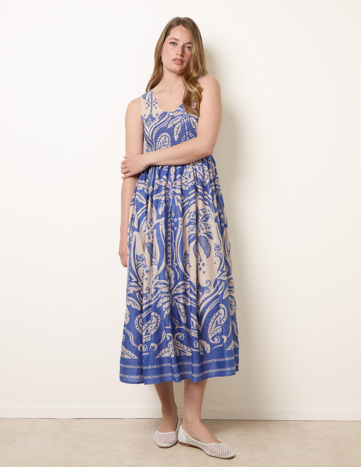 The comfy summery shirred dress features a stretchy bodice and a long A-line skirt. Team with flip flops and a suedette bag.