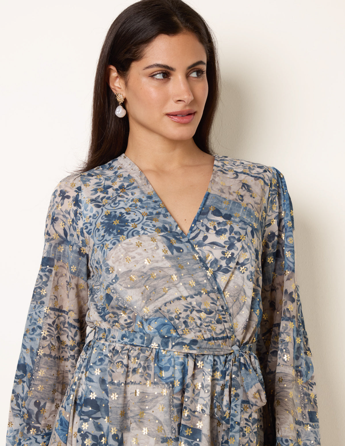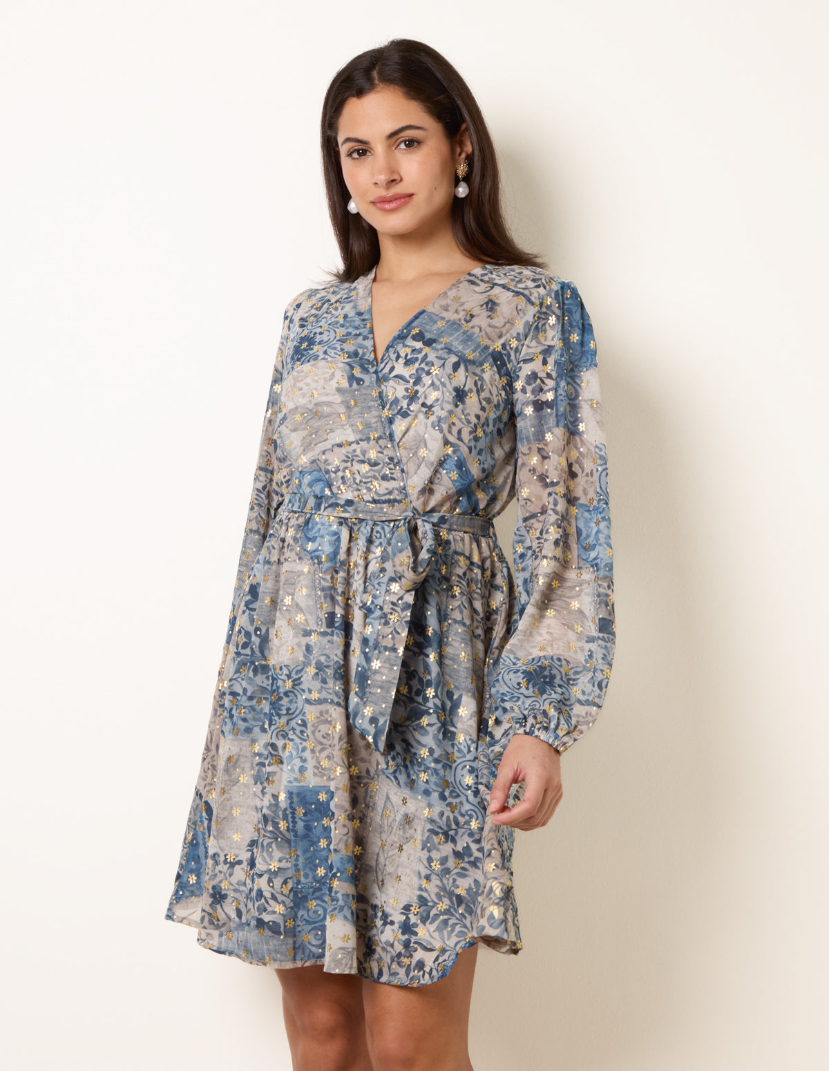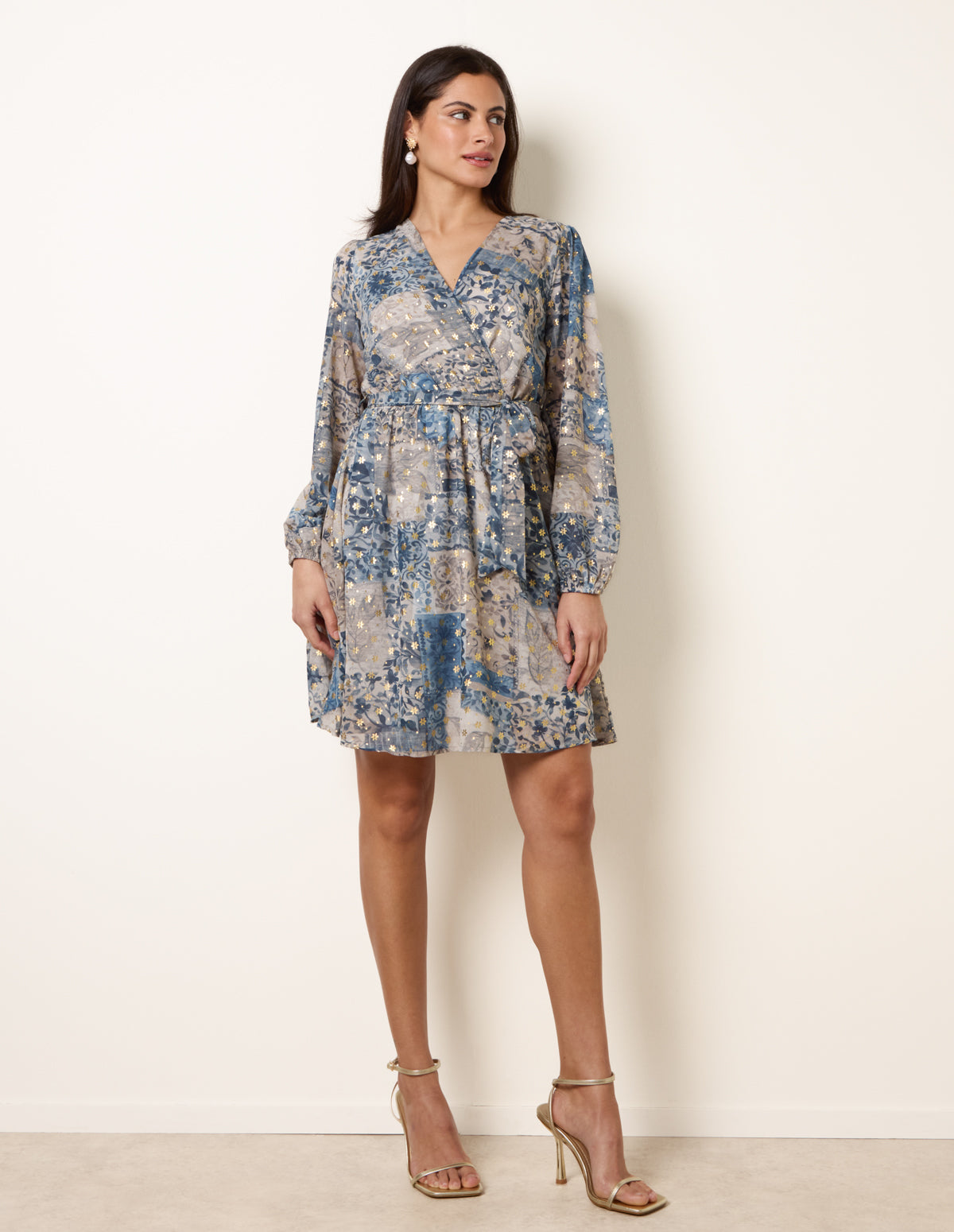 Flatter your silhouette with this metallic wrap dress, perfect for date night. The long sleeves and waist tie add a touch of elegance to its playful pattern.