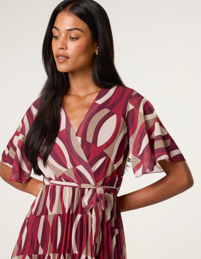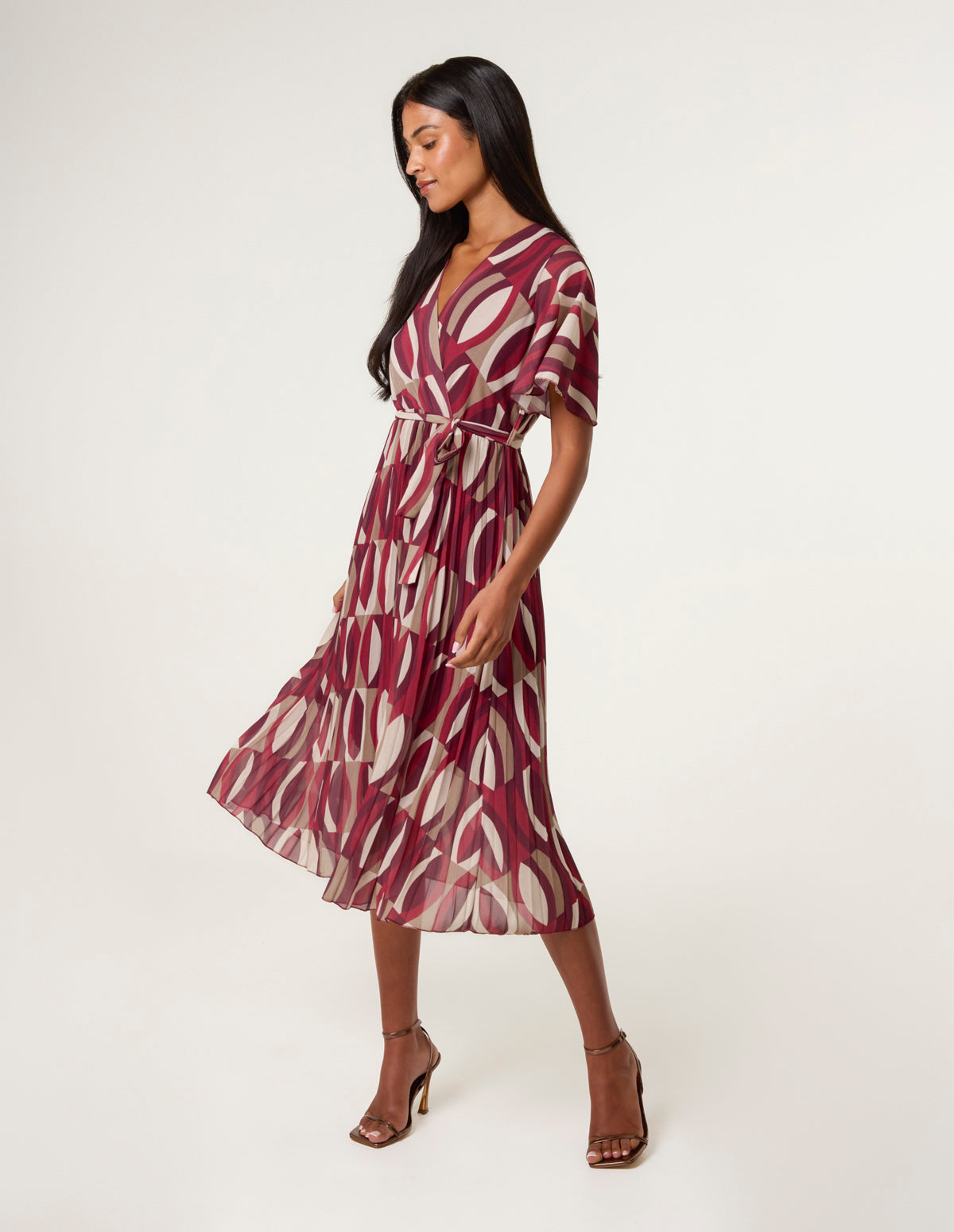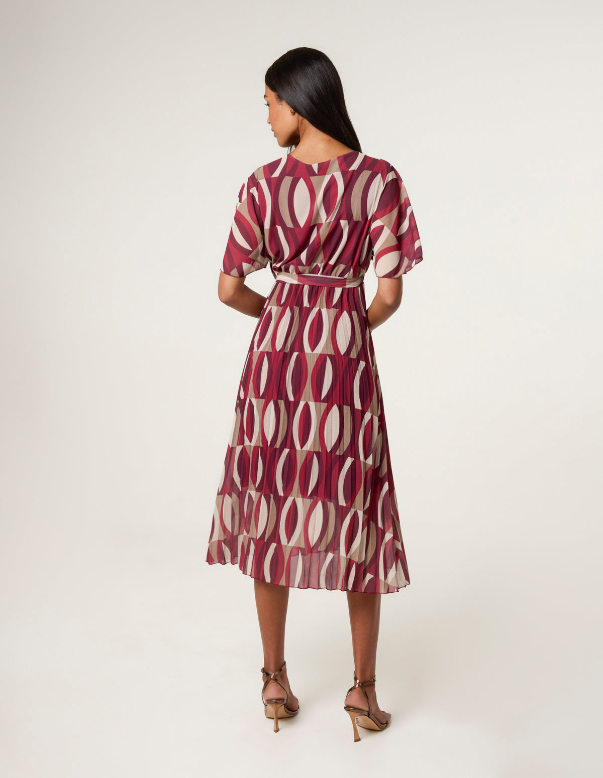 The chiffon texture combined with the crossover-style silhouette make this deep burgundy geometric midi dress an extra elegant pick for evenings out.