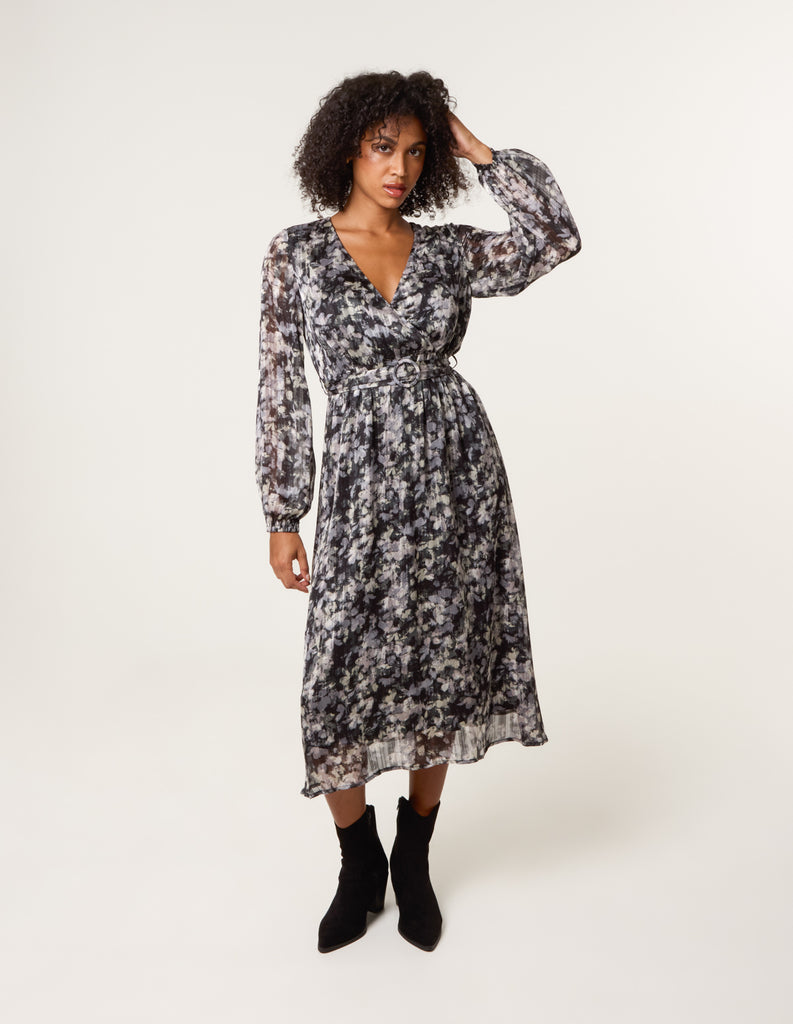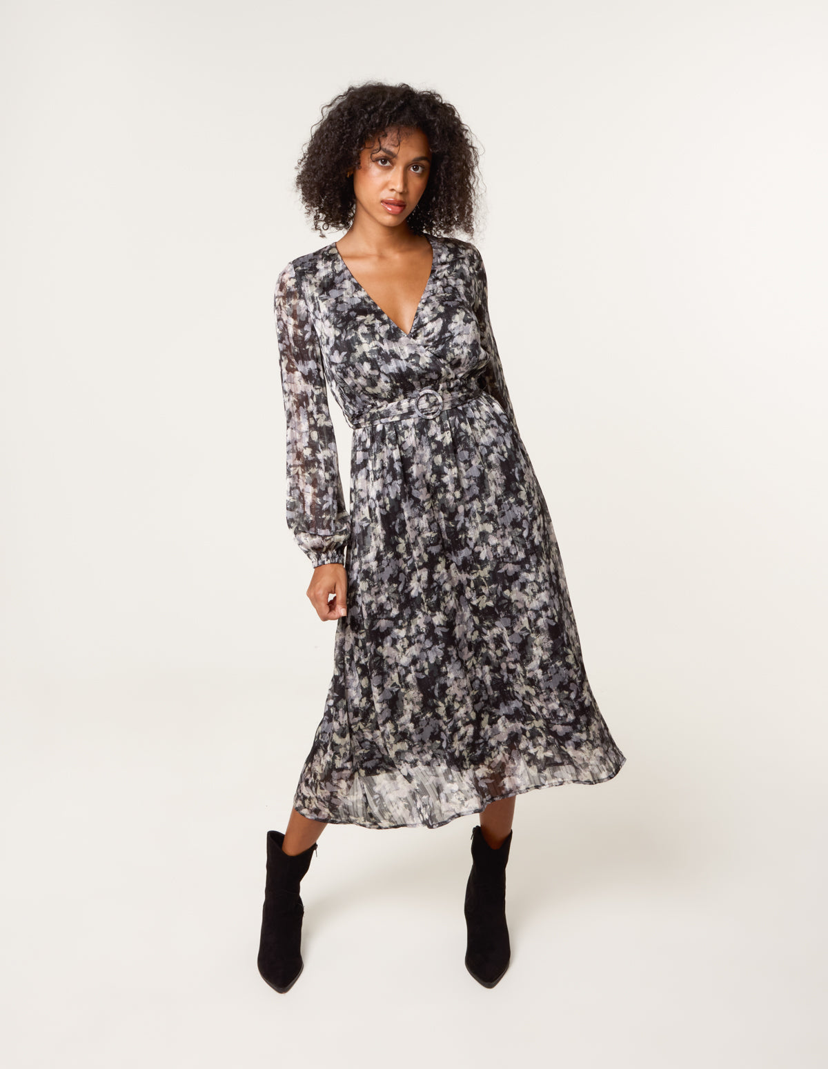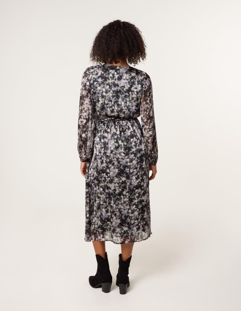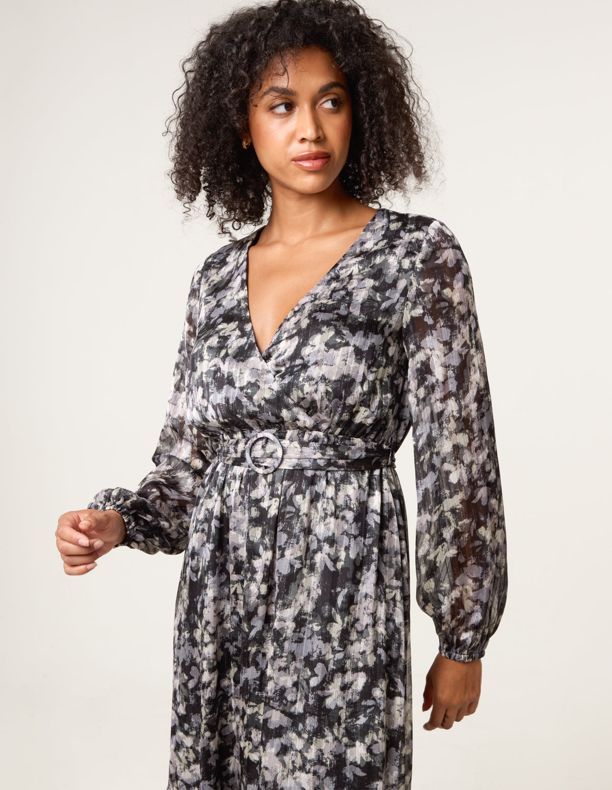 Make a statement at your next special occasion with this printed lurex midi dress. Team with a matching silver clutch and heels.