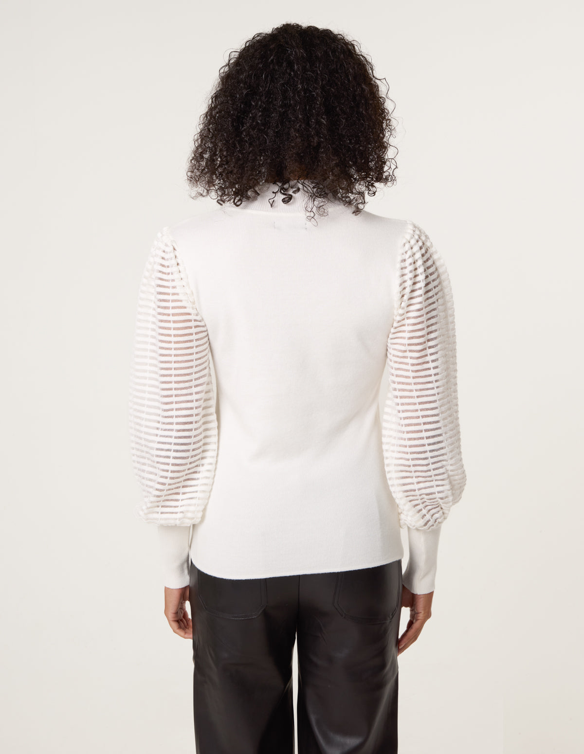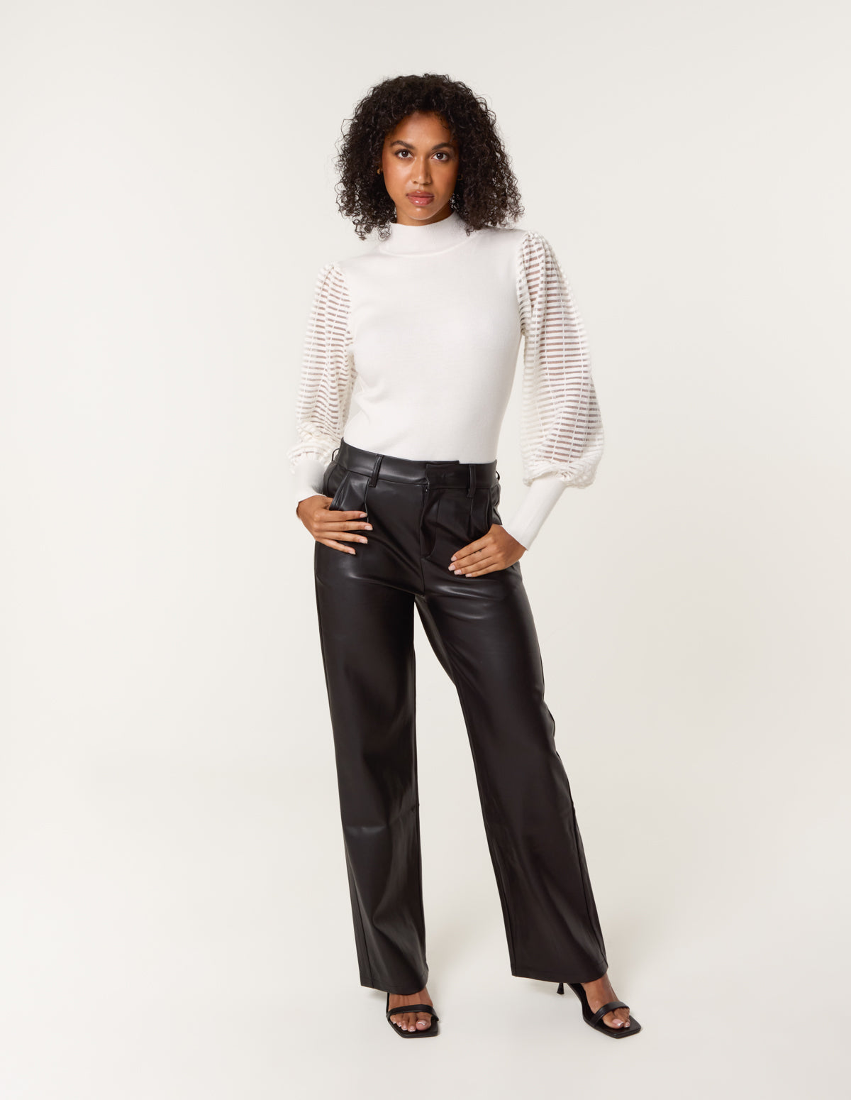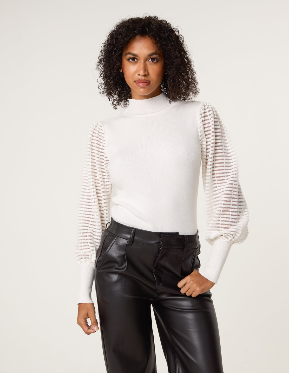 Cut to a flattering fit, this pretty evening jumper with sheer detailed sleeves looks drop dead gorgeous when teamed with PU leggings, ankle boots and a faux fur coat.