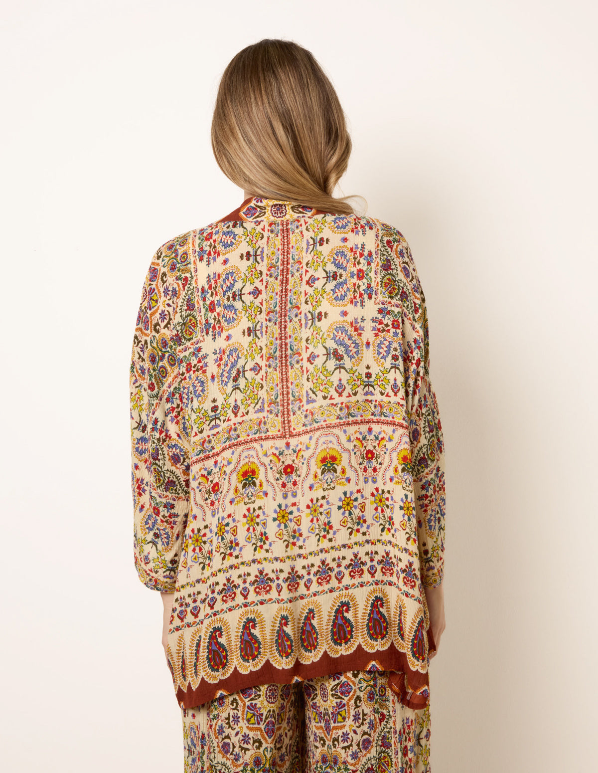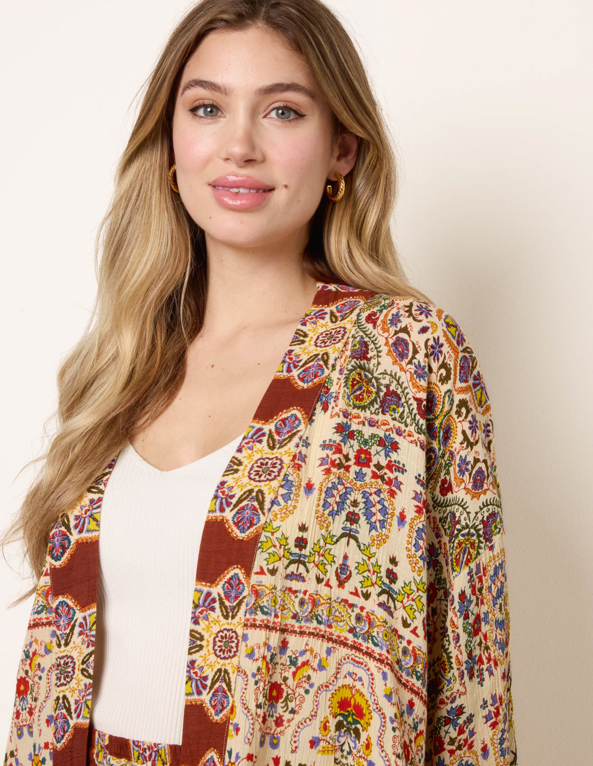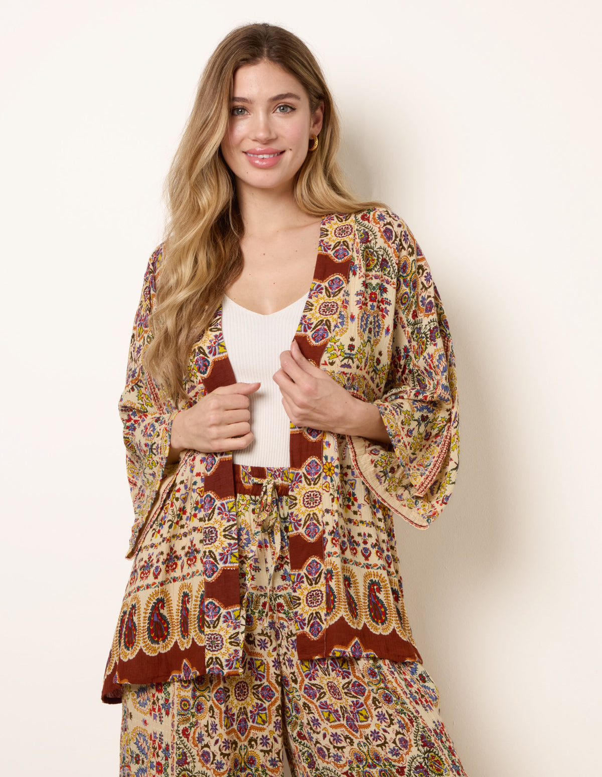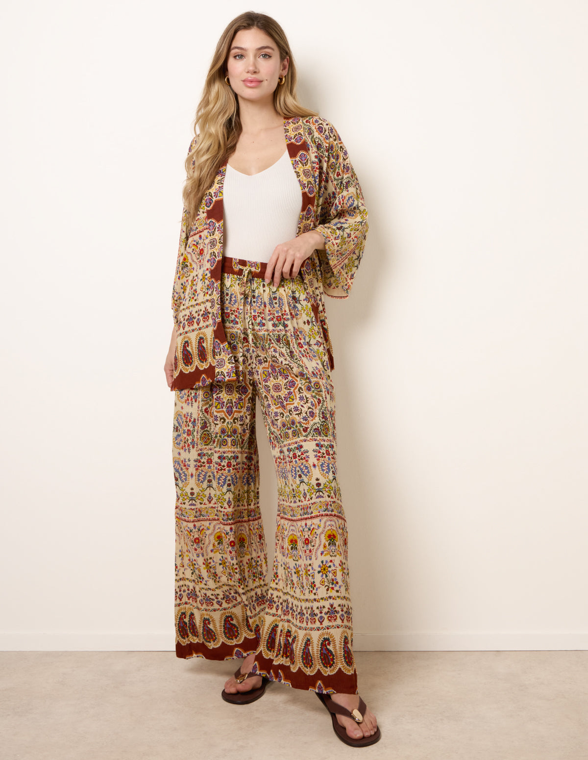 The perfect mix of vibrant colours and unique patterns, this kimono is the perfect layering piece for the summer. Team with our matching top and trousers to finish off the look