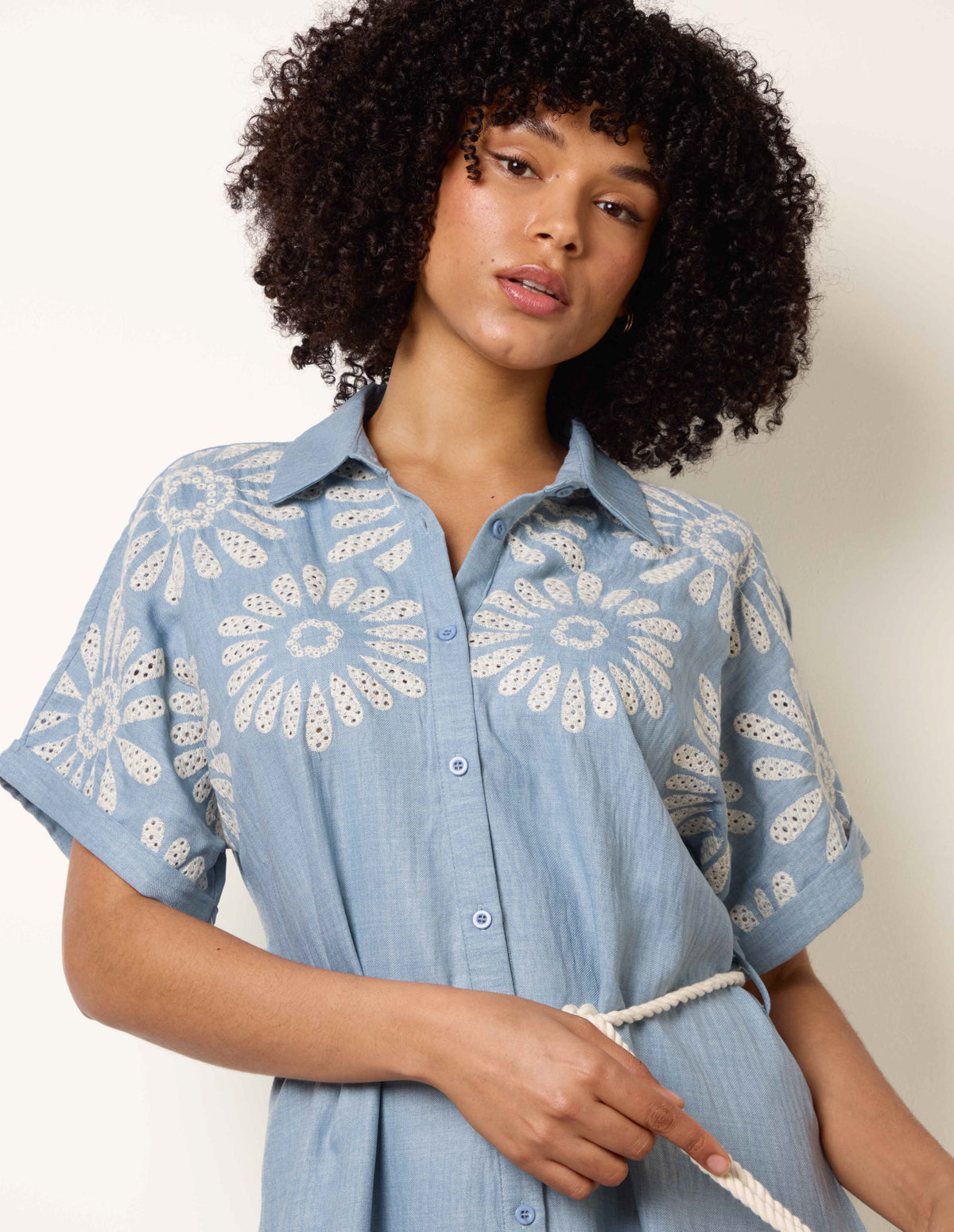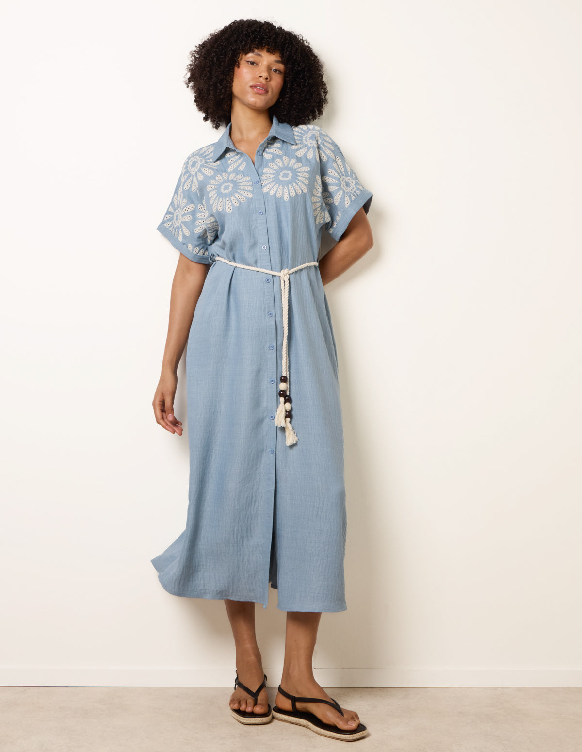 Featuring beautiful embroidery for a distinctive summertime look. Team this oversized shirt dress with woven sandals.
