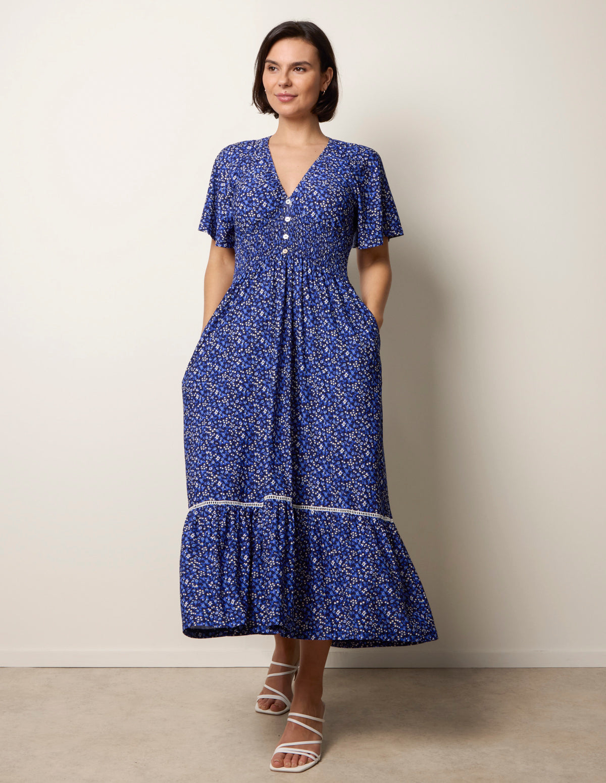 A powerful printed, shirred waist dress that makes a statement seeing you through every season.