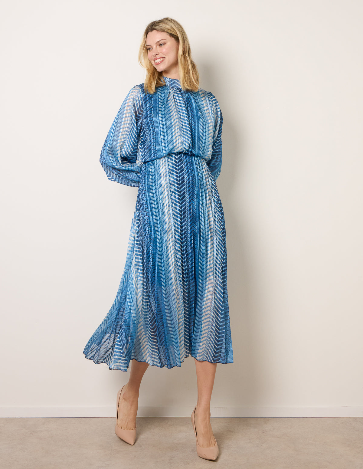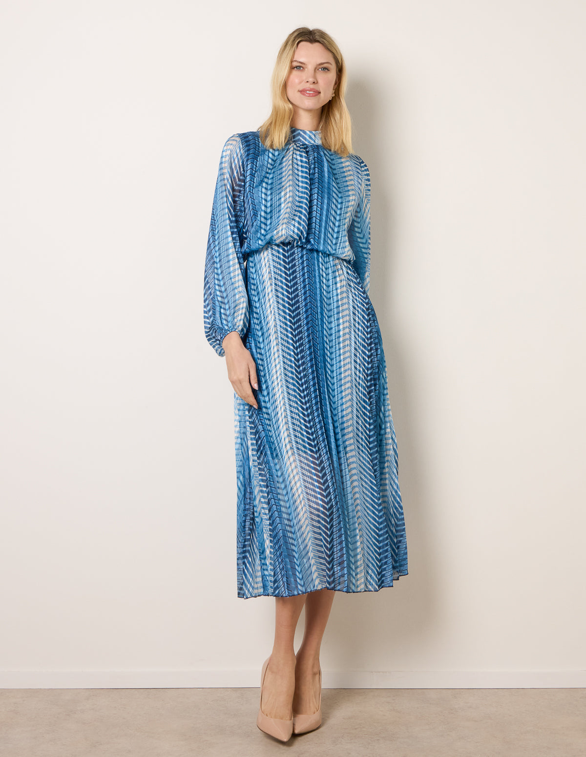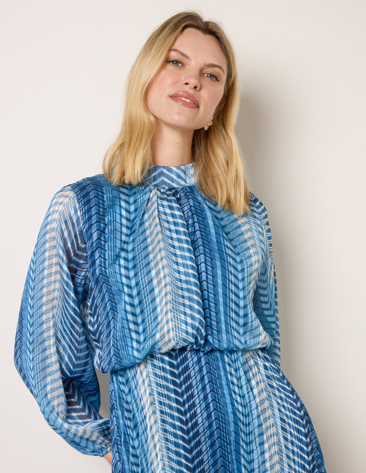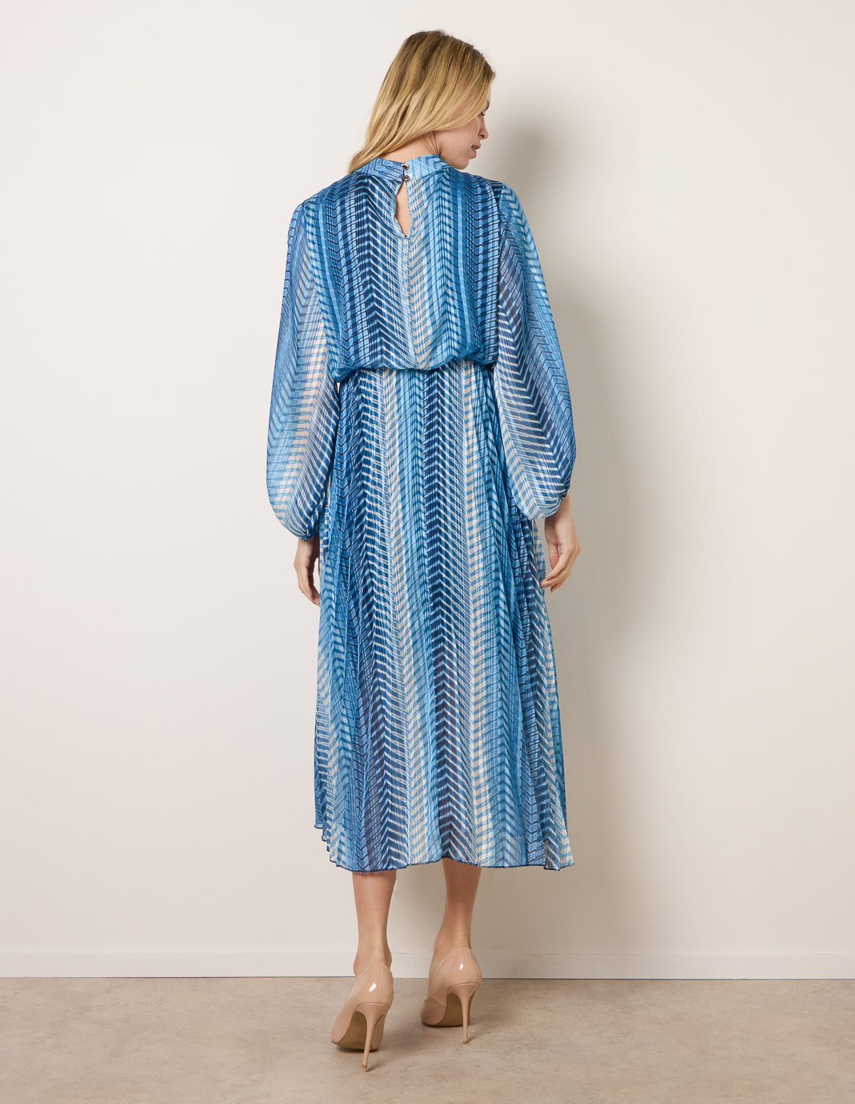 Zig Zag Metallic High Neck Puffball Pleated Dress