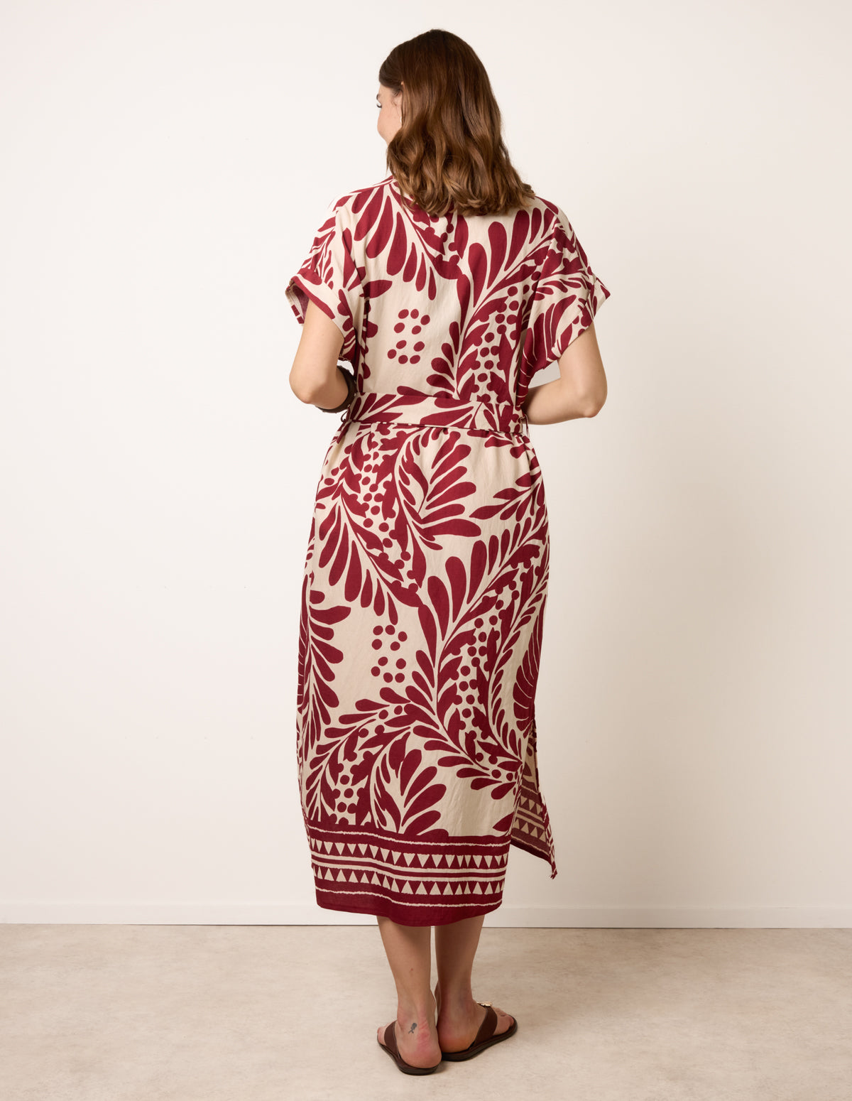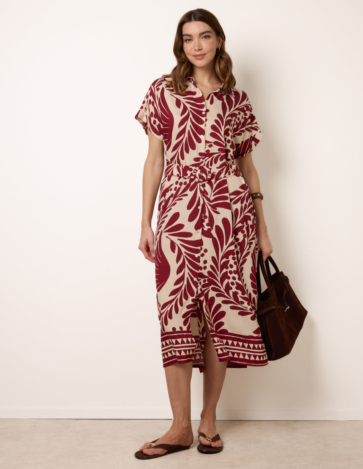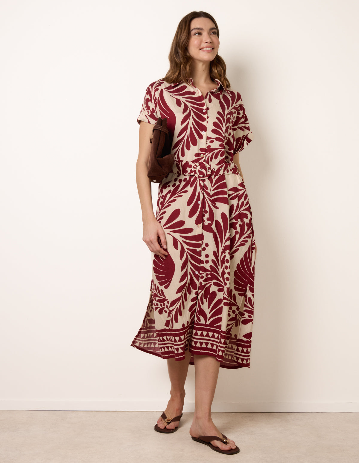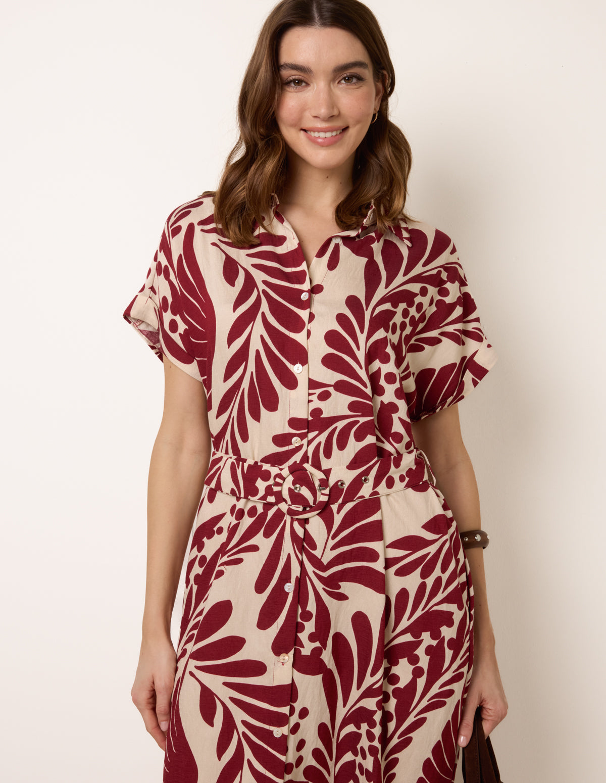 Tropical Leaf Print Belted Shirt Dress