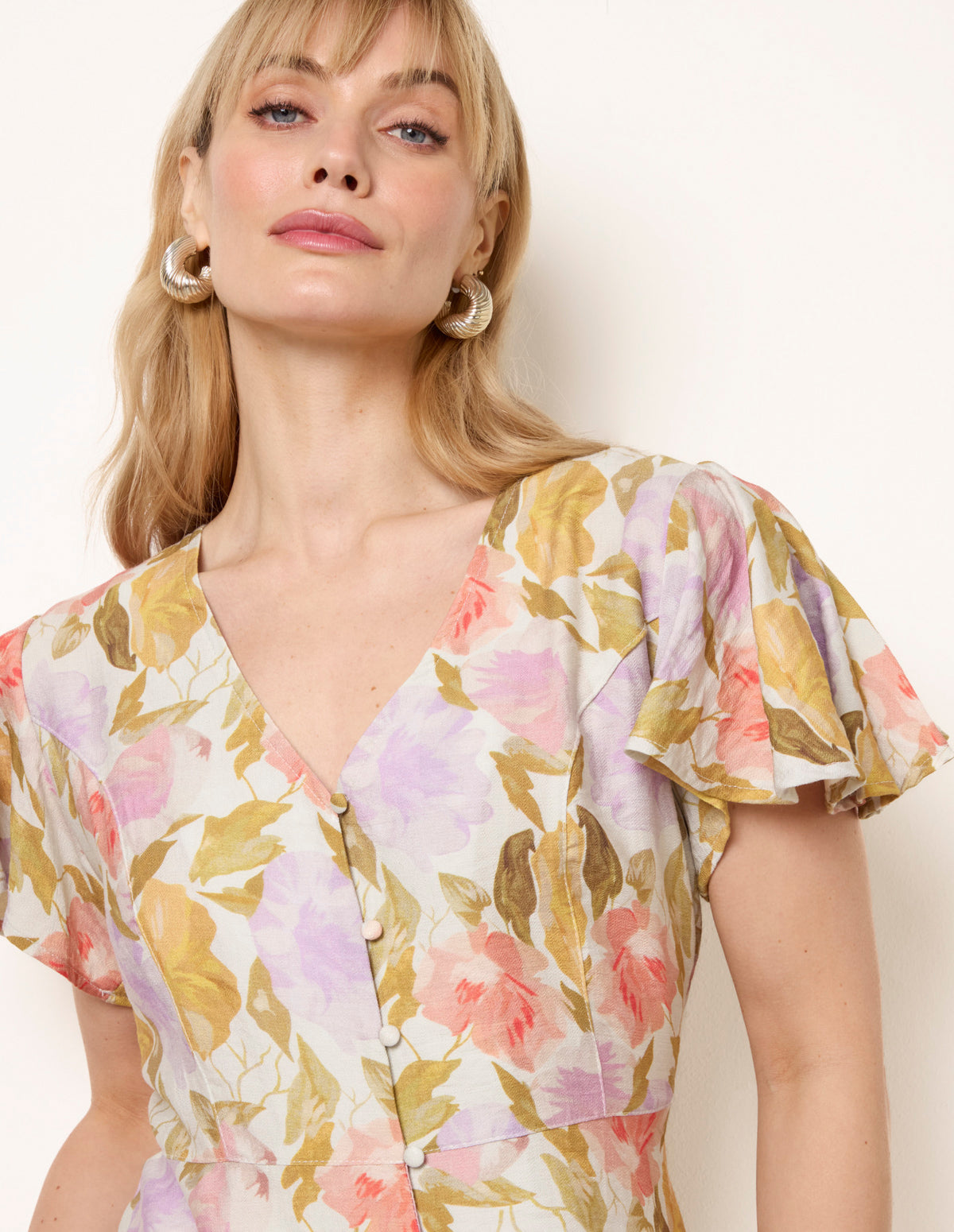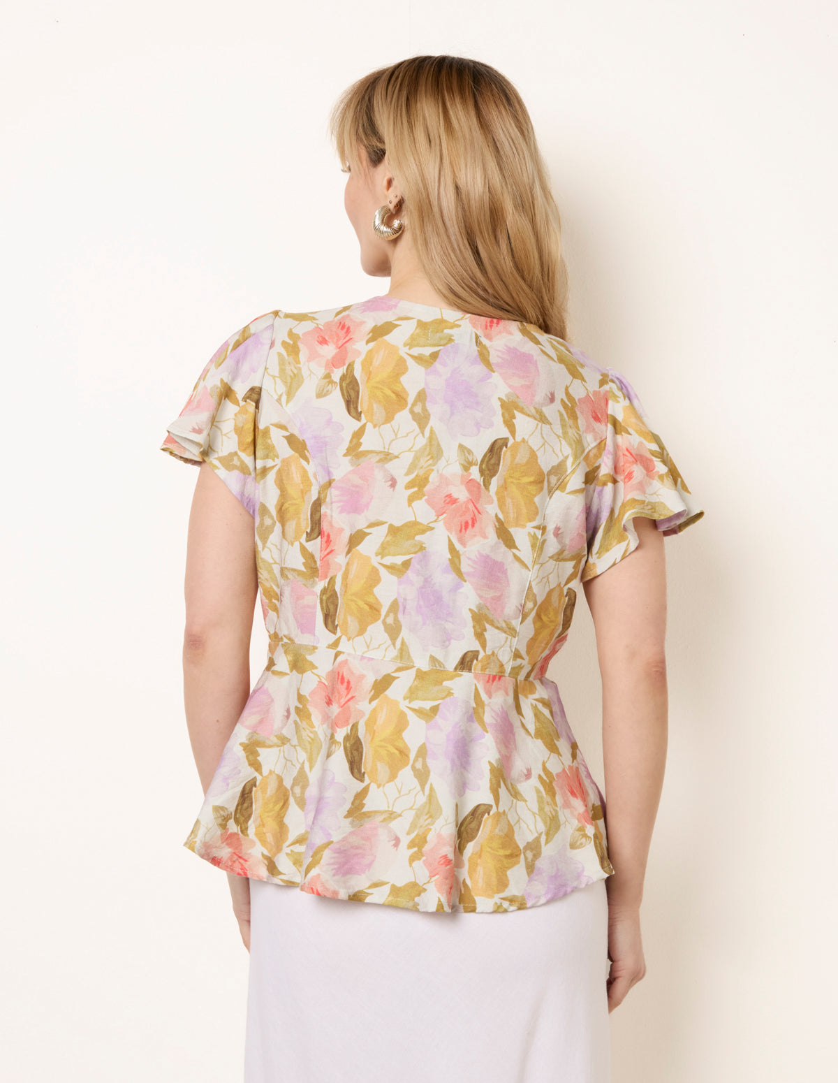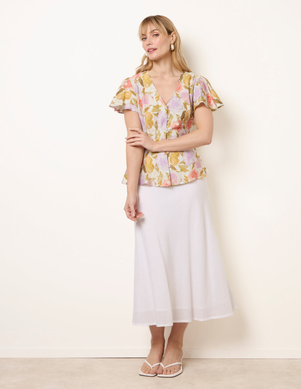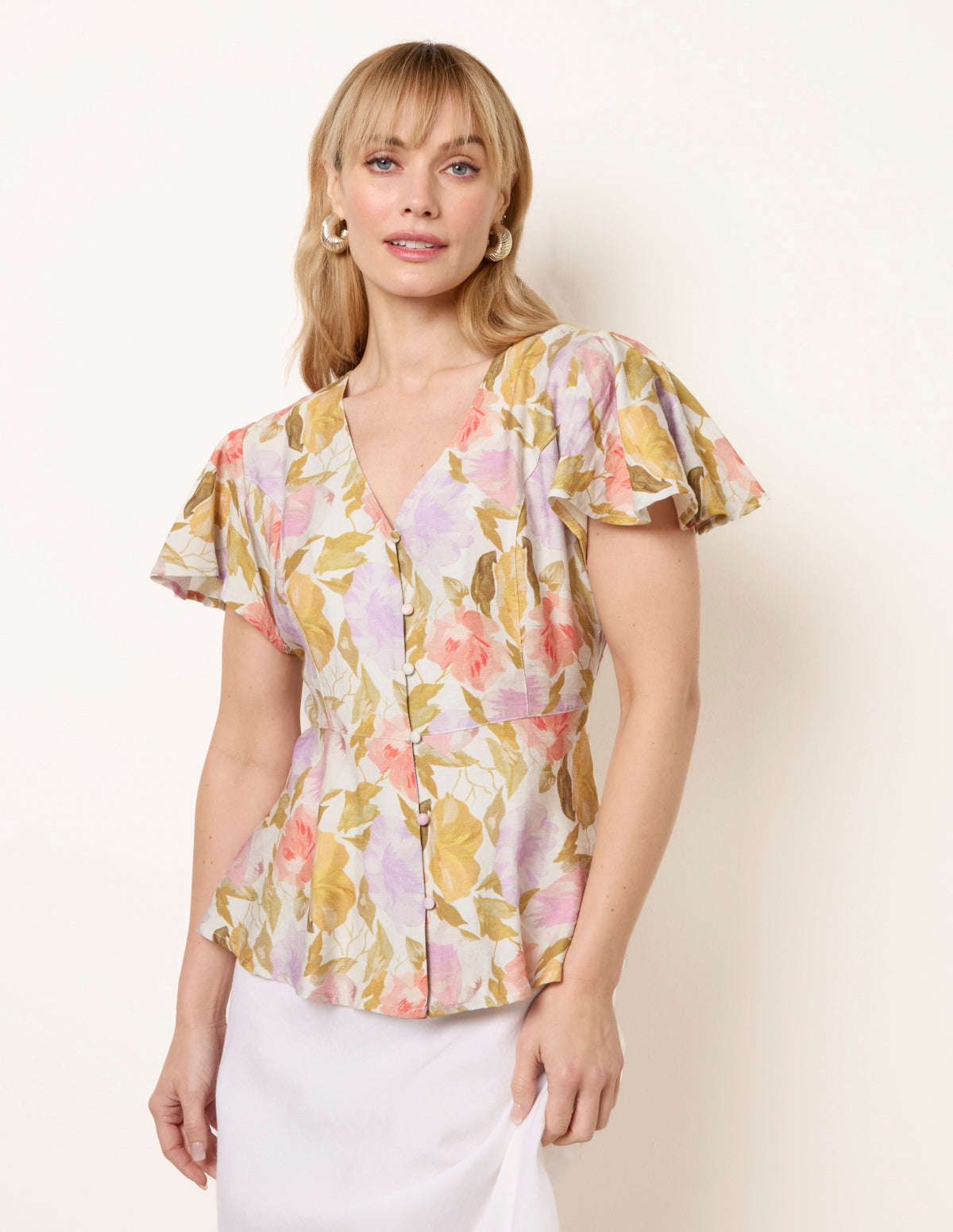This elegant buttonfront top is an effortless styling staple for smart-casual looks. Its peplum hem makes it perfect for pairing with off white chino trousers and sandals.