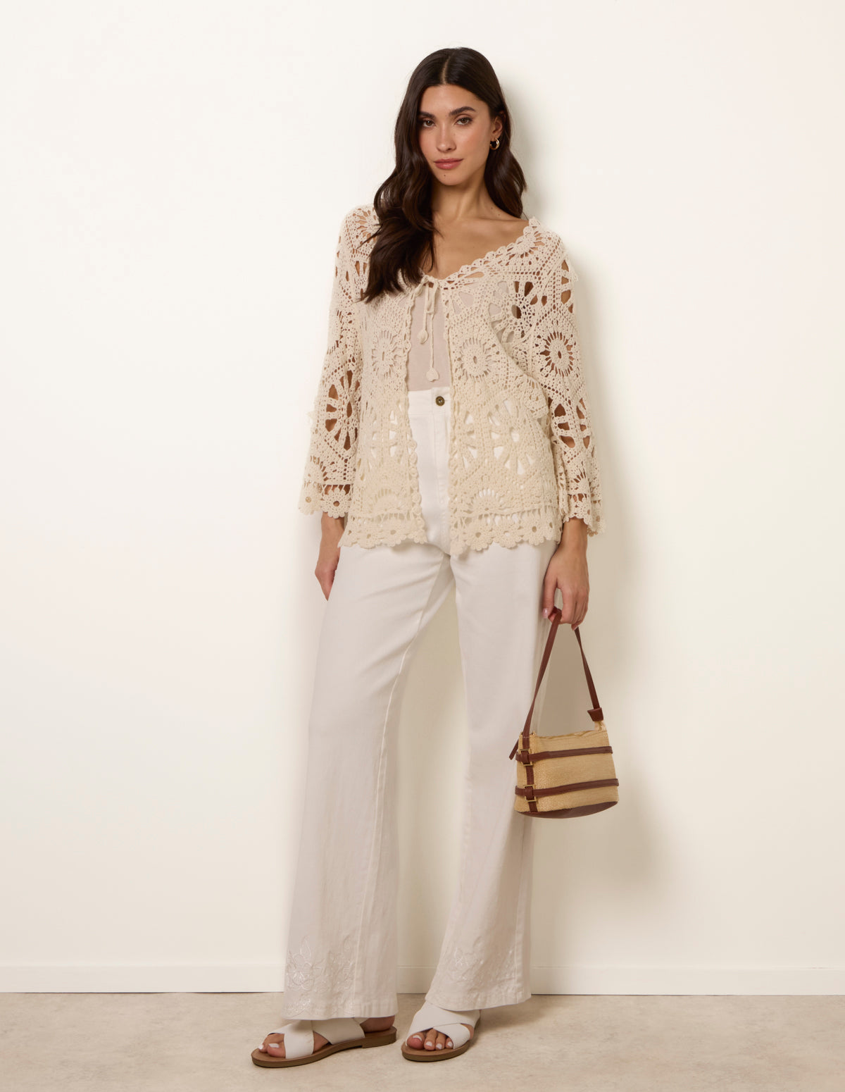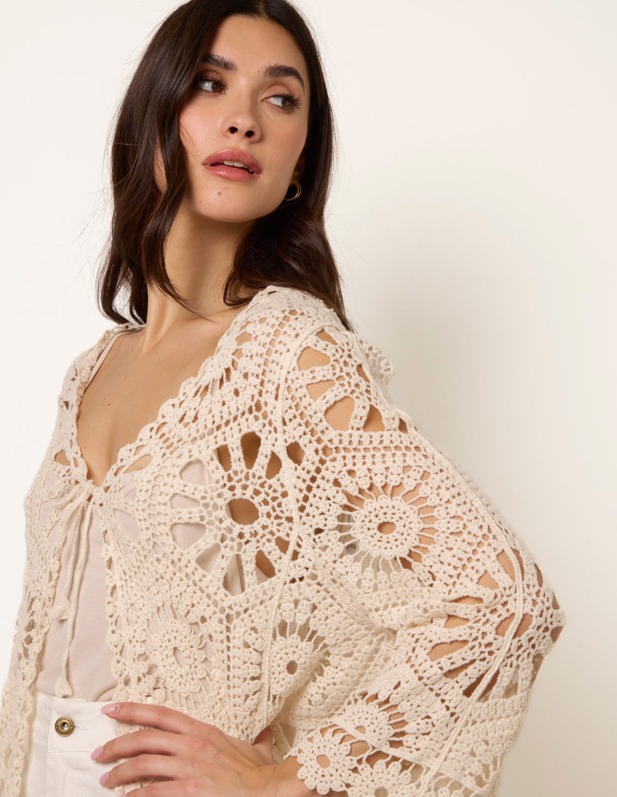 A bohemian take on this crochet cardigan, style this piece over a tank top or a bikini to infuse bohemian textures into your look this Summer.