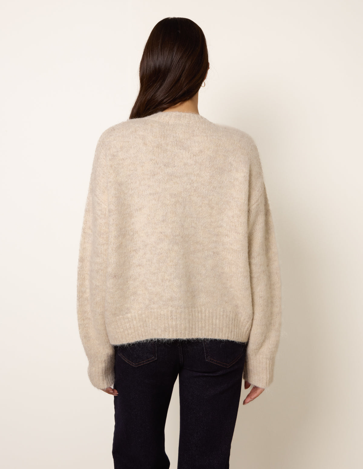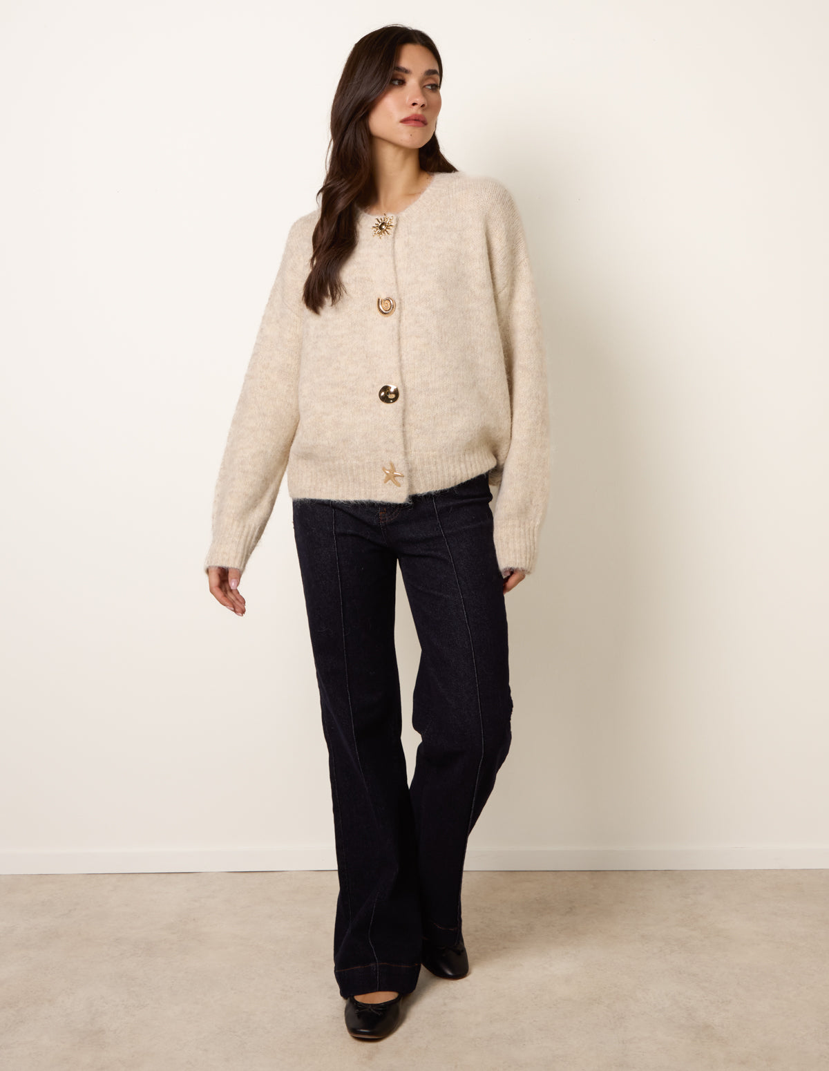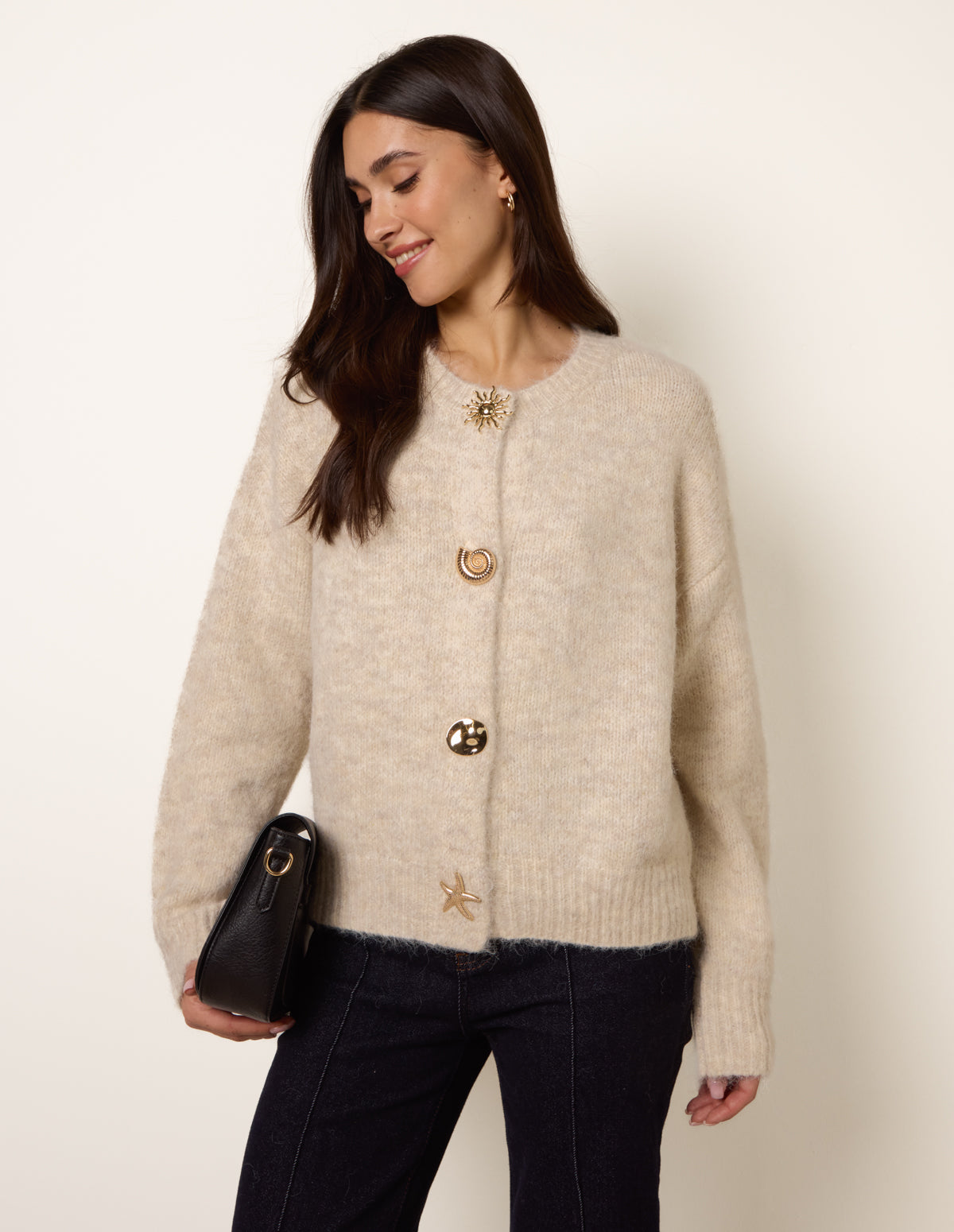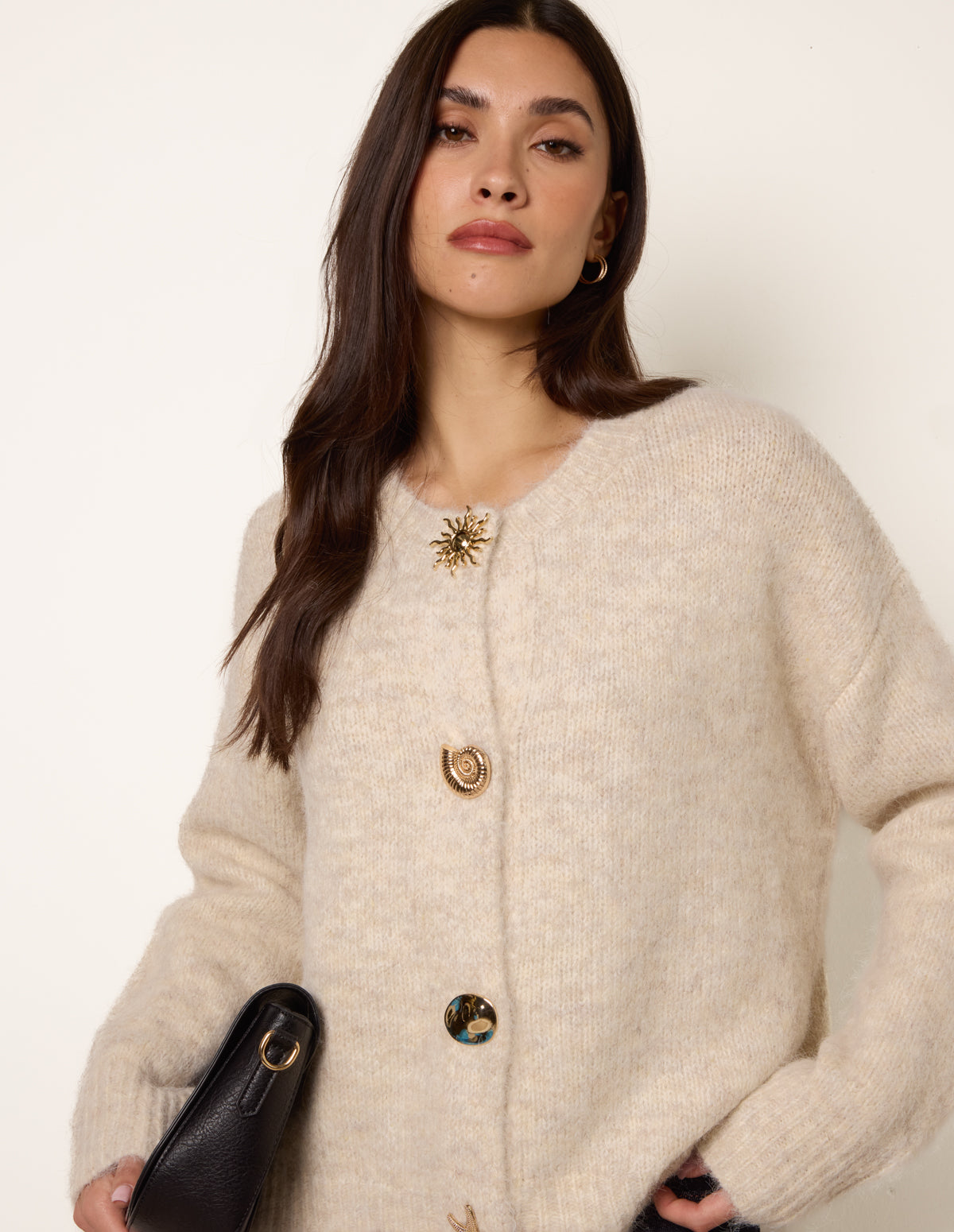 Soft and pretty crew neck cardigan with large buttons. Pair with jeans for weekend vibes.