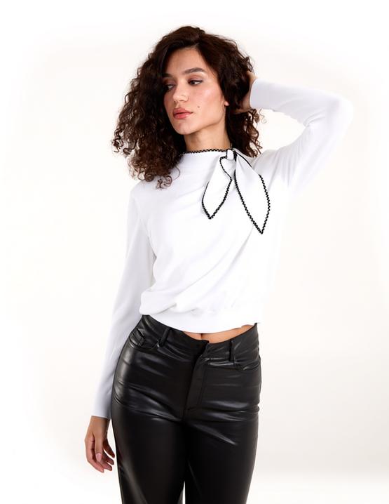 This bow jumper will take you from day-to-night with a romantic touch. Team with PU trousers and court heels.