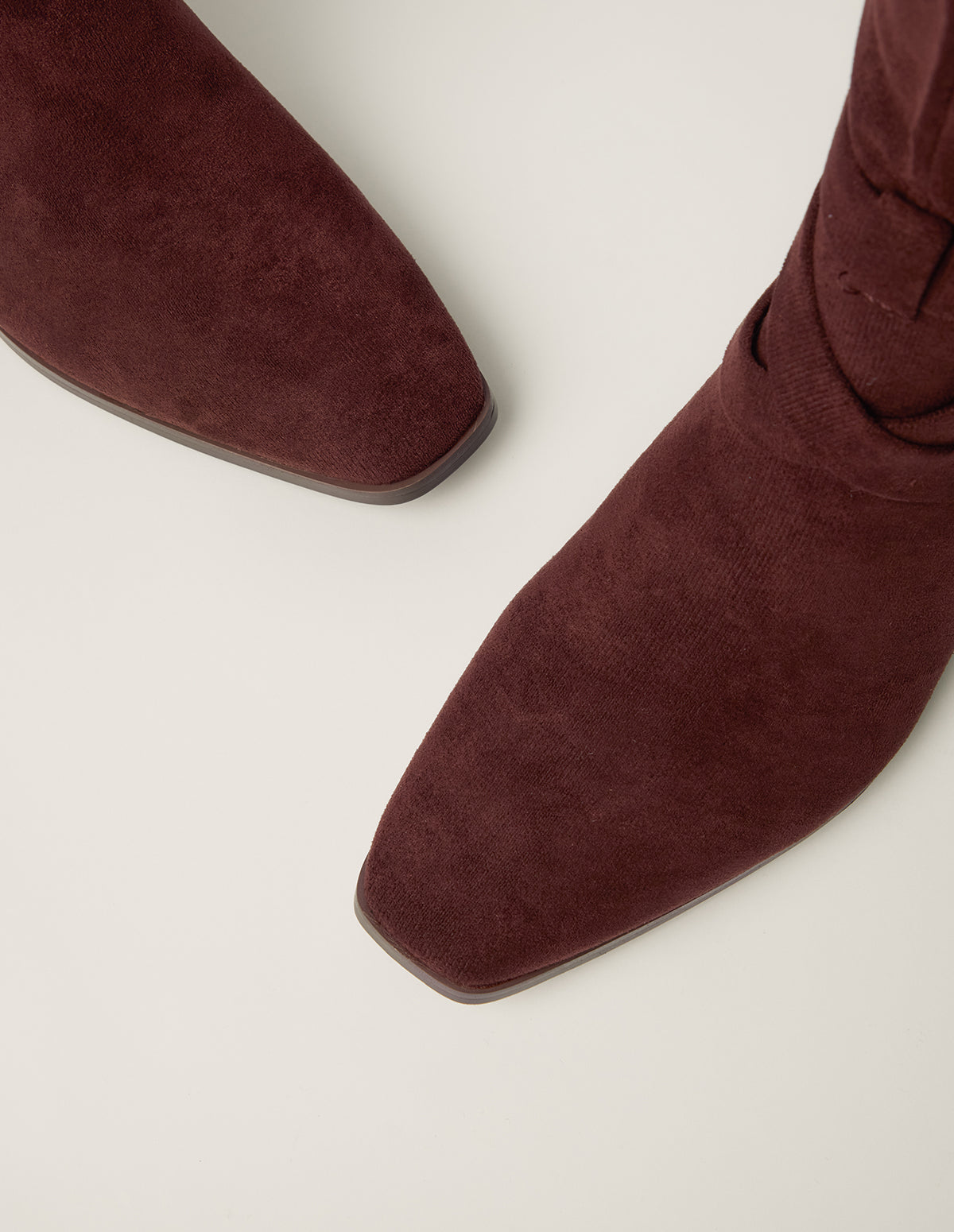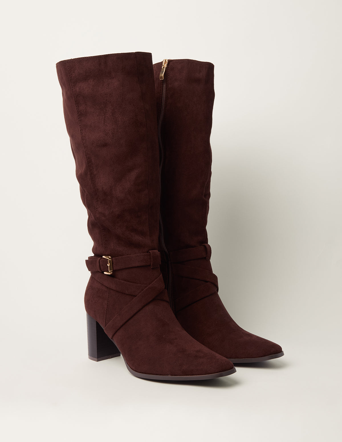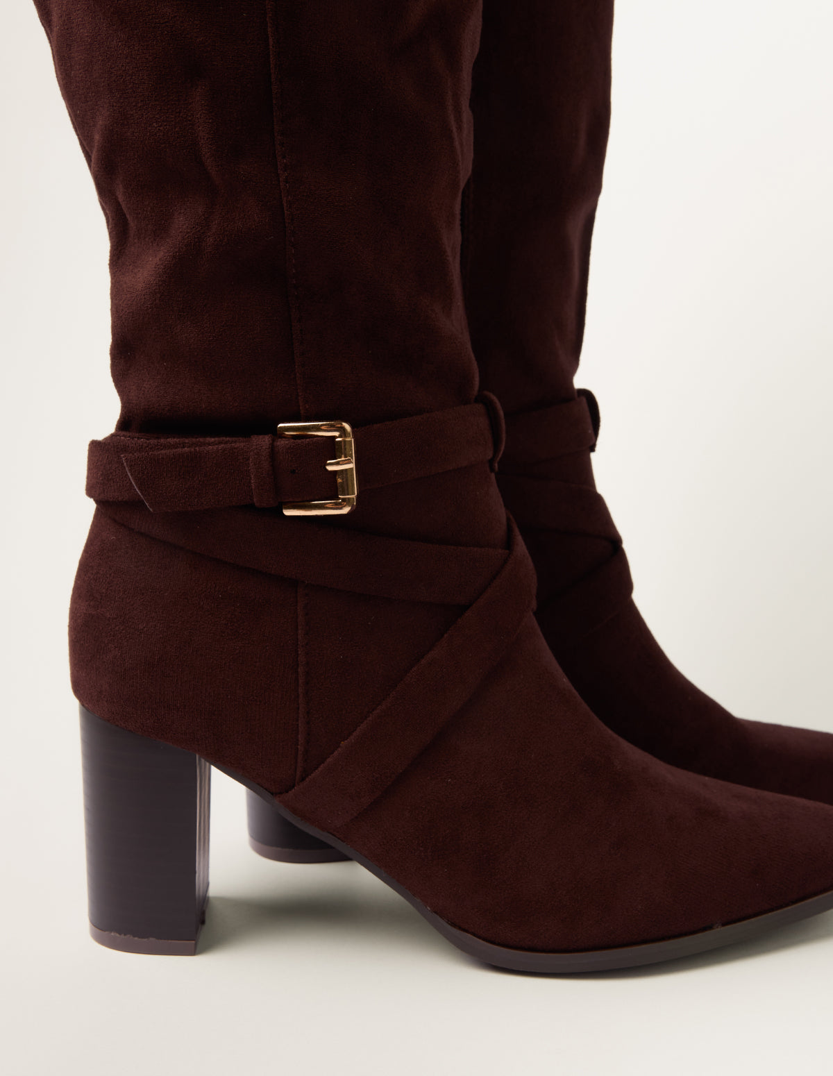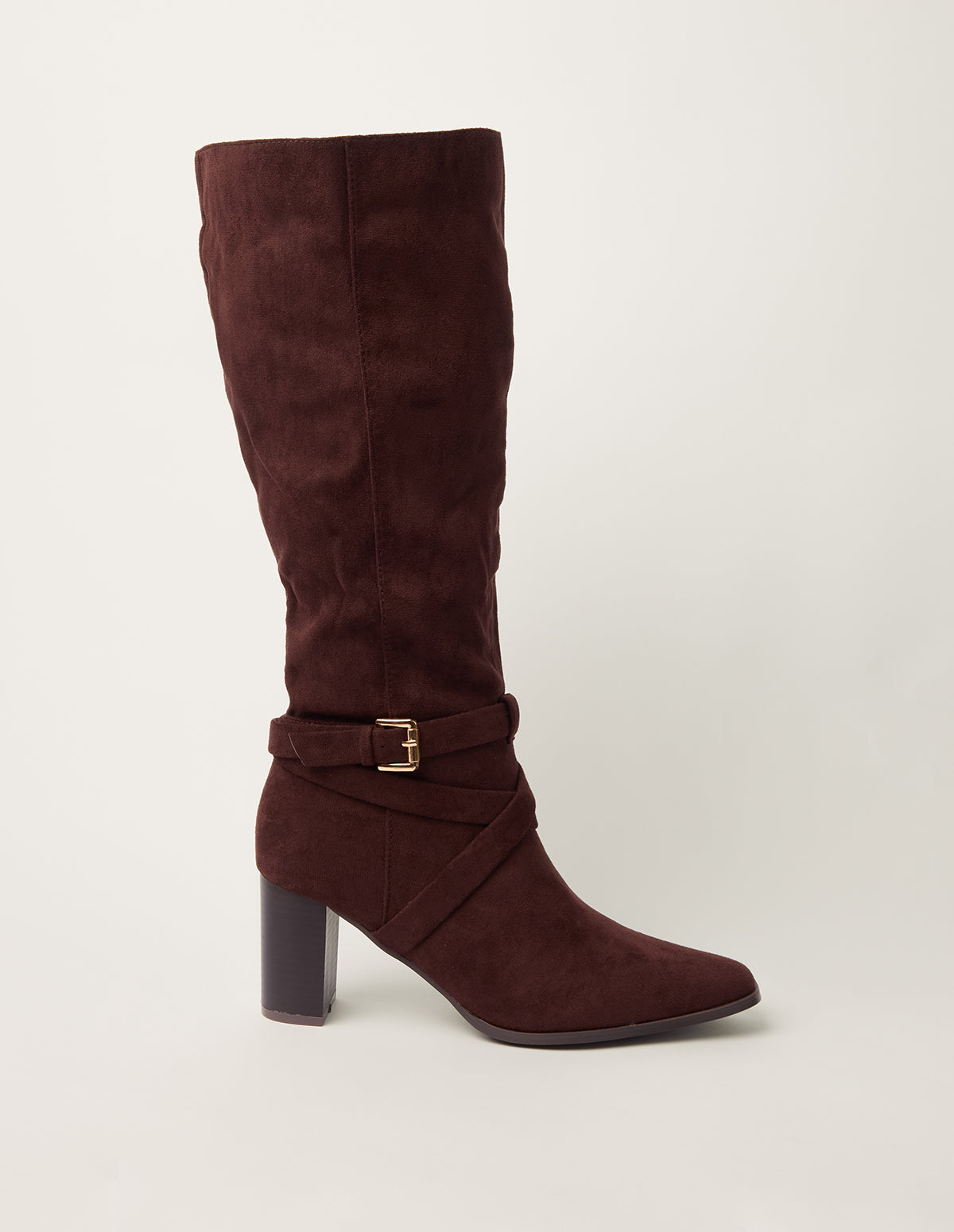 Small heeled suedette buckled knee high boots that provide nothing but comfort and style all season long. Team these with jeans and an oversized blazer.