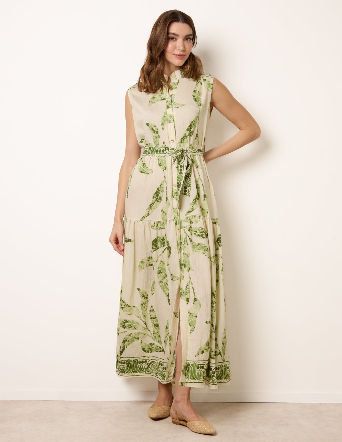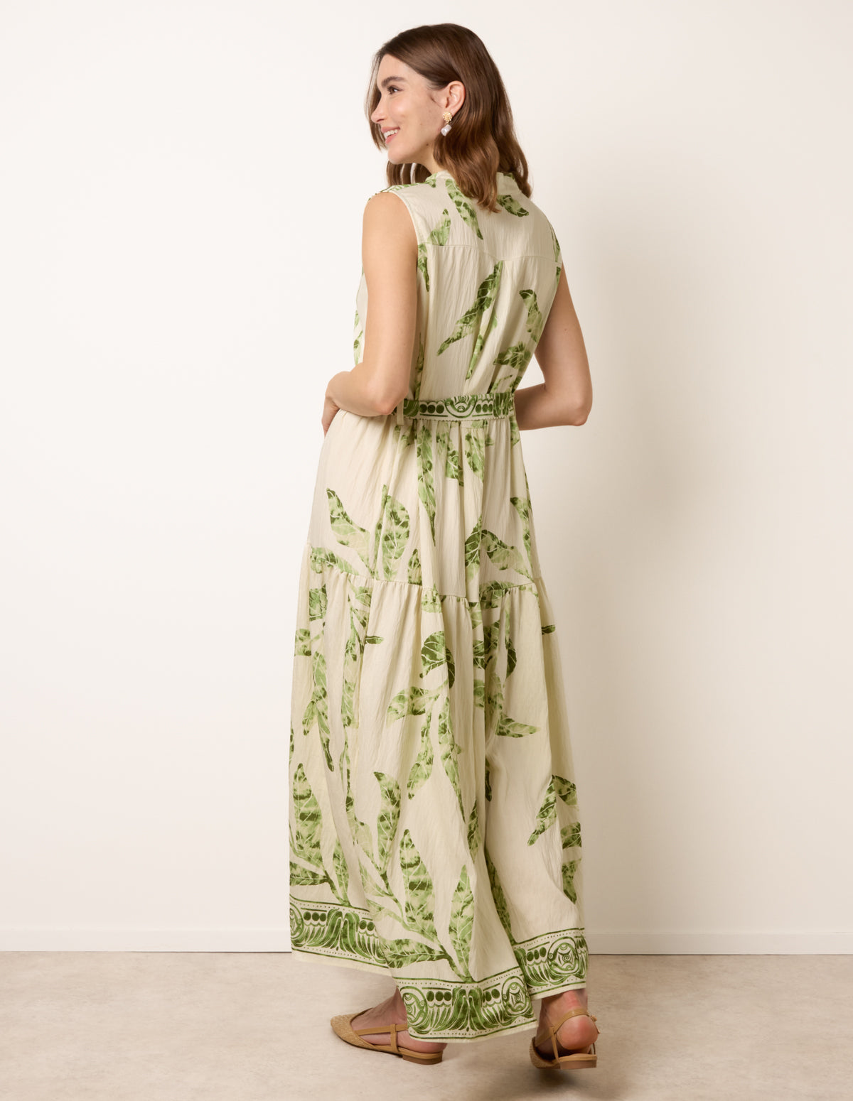 A vacation essential this linen dress is defined by an eye-catching tribal palm tree print. Team with woven sandals for the perfect summertime look.