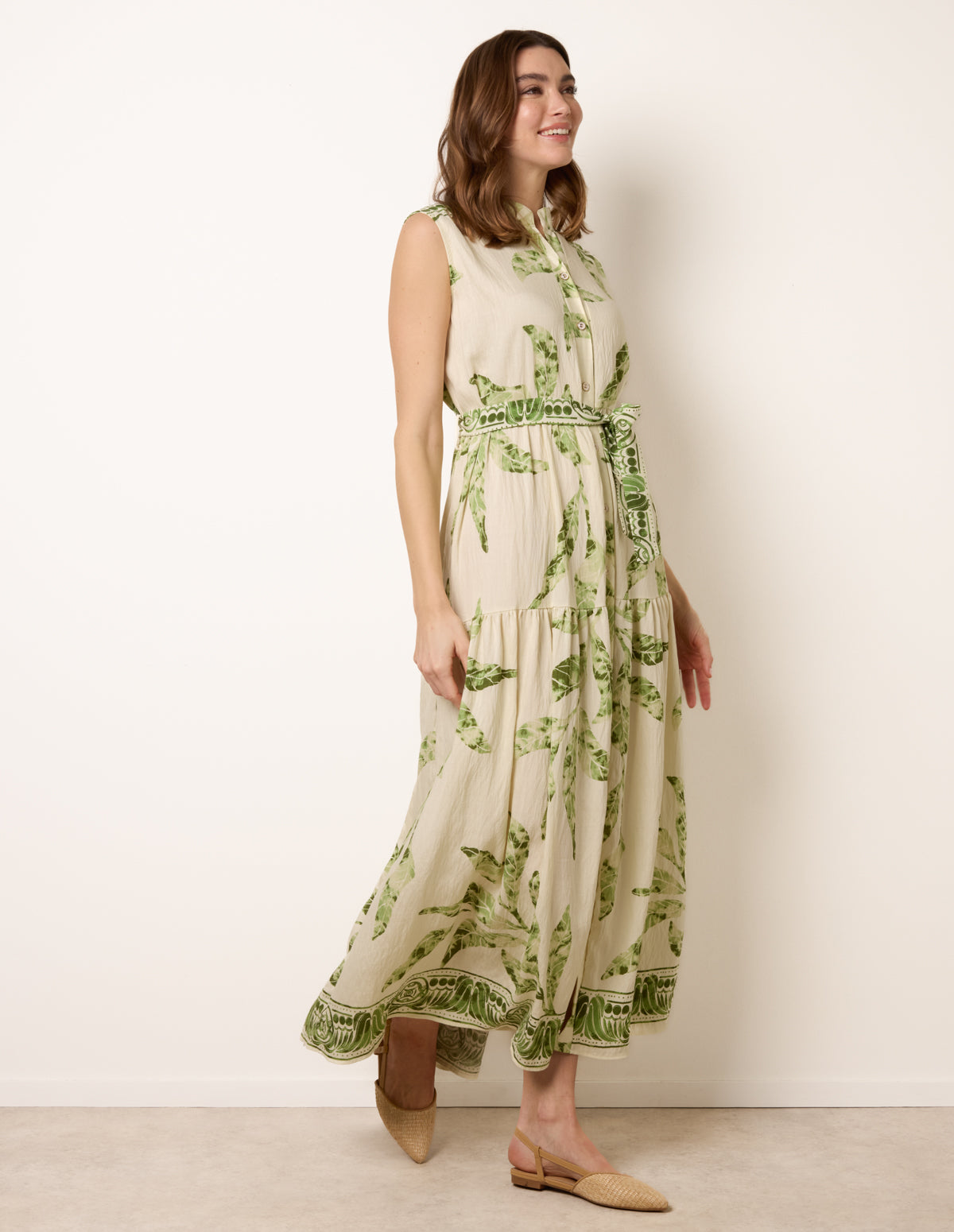 Leaf Print Collarless Shirt Dress With Belted Waist