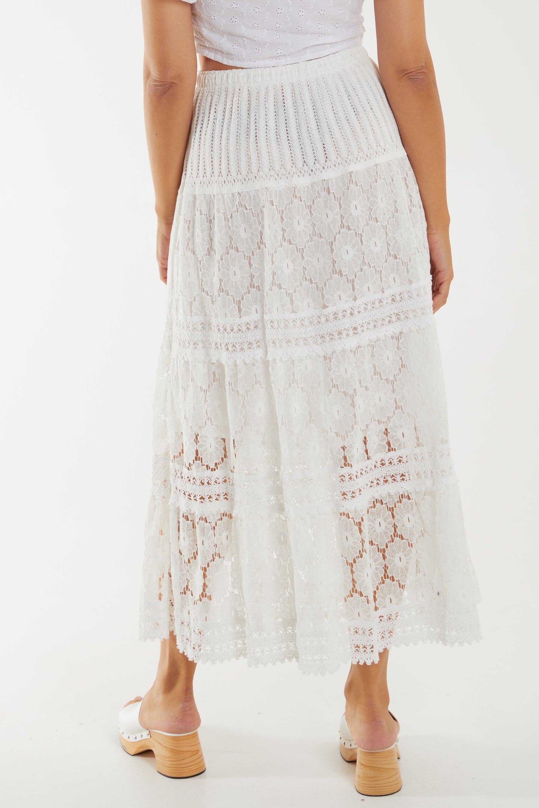 The maxi skirt every summer wardrobe needs! This flowy white lace maxi skirt is highlighted by crochet detailing trims. It sits comfortably with an elasticated waistband and will be a wardrobe winner each and every year.