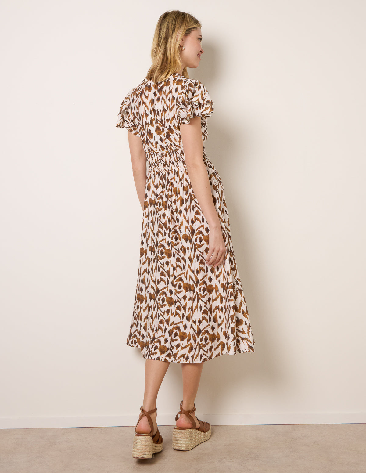 Quiet femininity is displayed in this printed, shirred waist, frill sleeve dress. Pack this away for your next summer holiday.