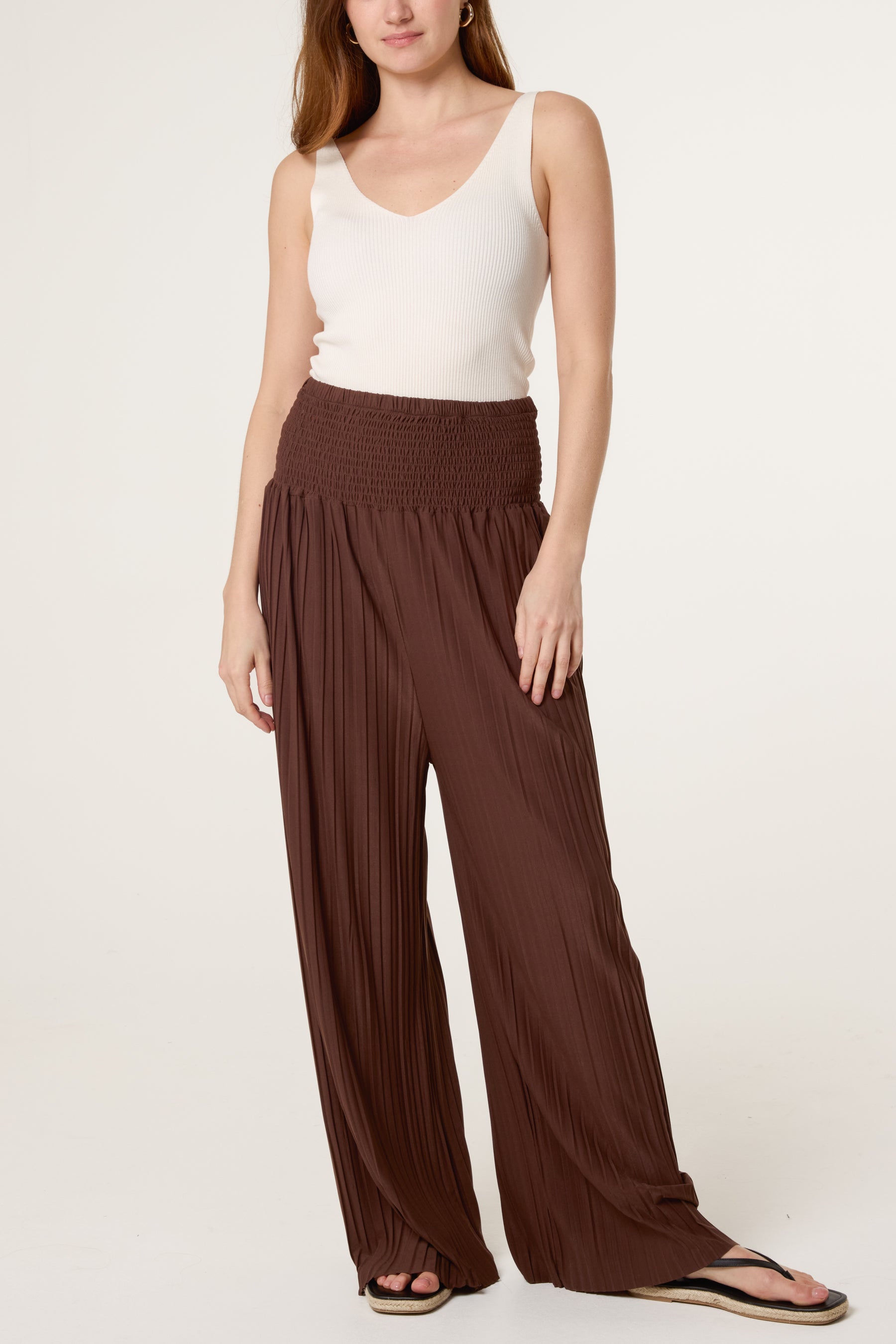 Shirred Waist Pleated Wide Leg Trousers