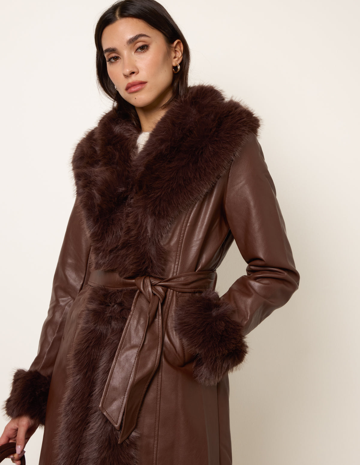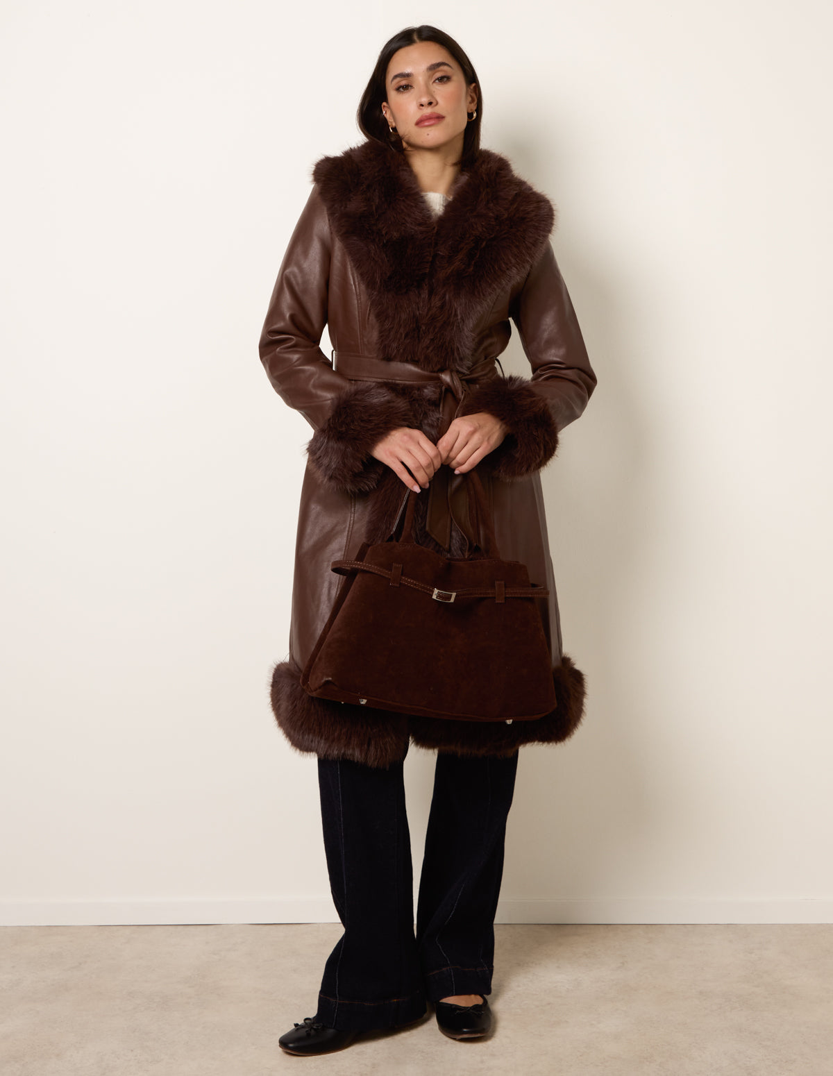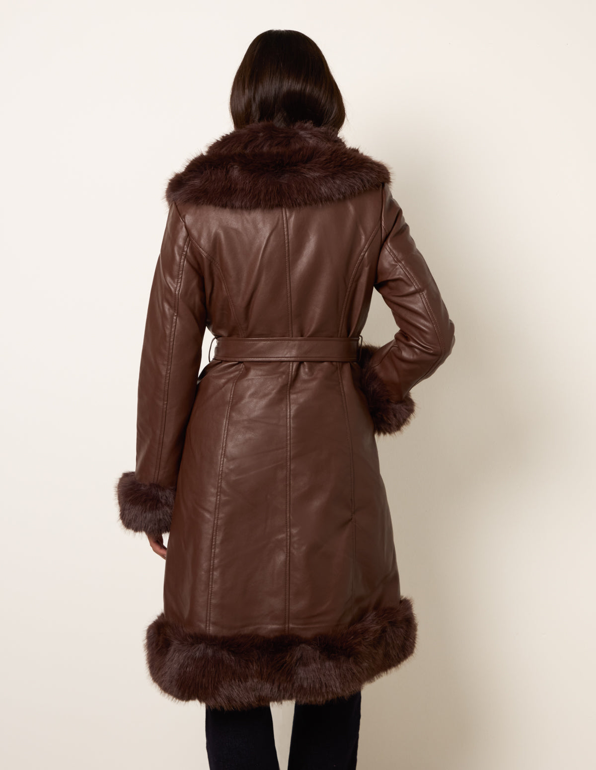 A stunning trimmed faux fur coat with a waist belt for a personalised fit. This coat will provide all the glam you need all season long.