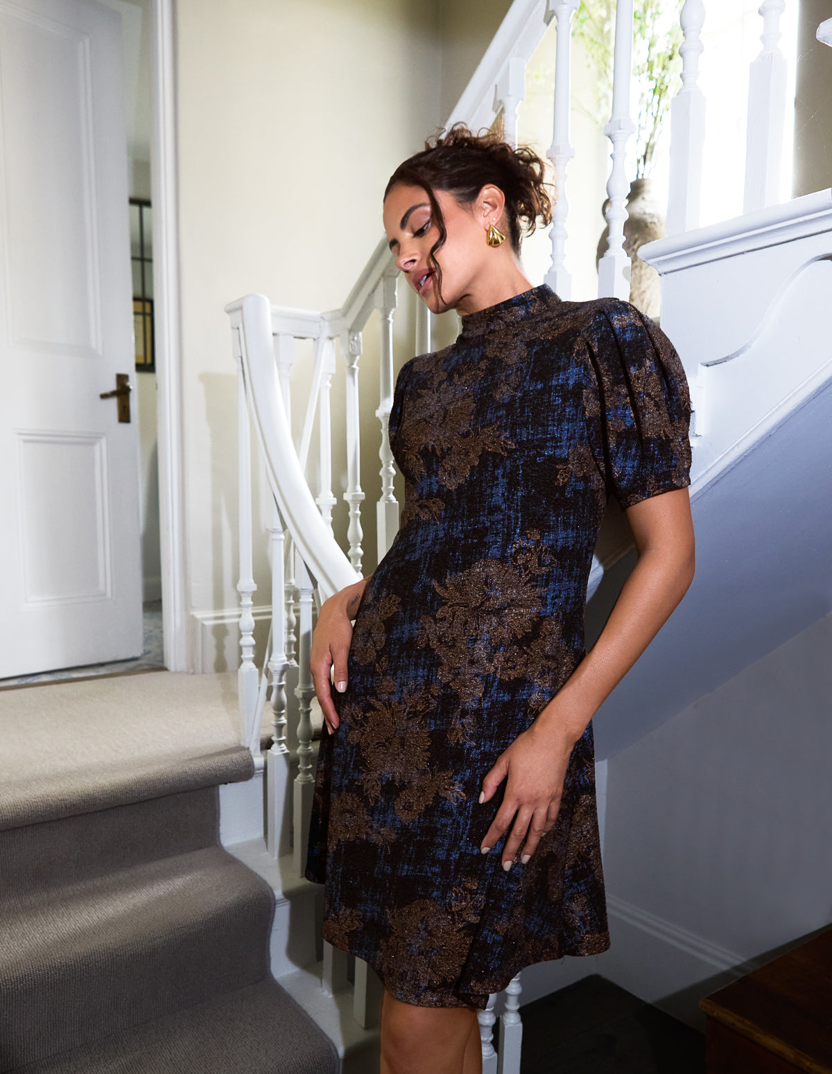 A cute, fun option to play around with this season. With it's metallic printed effect team this swing puff sleeve dress with a bronze bag and strappy heels.