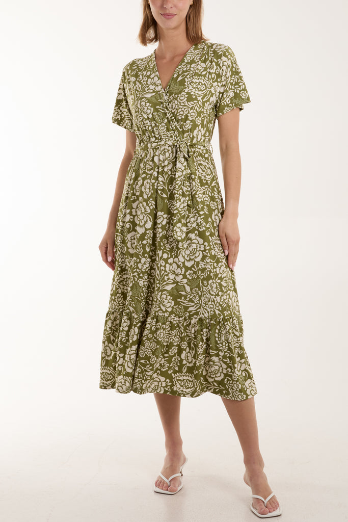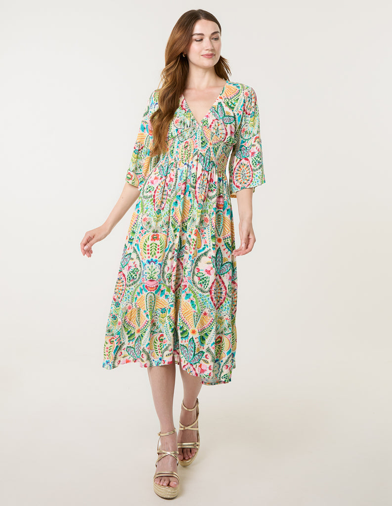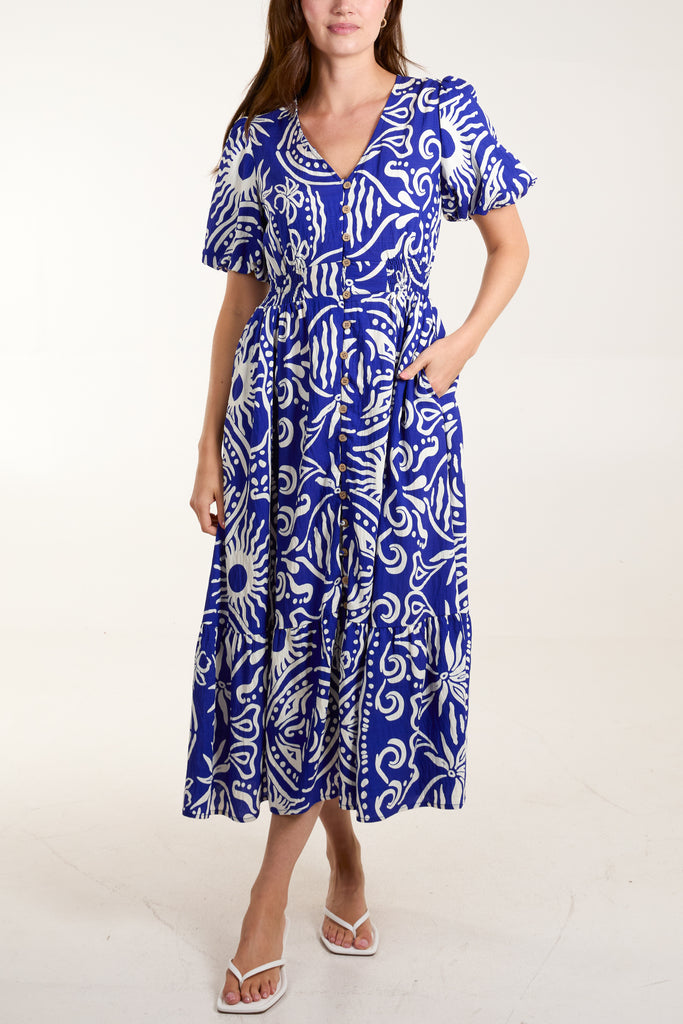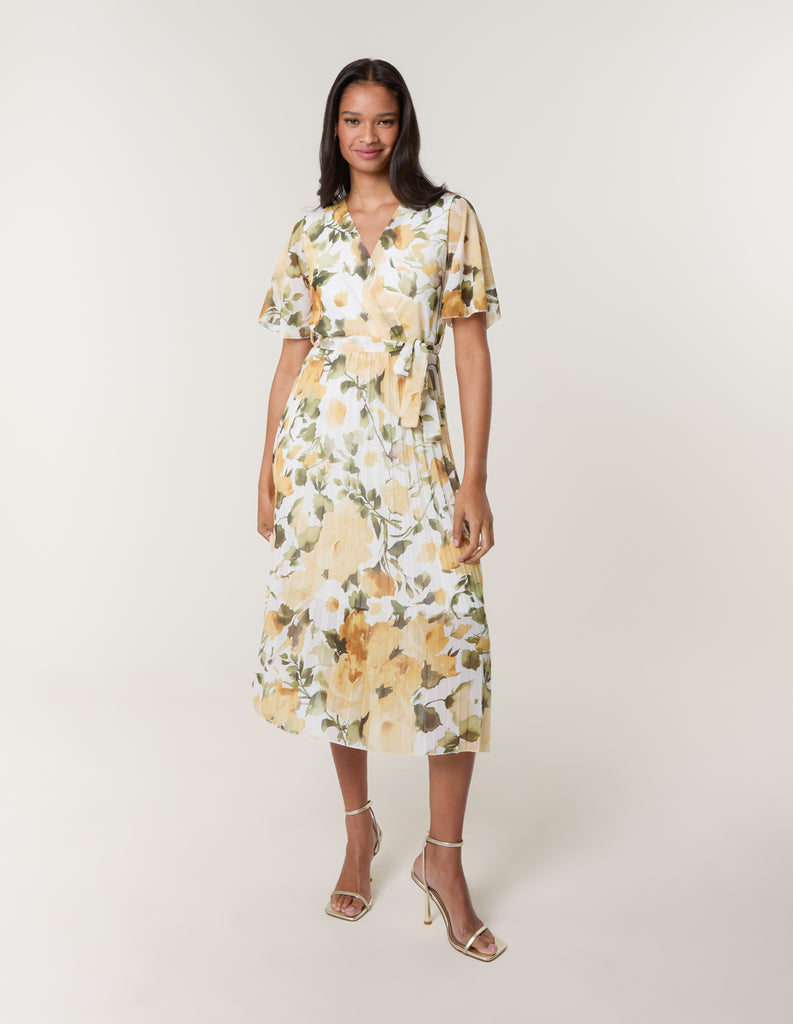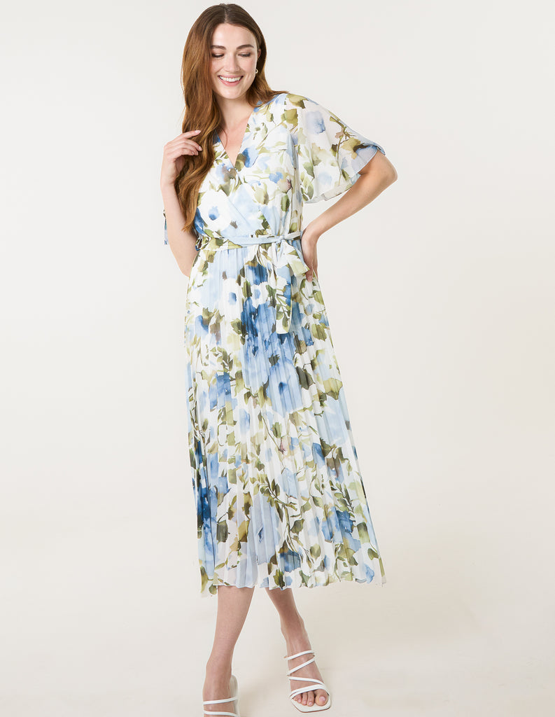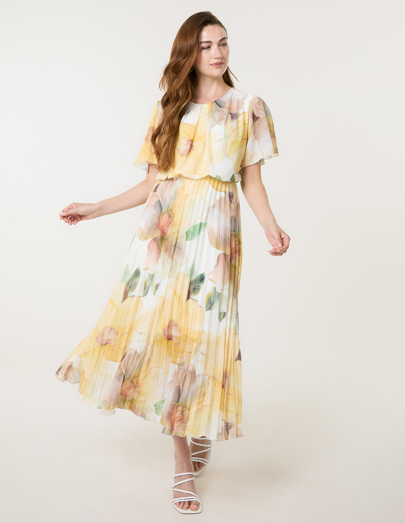 High Neck Floral Puffball Pleated Midi Dress
