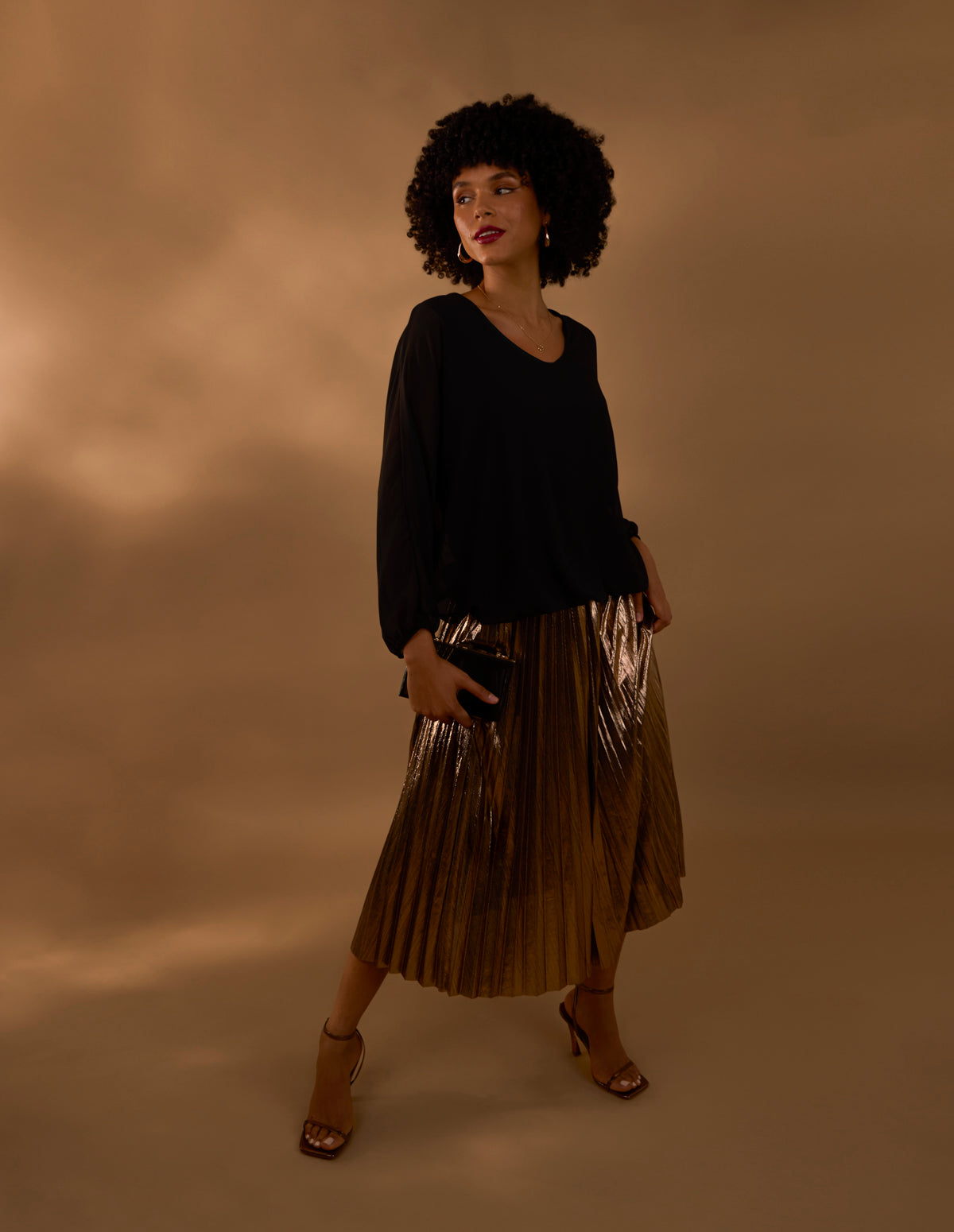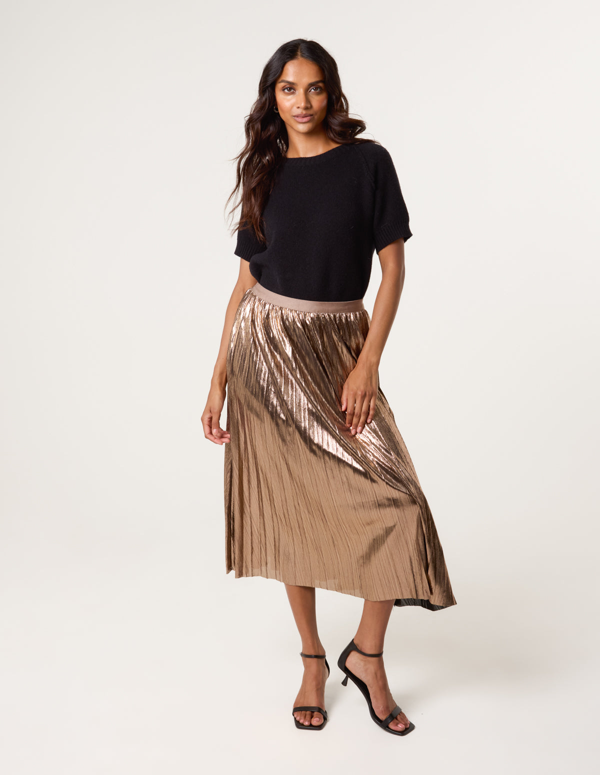 Eye-catching for all the right reason, team this metallic skirt with a slogan oversized top along with a PU jacket and boots, and a swipe of red lipstick for the ultimate chic look.