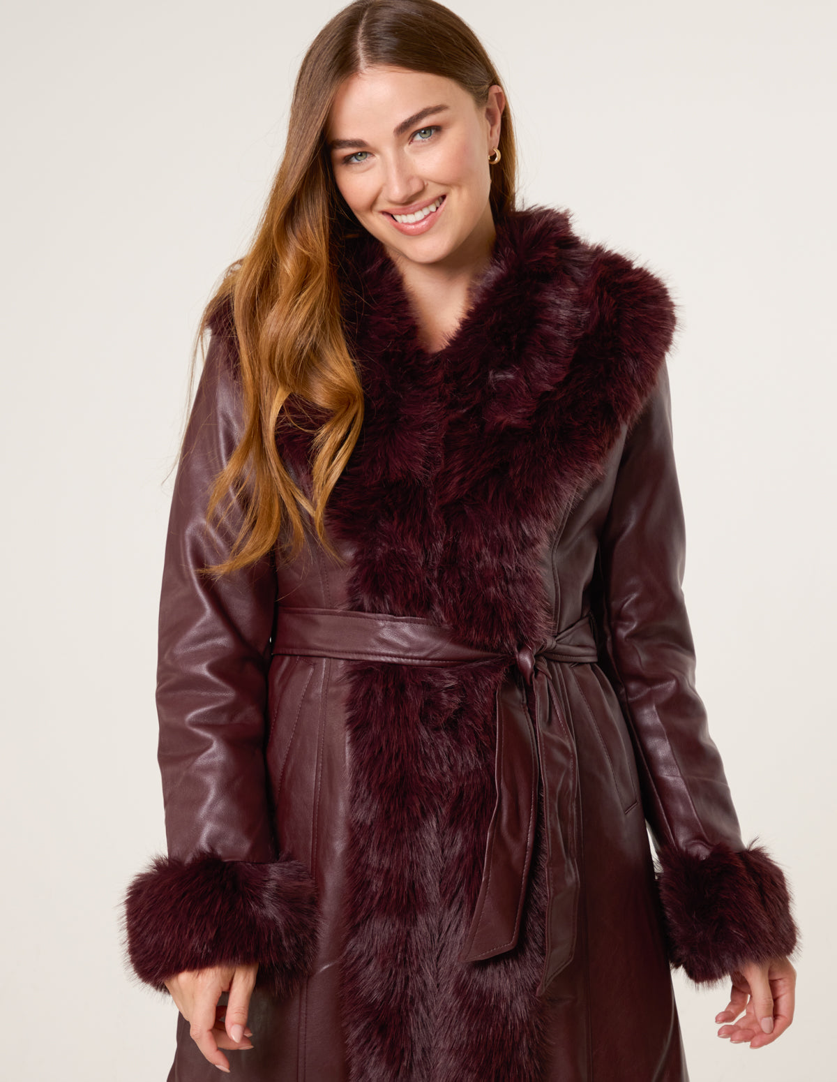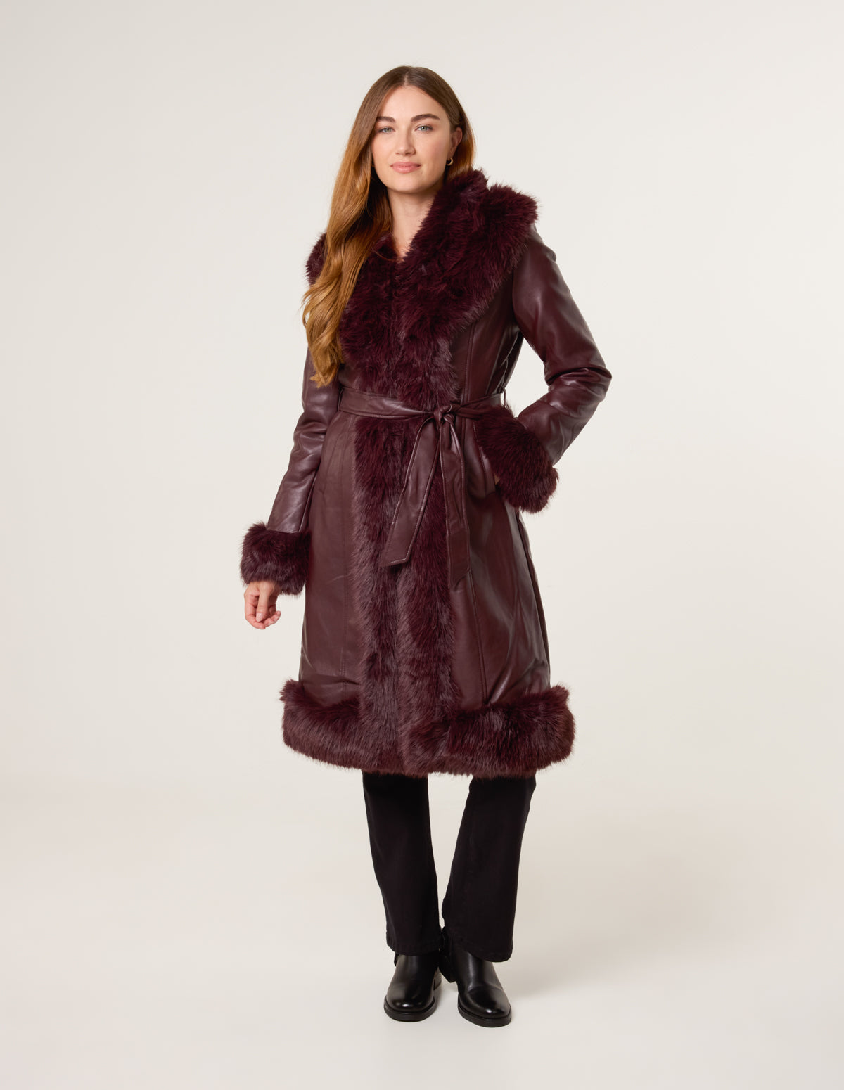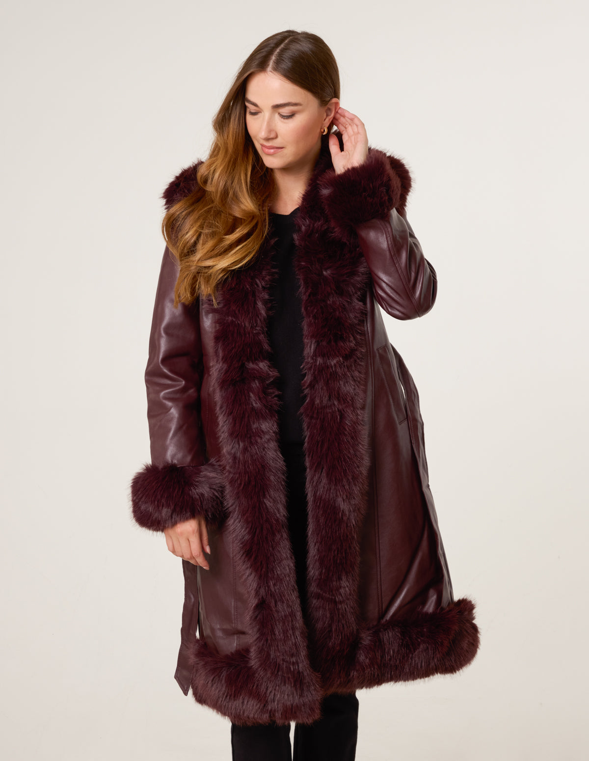 A stunning trimmed faux fur coat with a waist belt for a personalised fit. This coat will provide all the glam you need all season long.