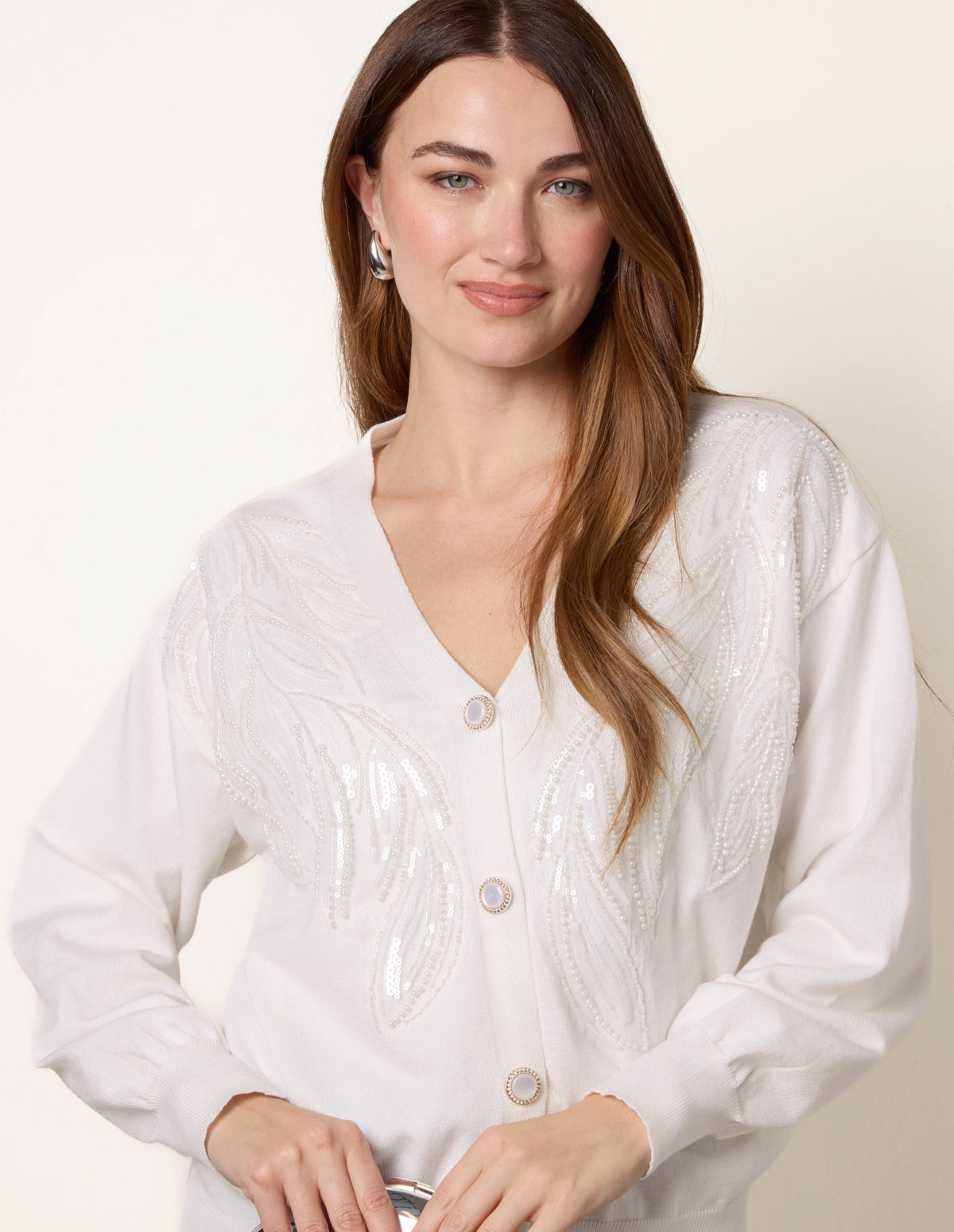 This cute and cosy embellished cardigan with pearl buttons makes layering for colder weather effortless.