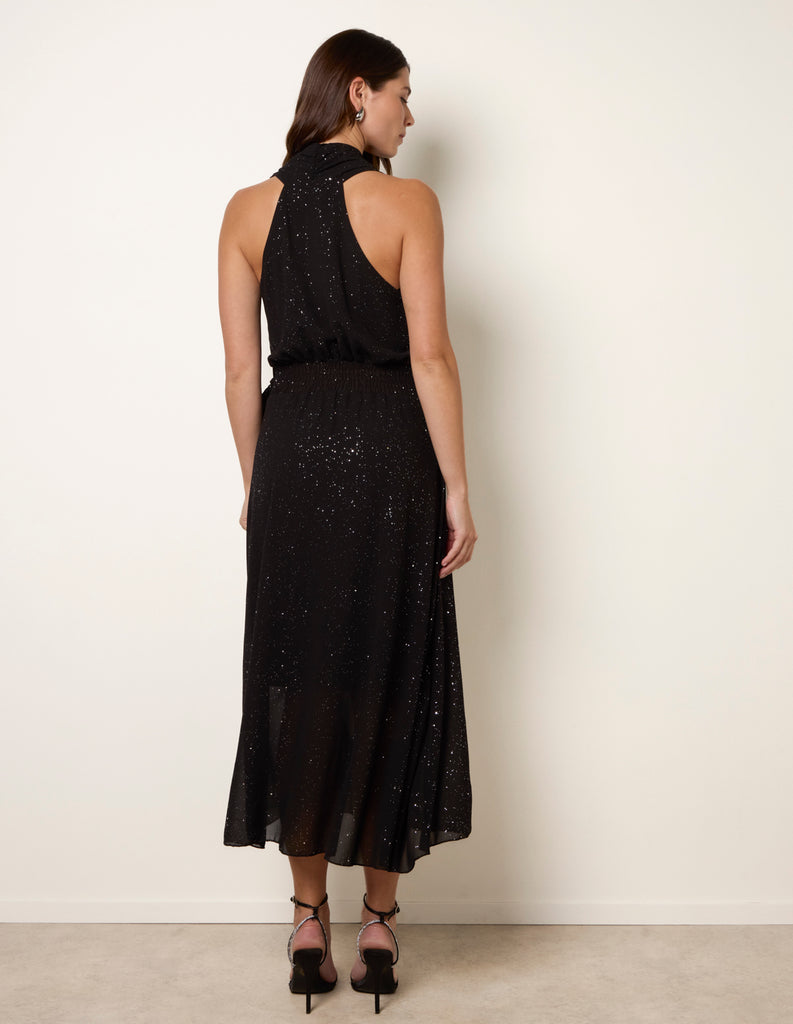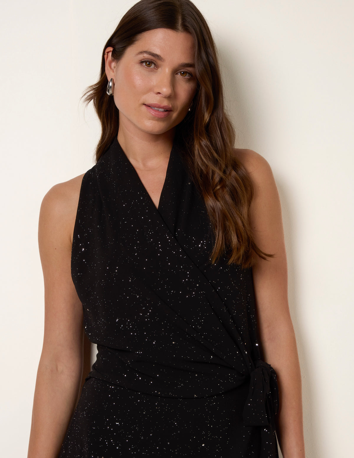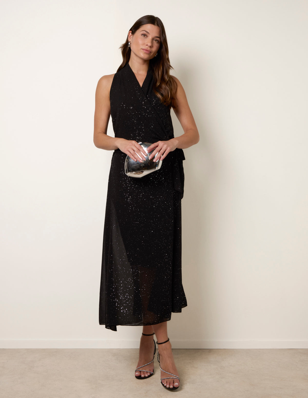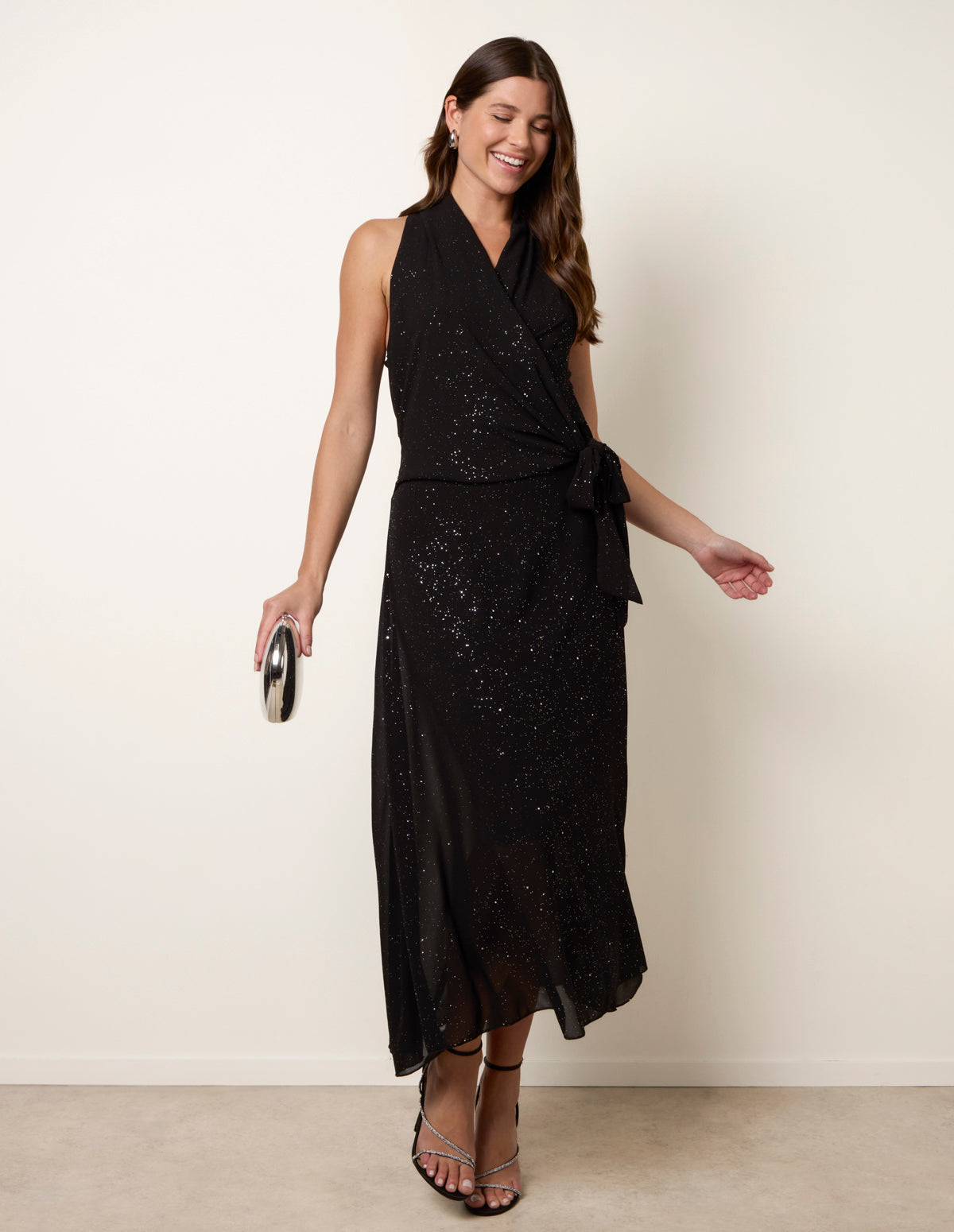 Add flowy movement to your partywear collection. Making this sparkly wrap front dress the perfect choice for dance floors this season.