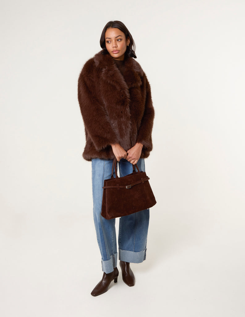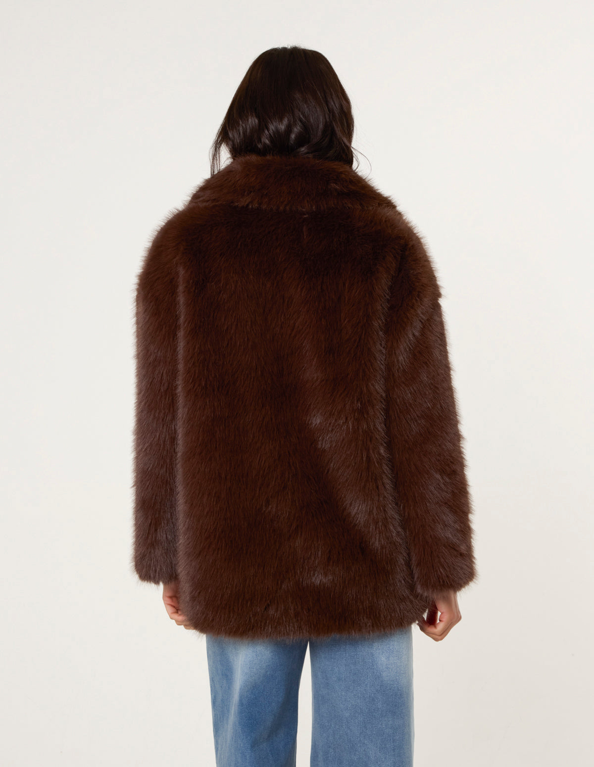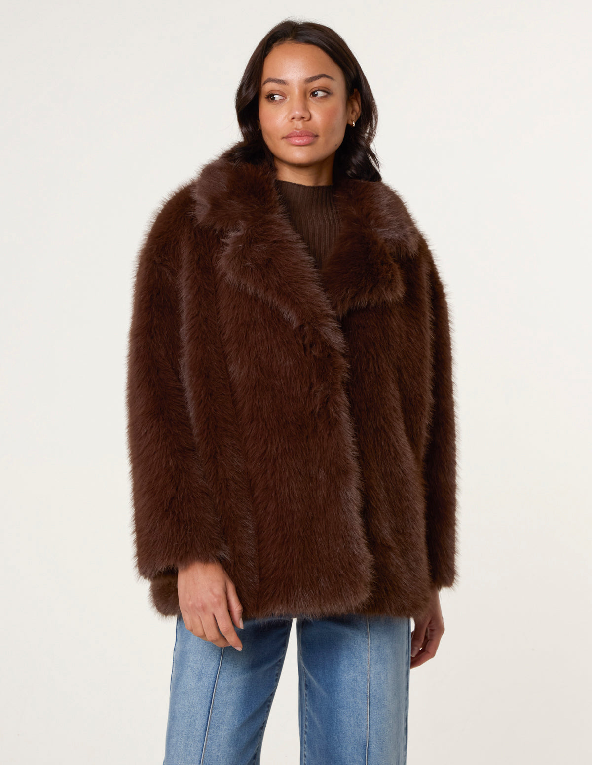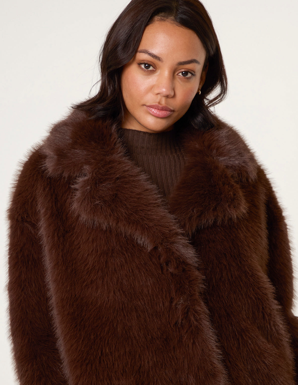 This short length faux fur jacket makes it a great layering piece for daytime or evening looks. With its gorgeous AW rich dark chocolate hue, making it a perfect pick for the colder months.