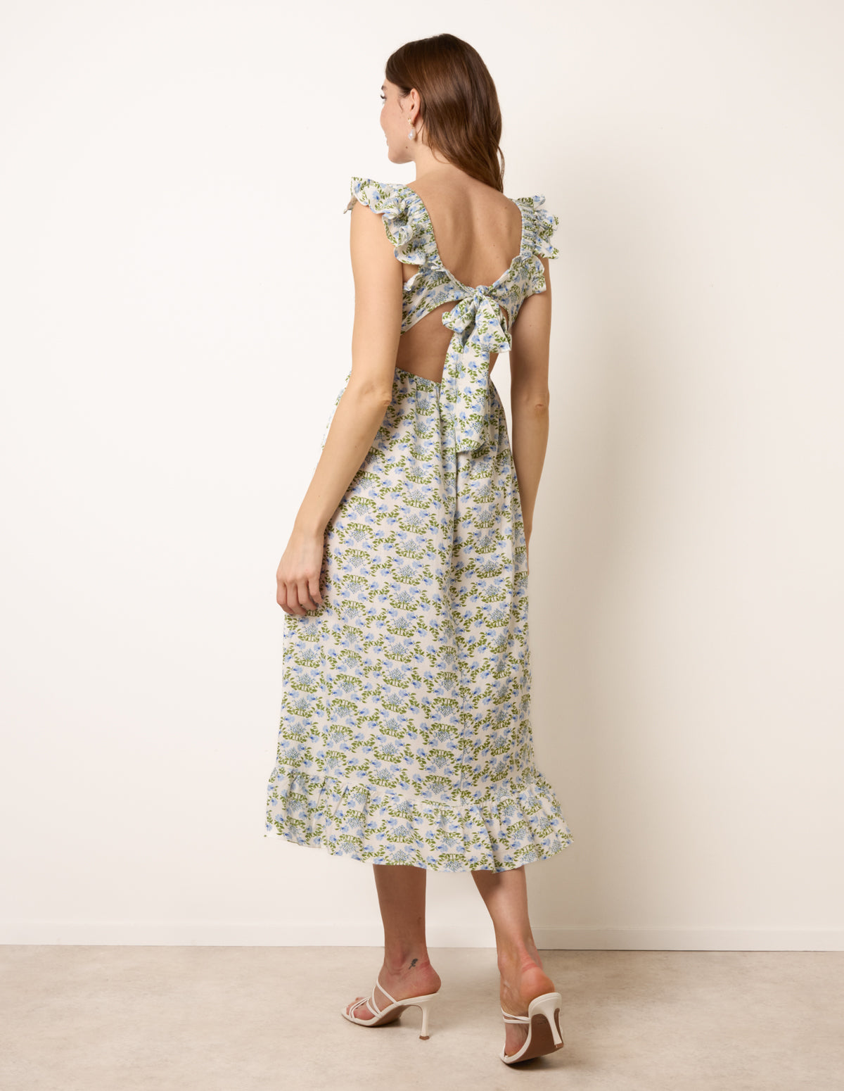 All your occasion wear outfit problems are solved with this dress. Featuring a beautiful bow and frill back detailing. Finish off your look with gold earrings and accessories.
