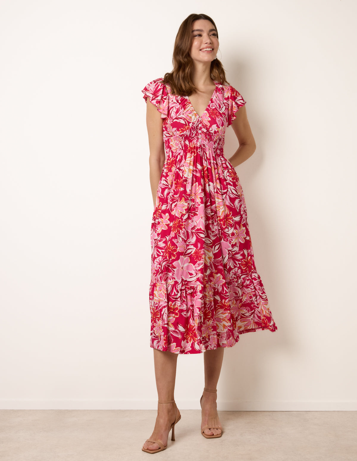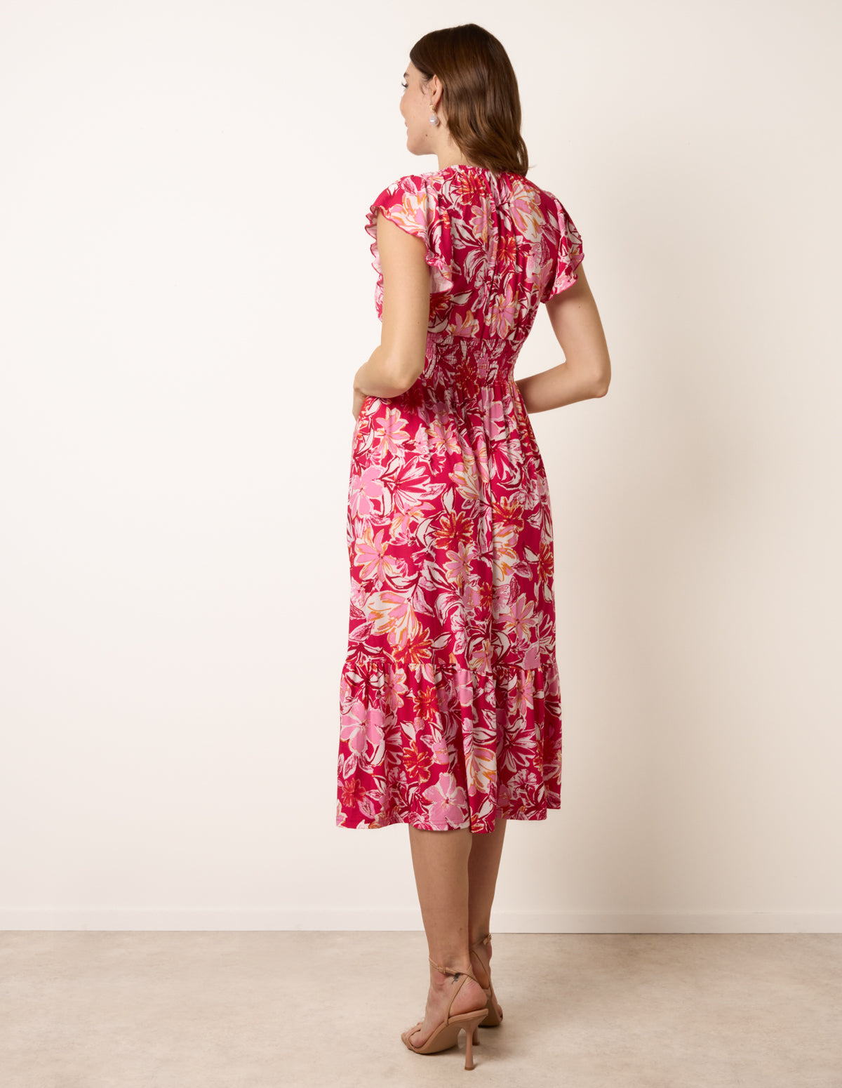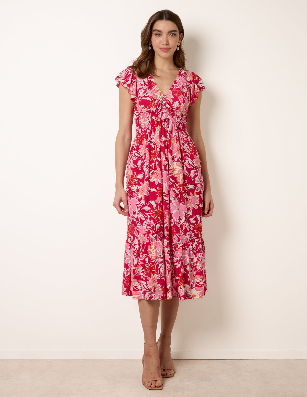 Tropical Print Flutter Sleeve Midi Dress