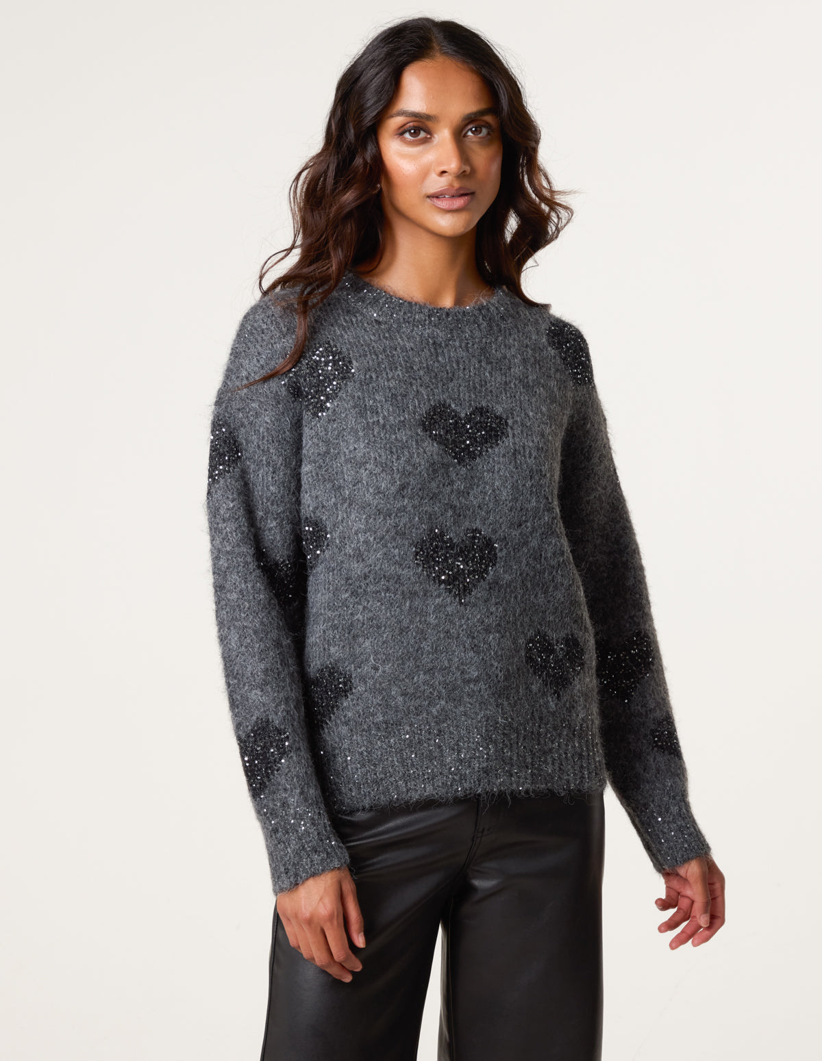 Spread some shimmer and love this Winter season with our heart sequin detail jumper. Pair with flared black jeans and PU boots.