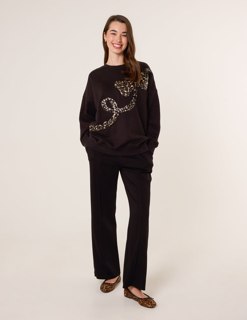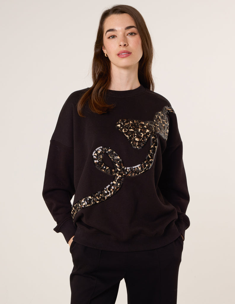 Cute and comfy, just what you need when the weather begins to turn chilly. Team this sequin, leopard print bow jumper with leggings and trainers.