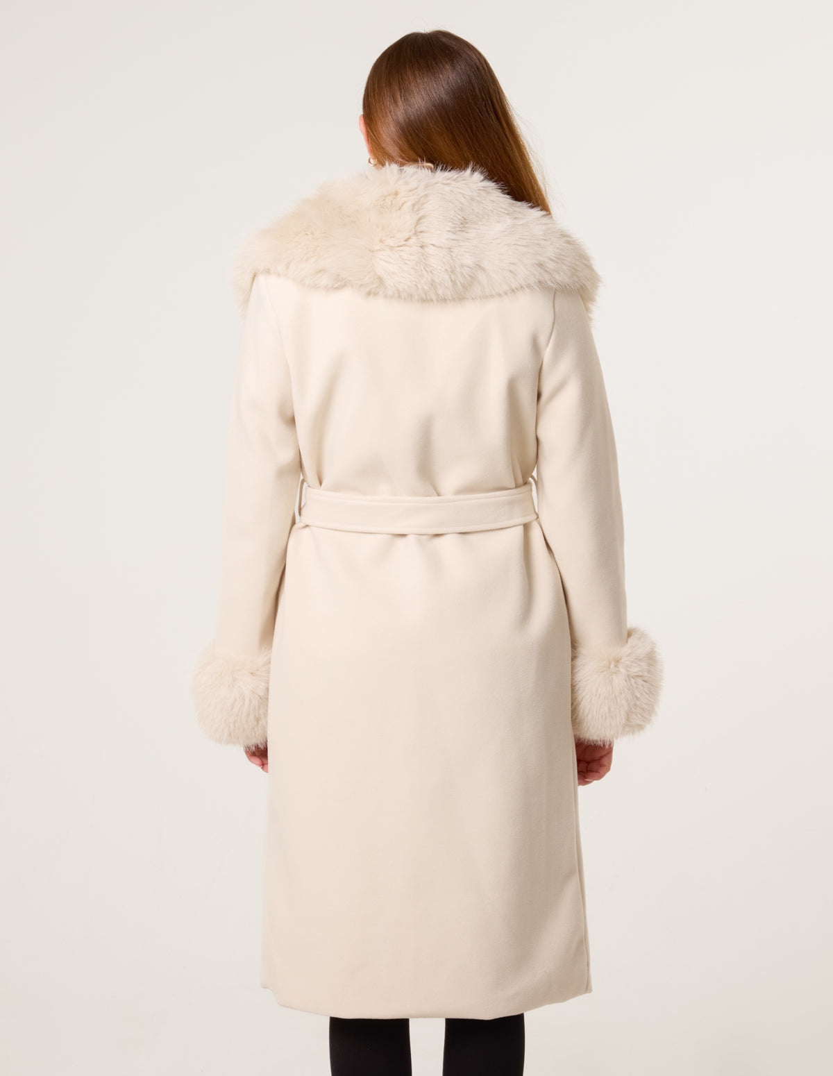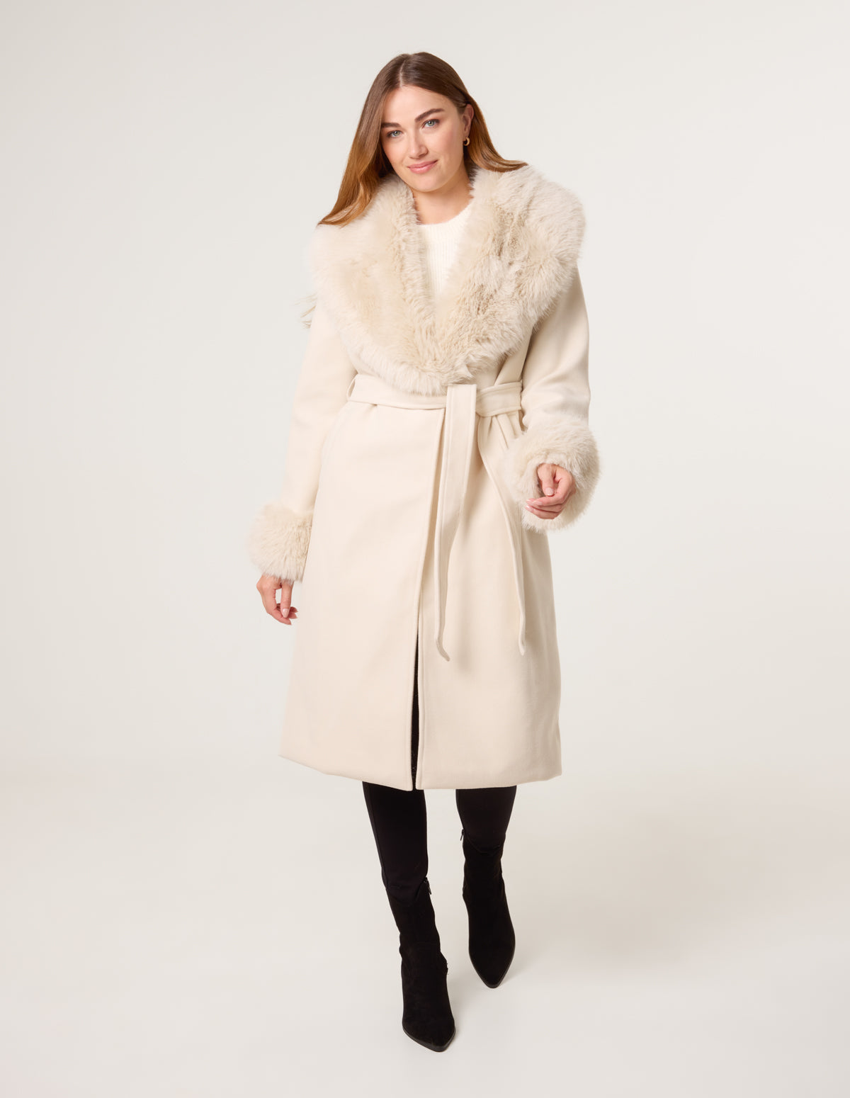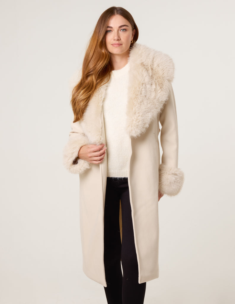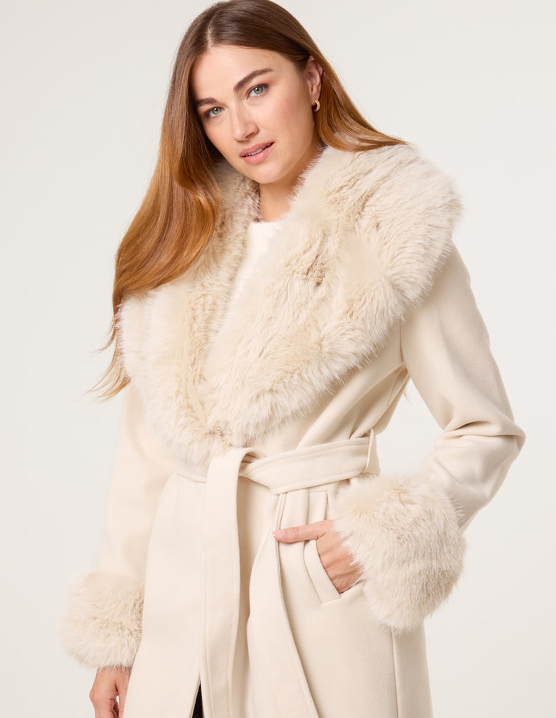 Wrap Front Faux Fur Collar & Cuff Coat