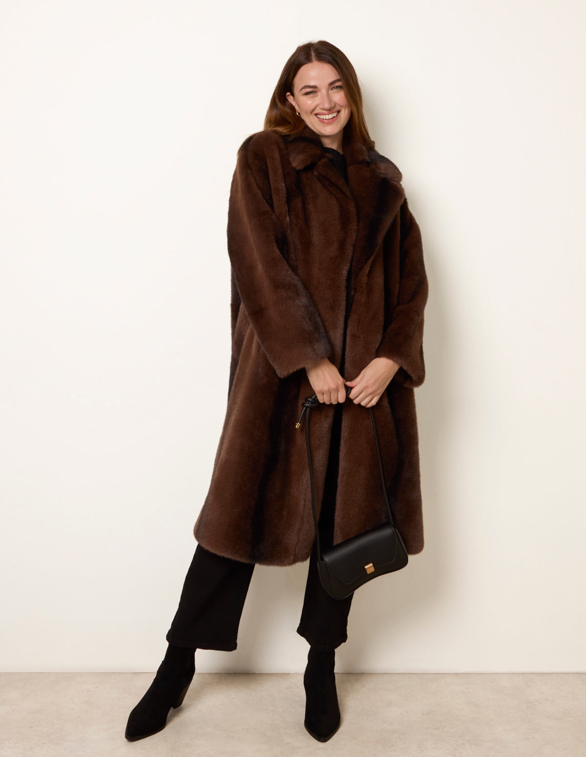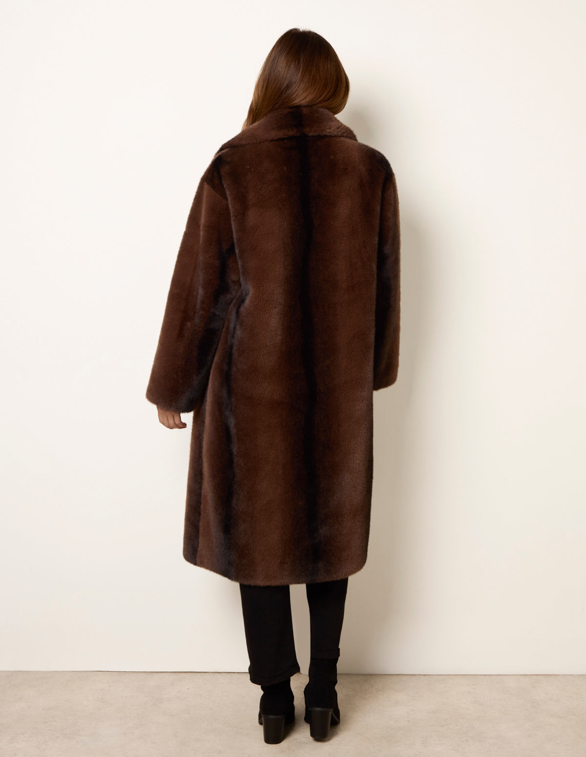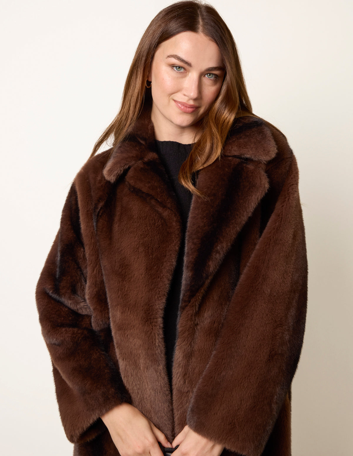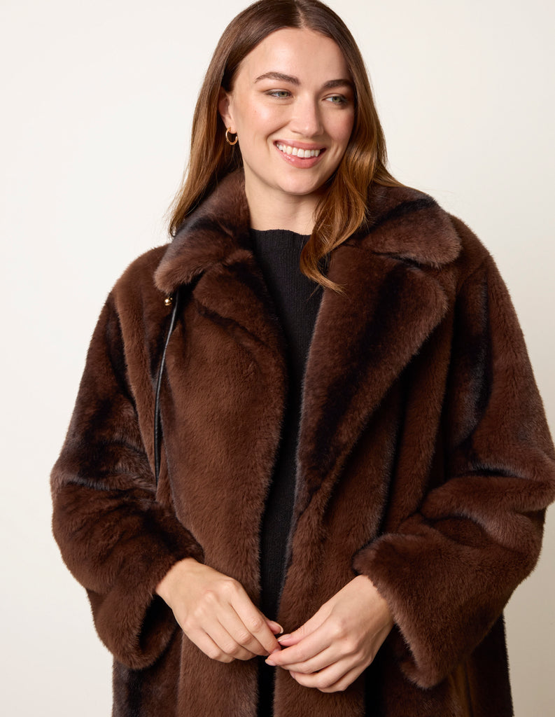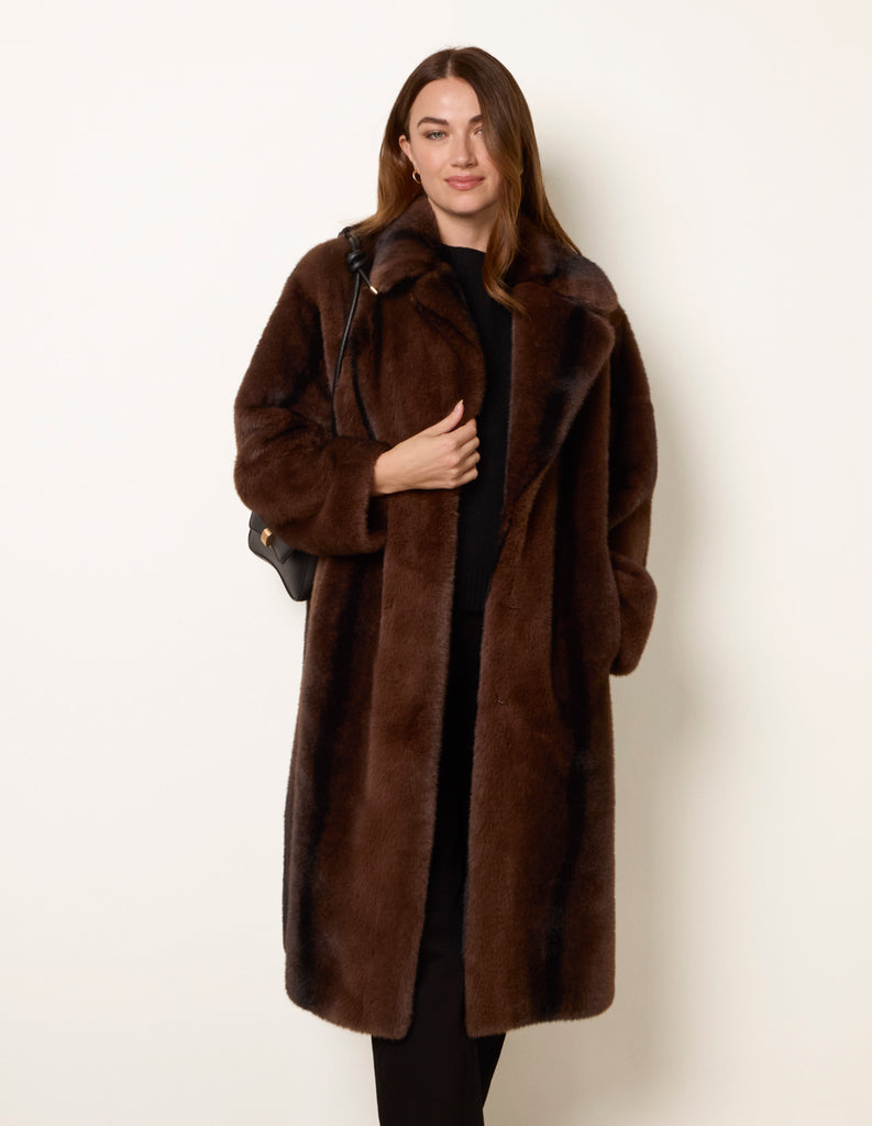 A stunning faux fur coat with trim details. This coat will provide all the glam you need all season long.