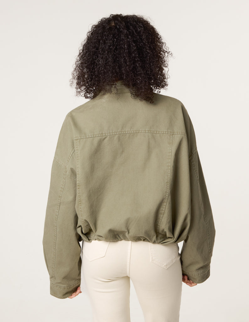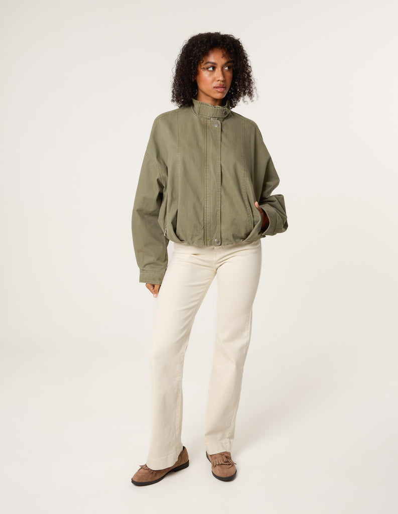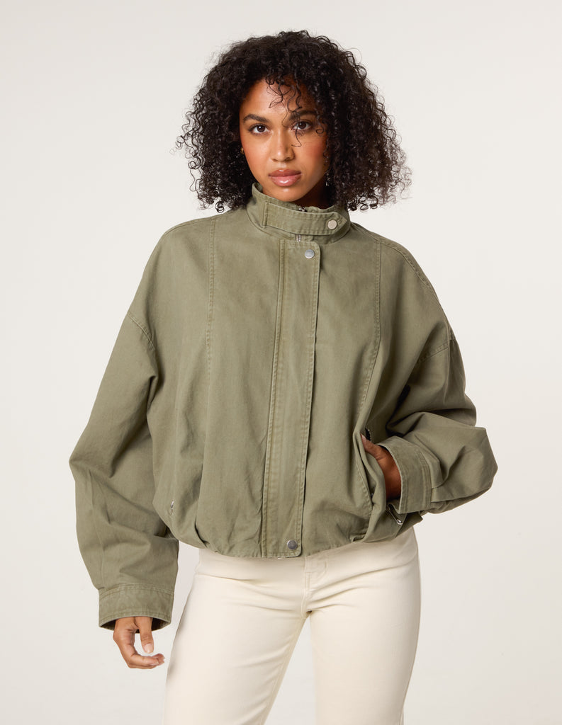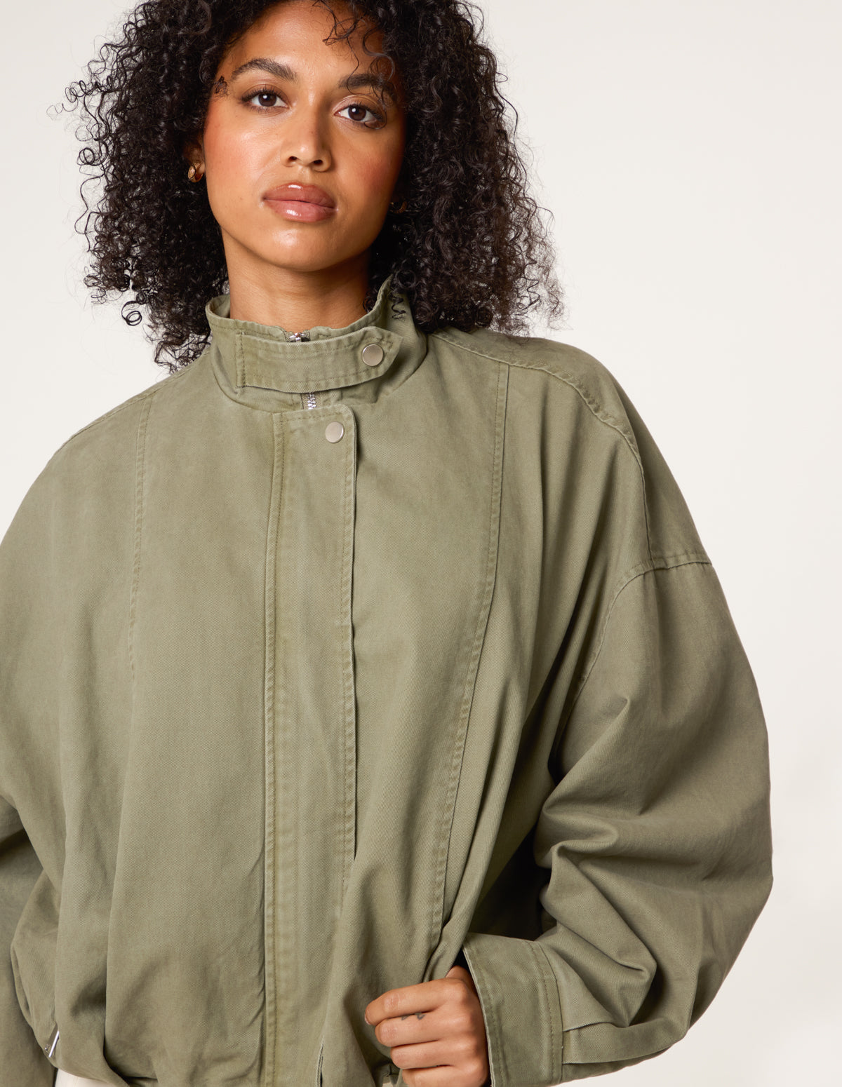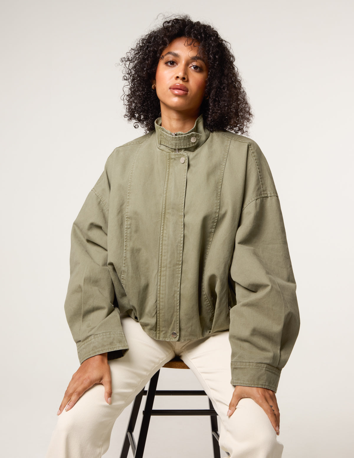 This khaki green shacket is a stylish layer for in-between weather and transitional seasons. Team with a basic oversized t-shirt, jeans and trainers.