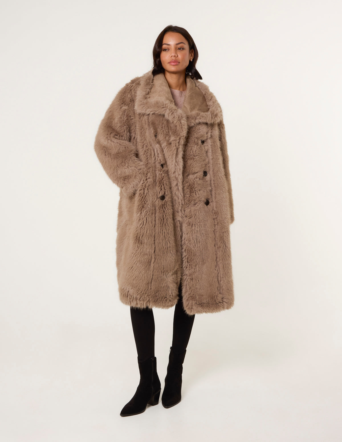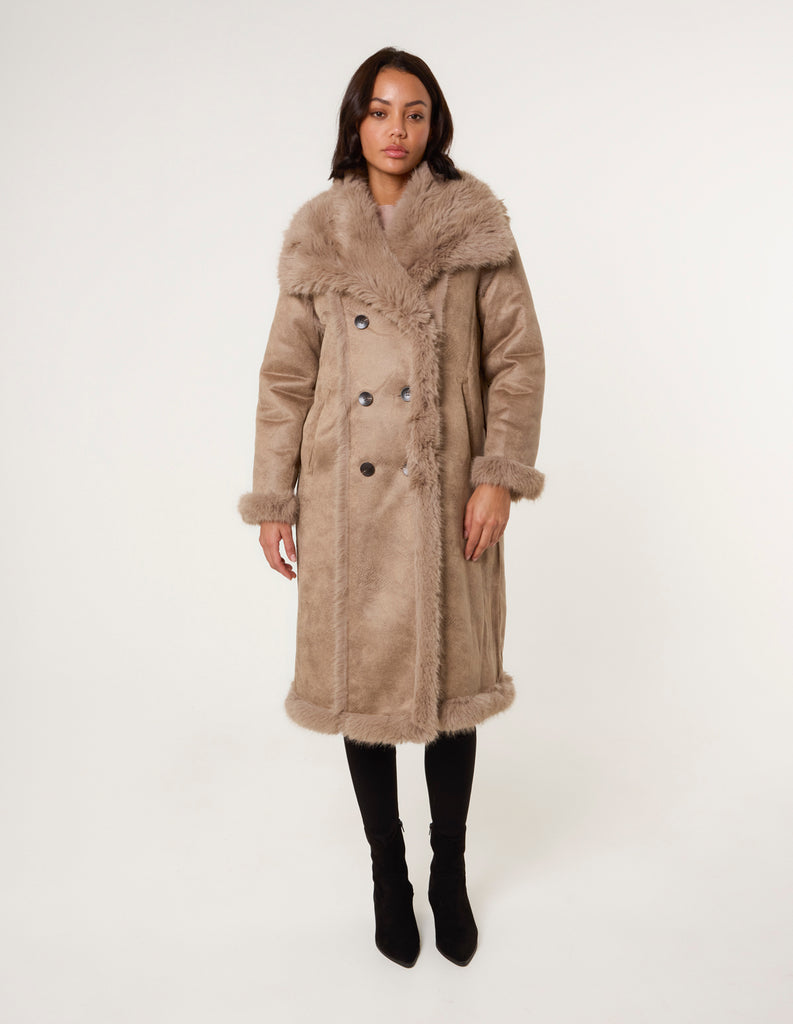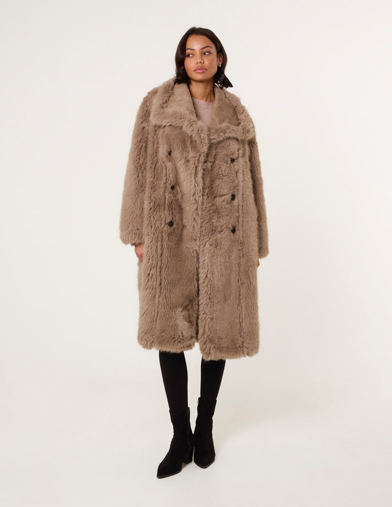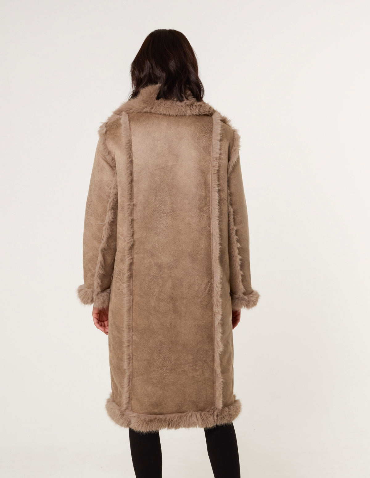 A stunning reversible faux fur coat with trim details. This coat will provide all the glam you need all season long.