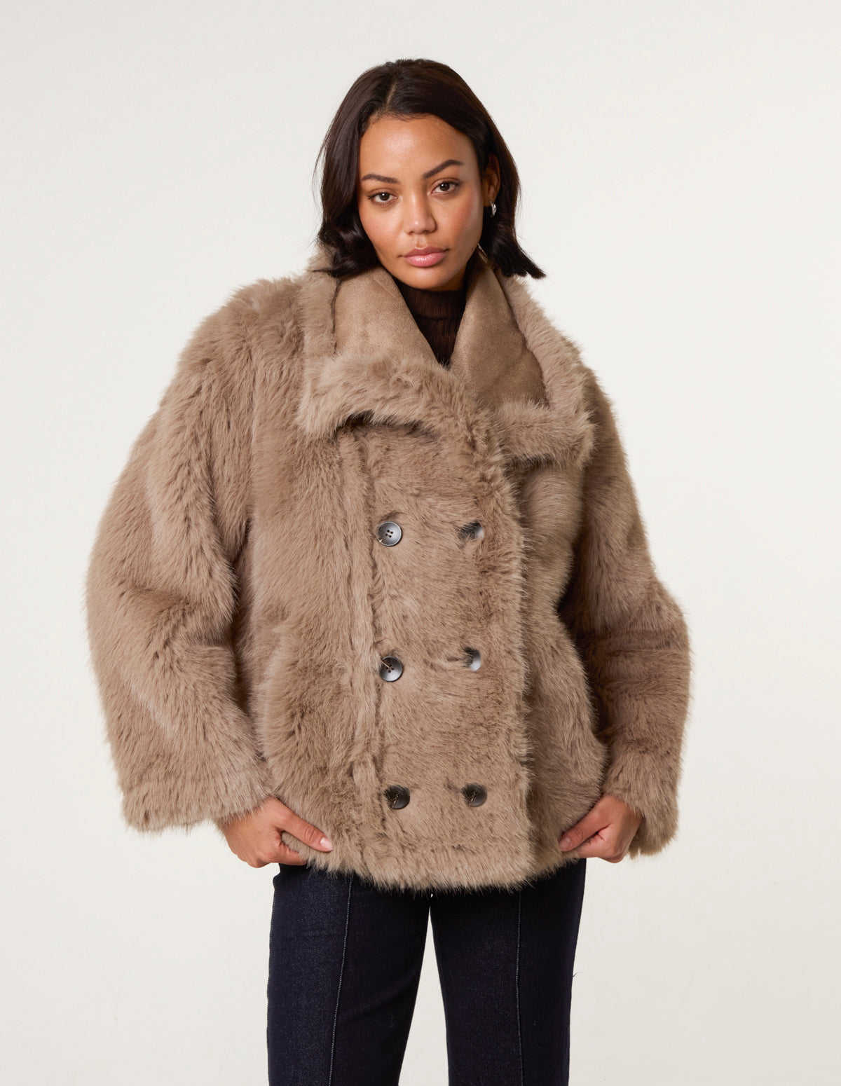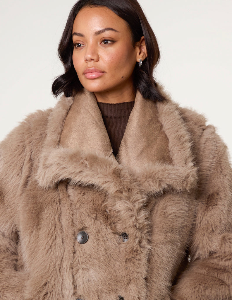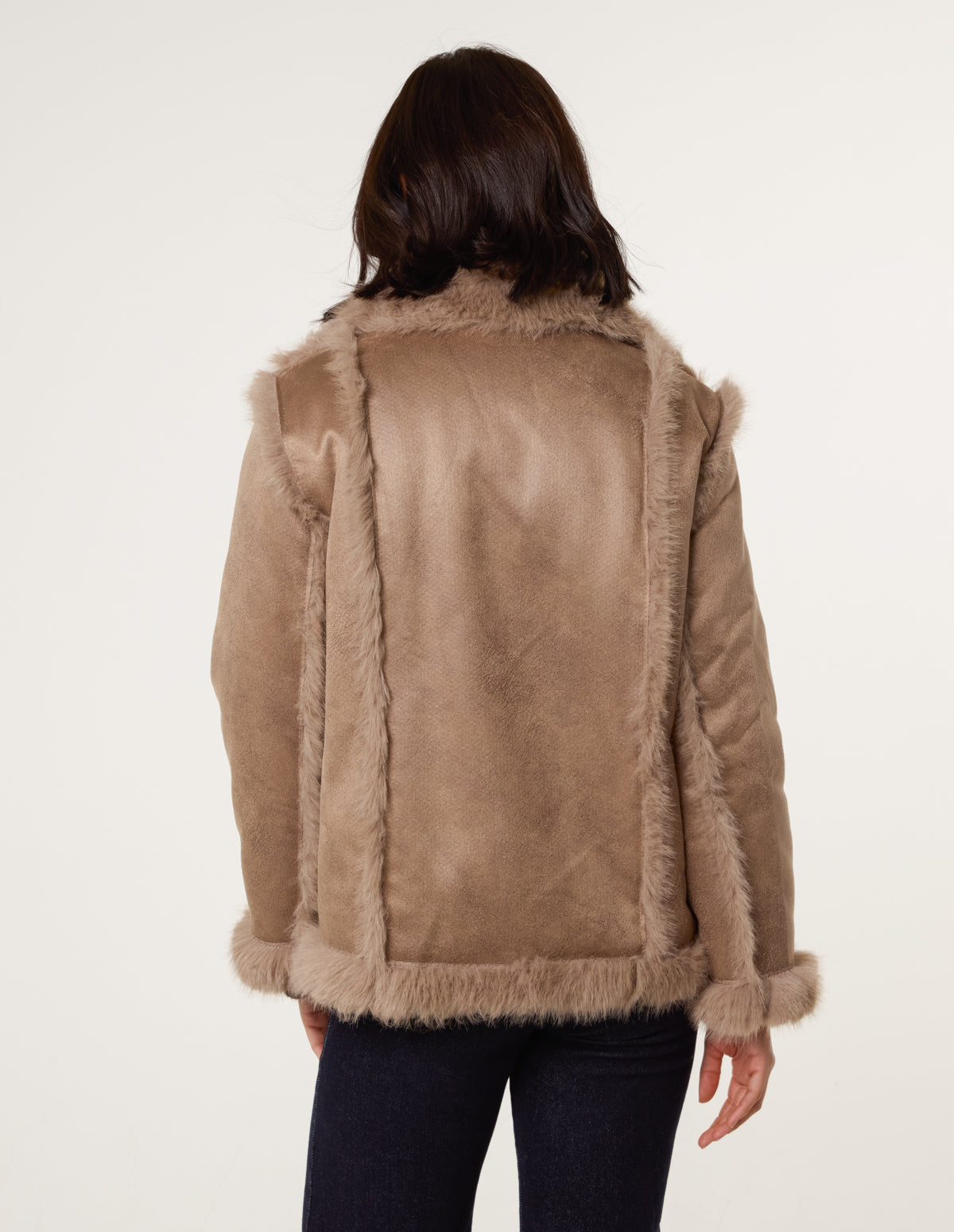 A stunning reversible faux fur coat with trim details. This coat will provide all the glam you need all season long.