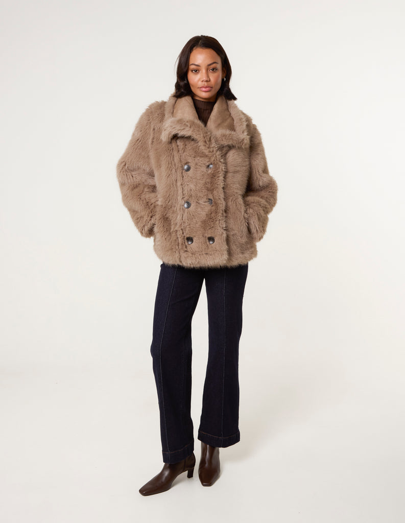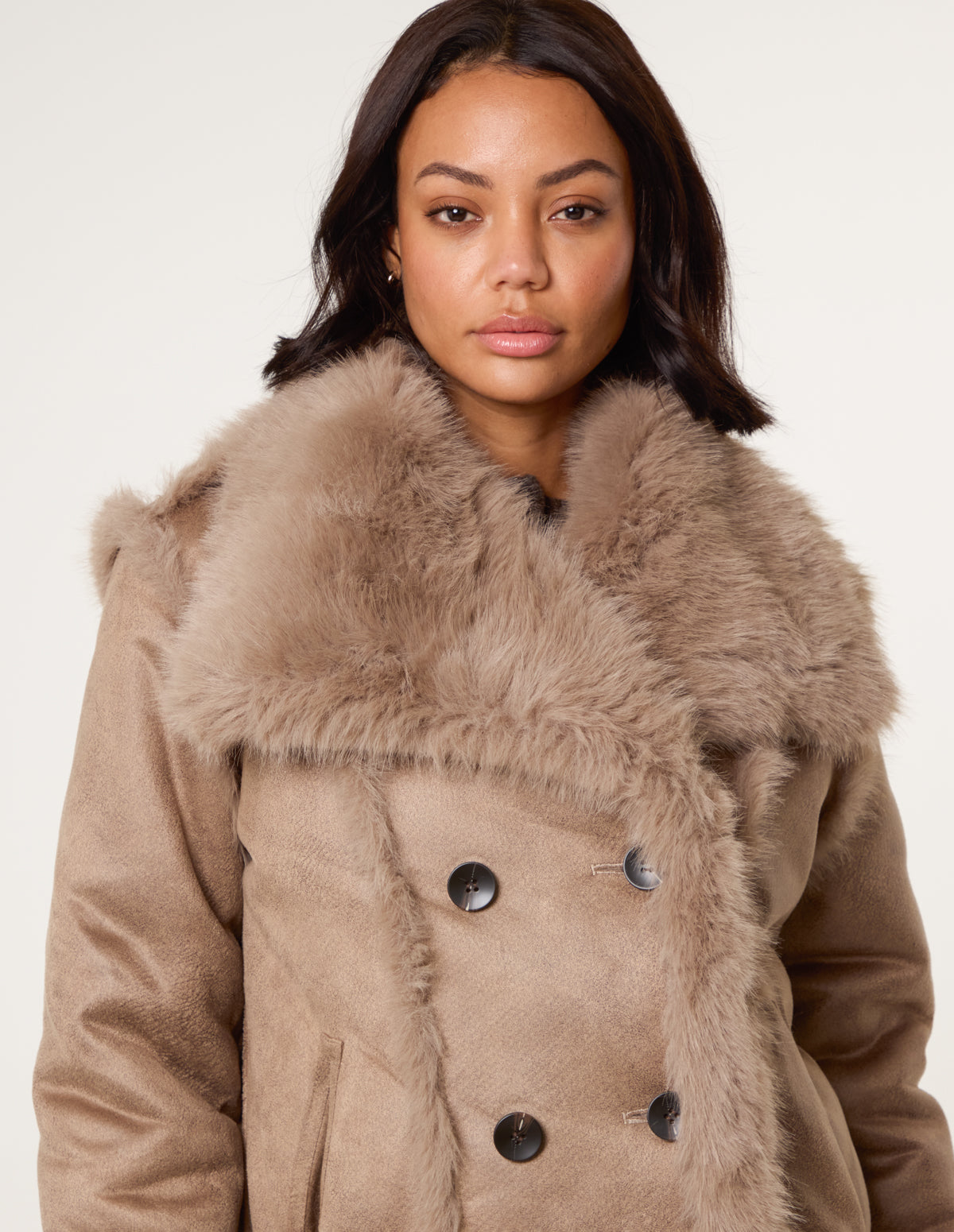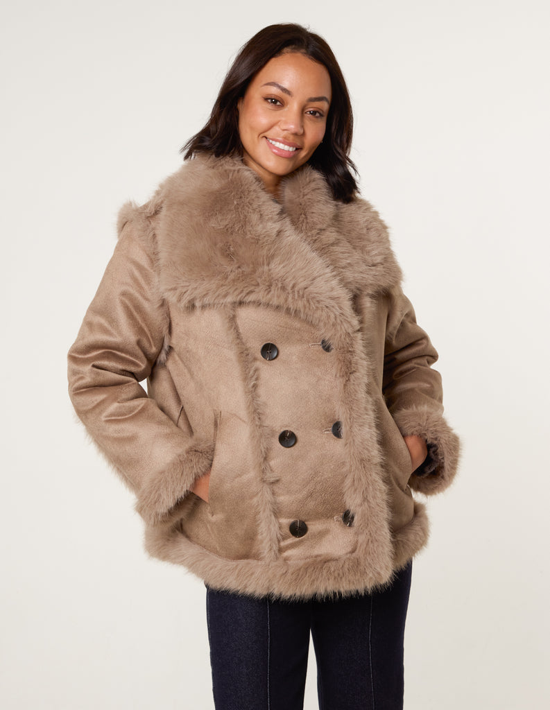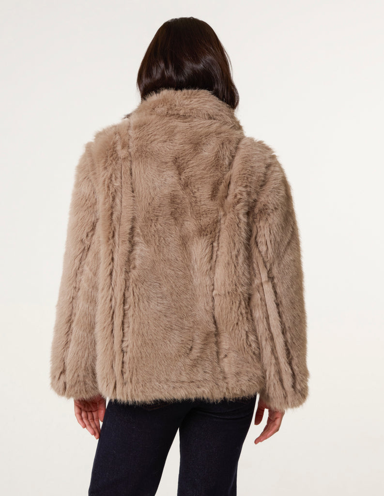 A stunning reversible faux fur coat with trim details. This coat will provide all the glam you need all season long.