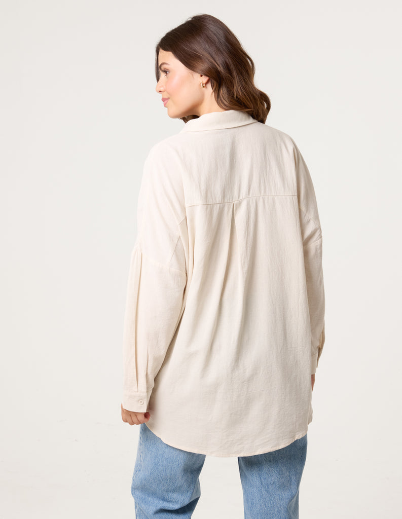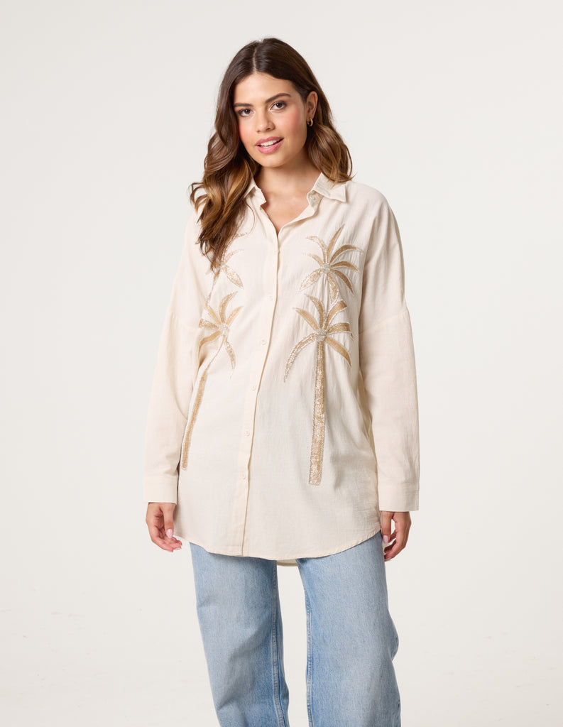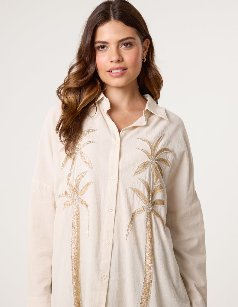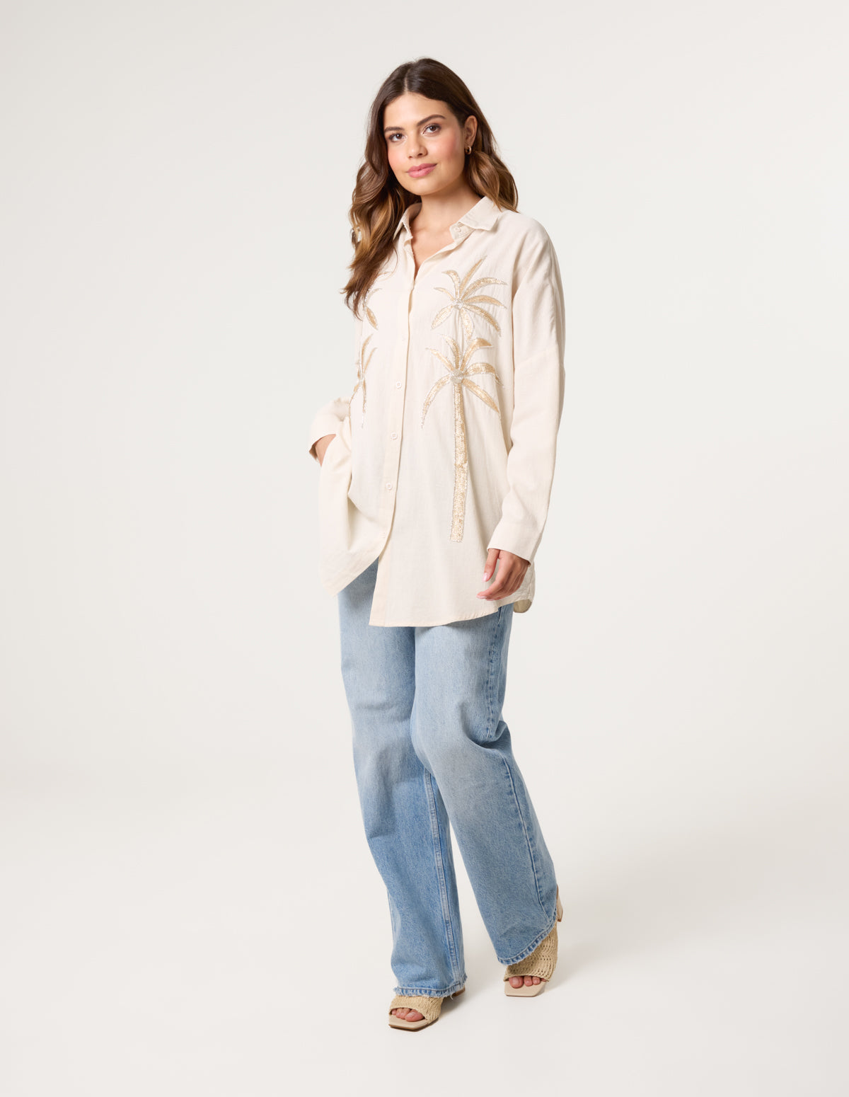 A shirt made for holidaying! Team this sequin detailed palm tree line shirt with white denim shorts and chunky sandals.