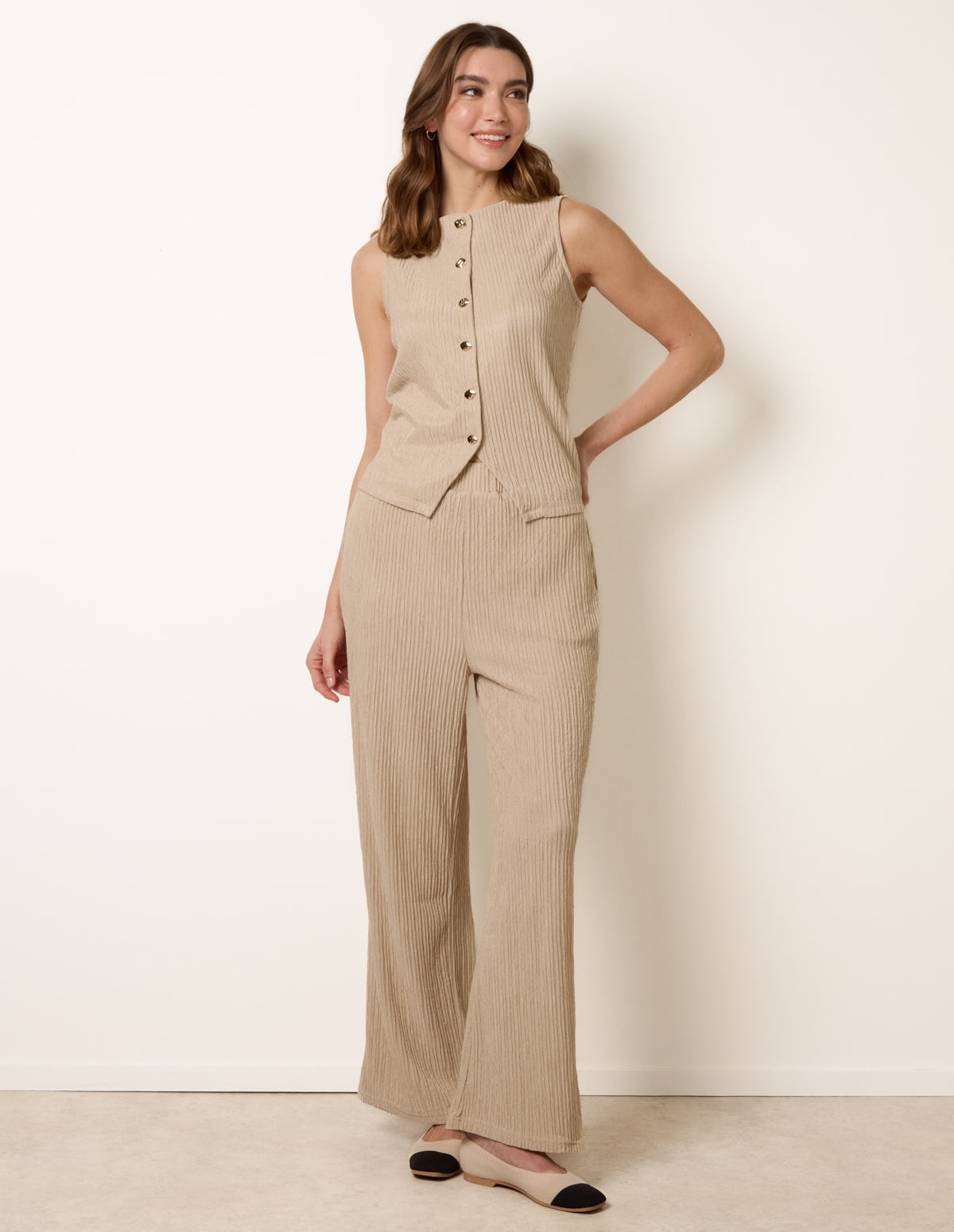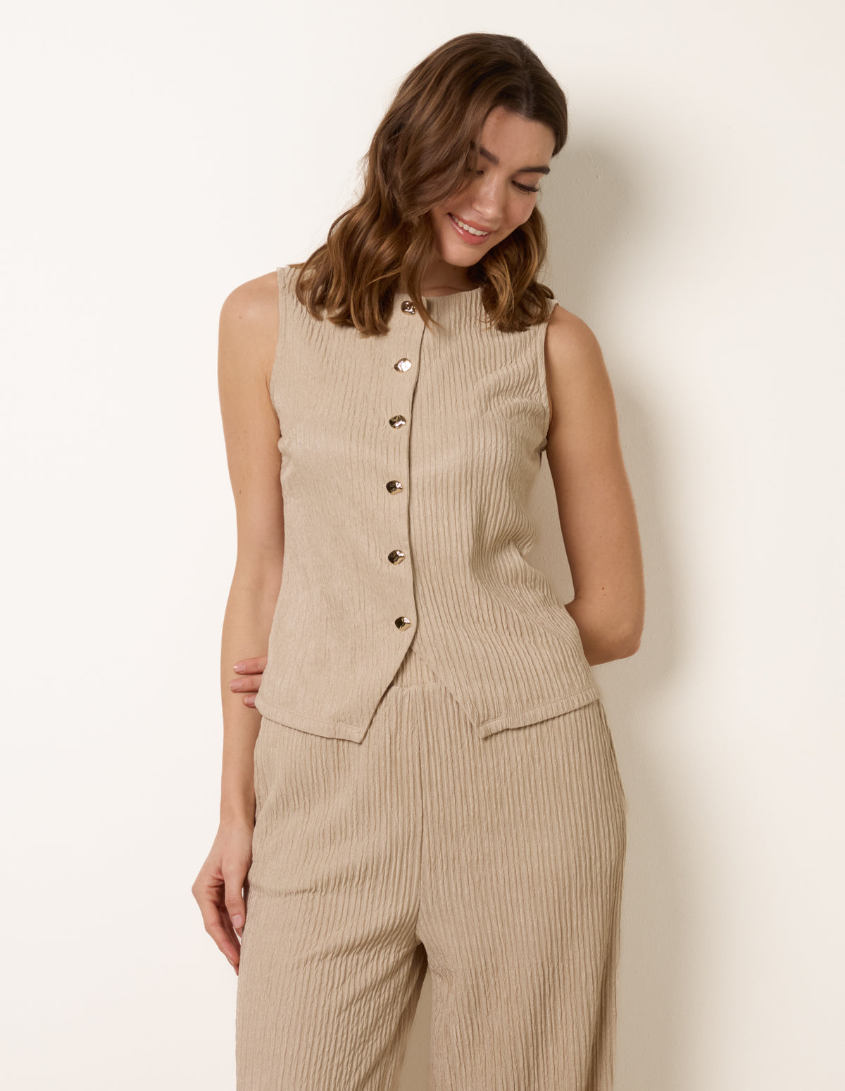 This crinkled button front detail top creates a beautifully defined silhouette, especially when teamed with our matching flared trousers. Whilst easily mixed with other wardrobe staples for multiple looks.