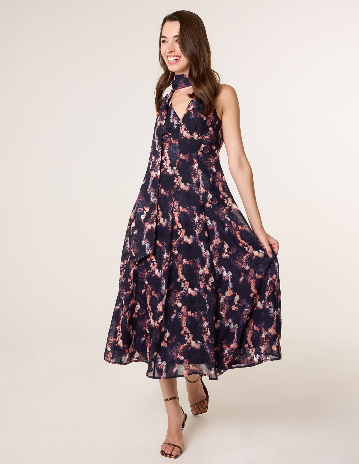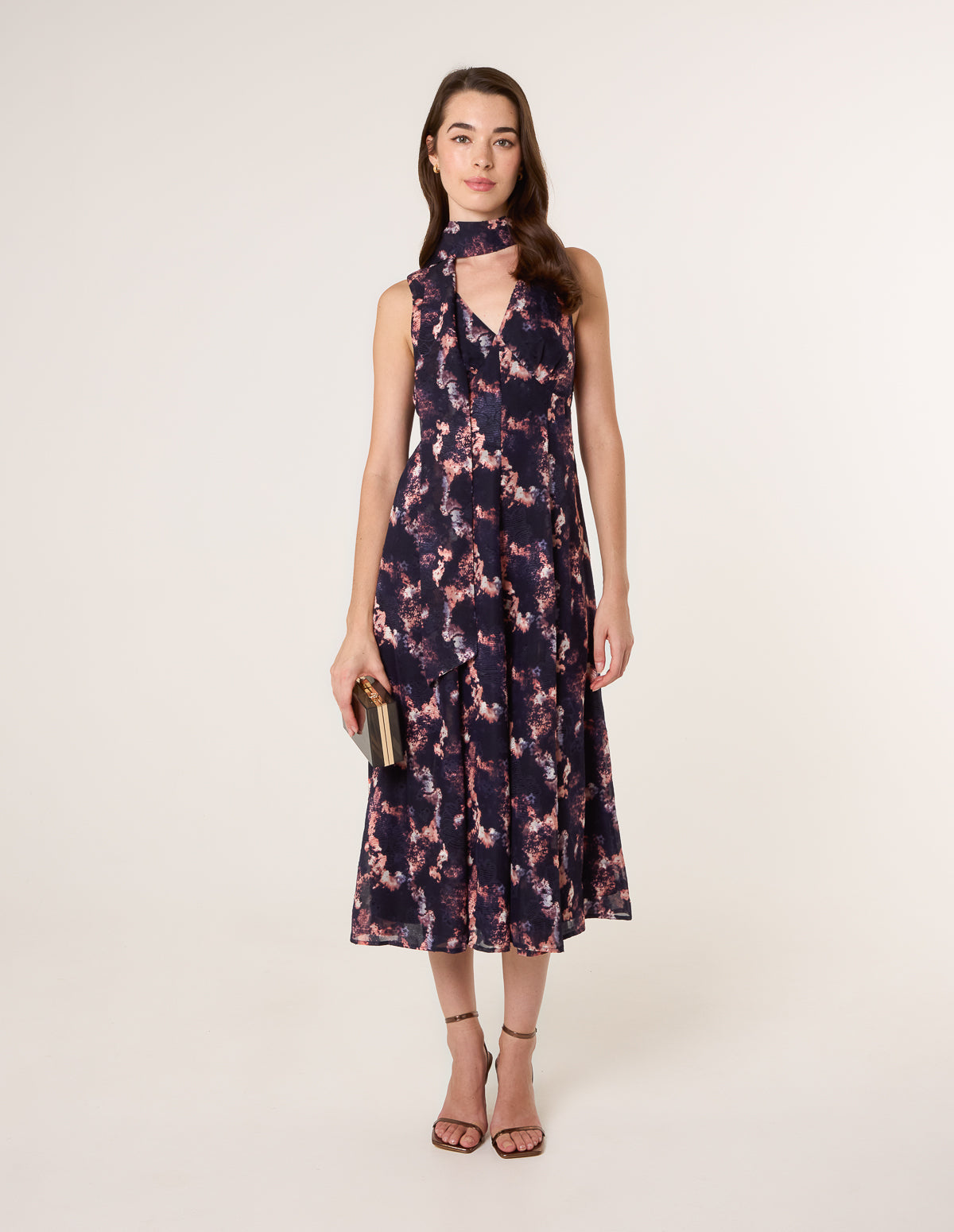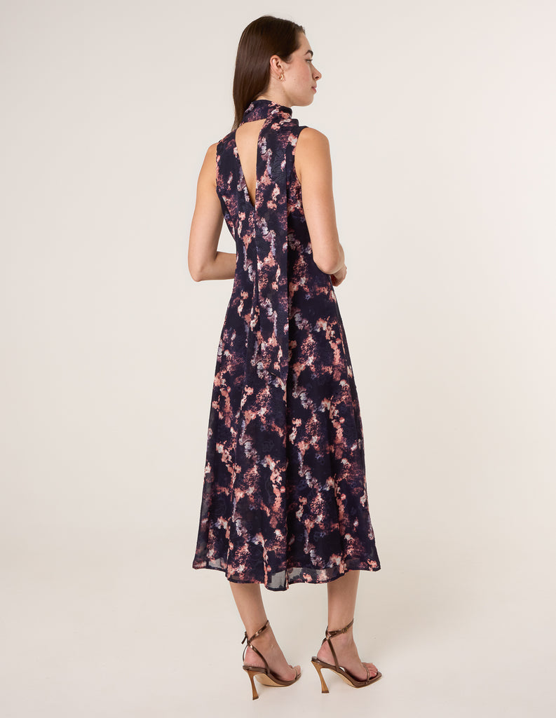 Make a statement at your next special occasion with this show-stopping tie neck printed midi dress. Team with pastel pink heels and a matching bag,