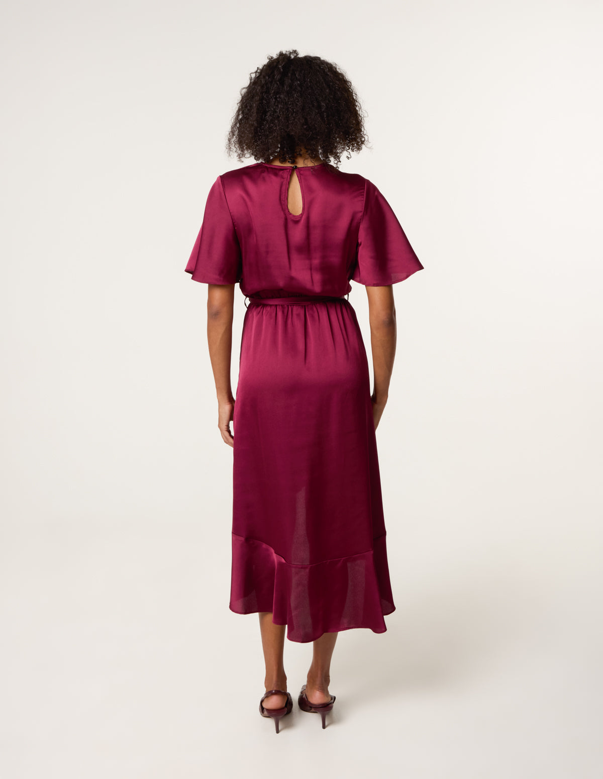 This satin midi dress will instantly elevate after dark occasions. With it's autumnal colourway to it's frill hemline. Team this dress with gold heels and accessories.