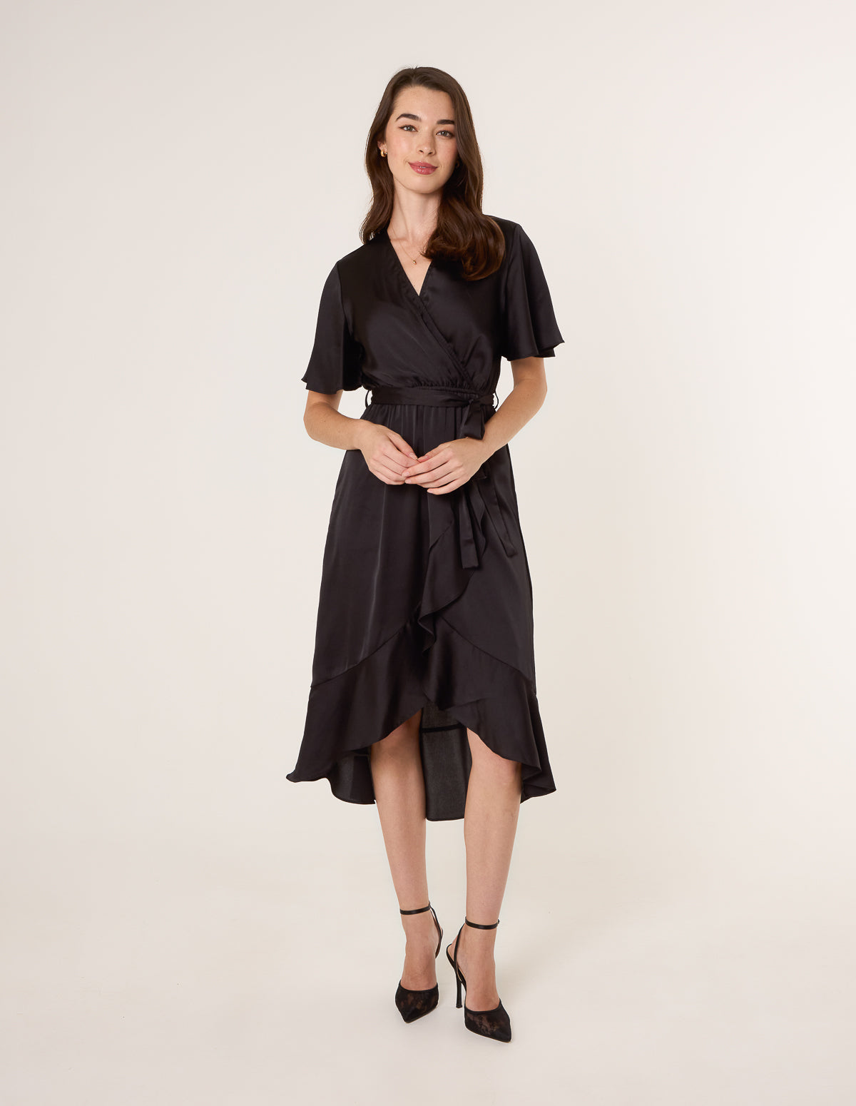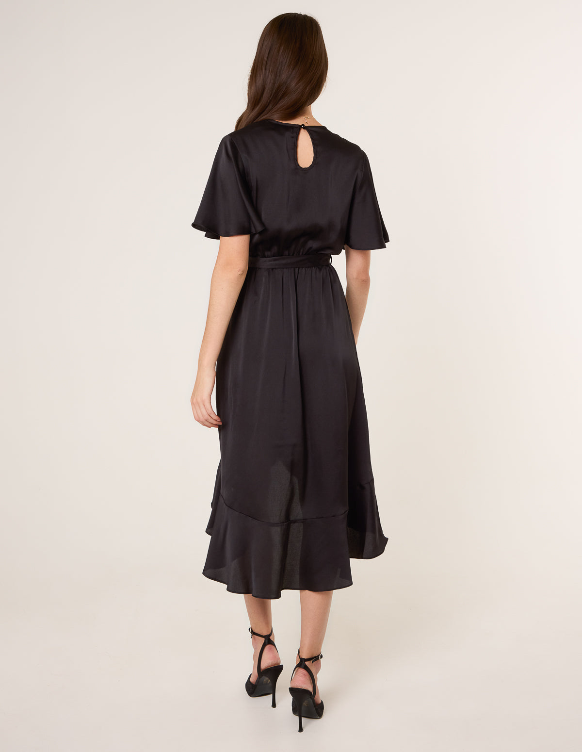 This satin midi dress will instantly elevate after dark occasions. With it's autumnal colourway to it's frill hemline. Team this dress with gold heels and accessories.