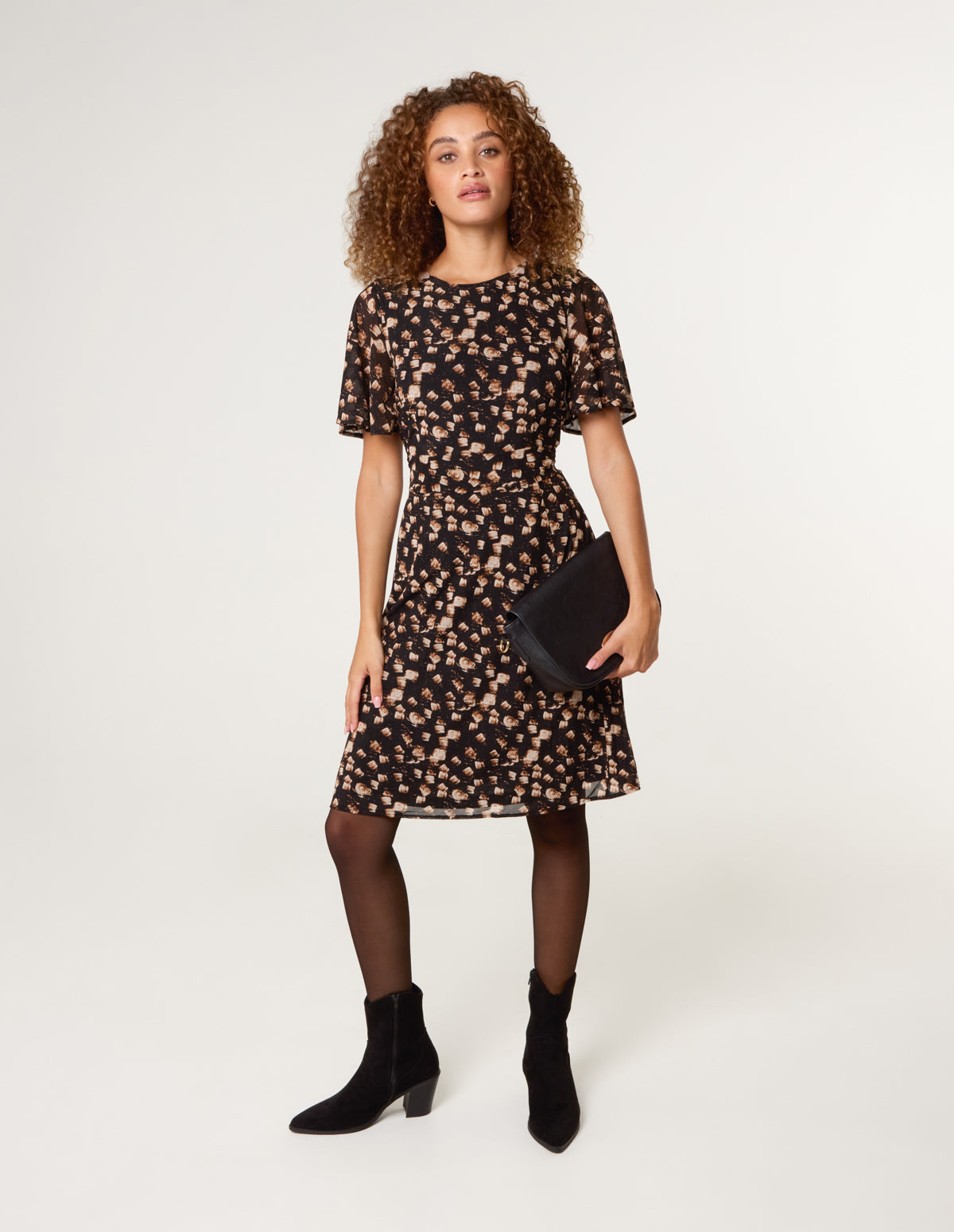 Taking you from morning meetings to out-of-office drinks in style this season! Team this printed frill sleeve dress with pumps for the perfect office-wear outfit.