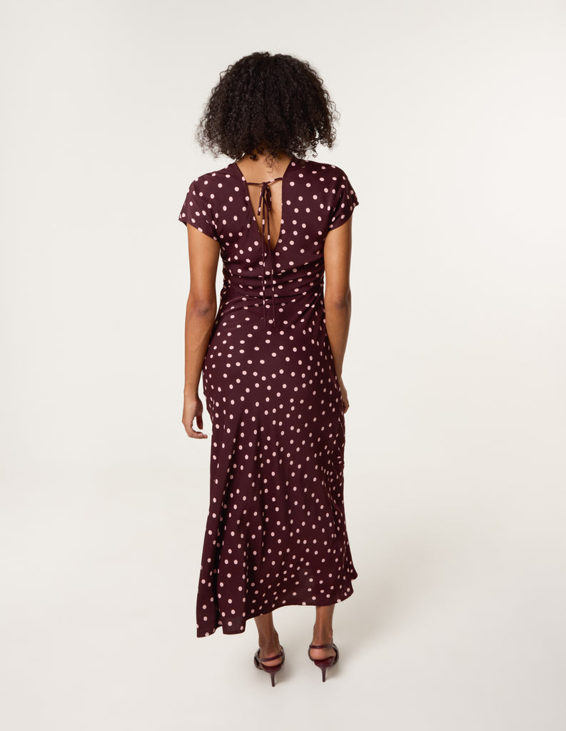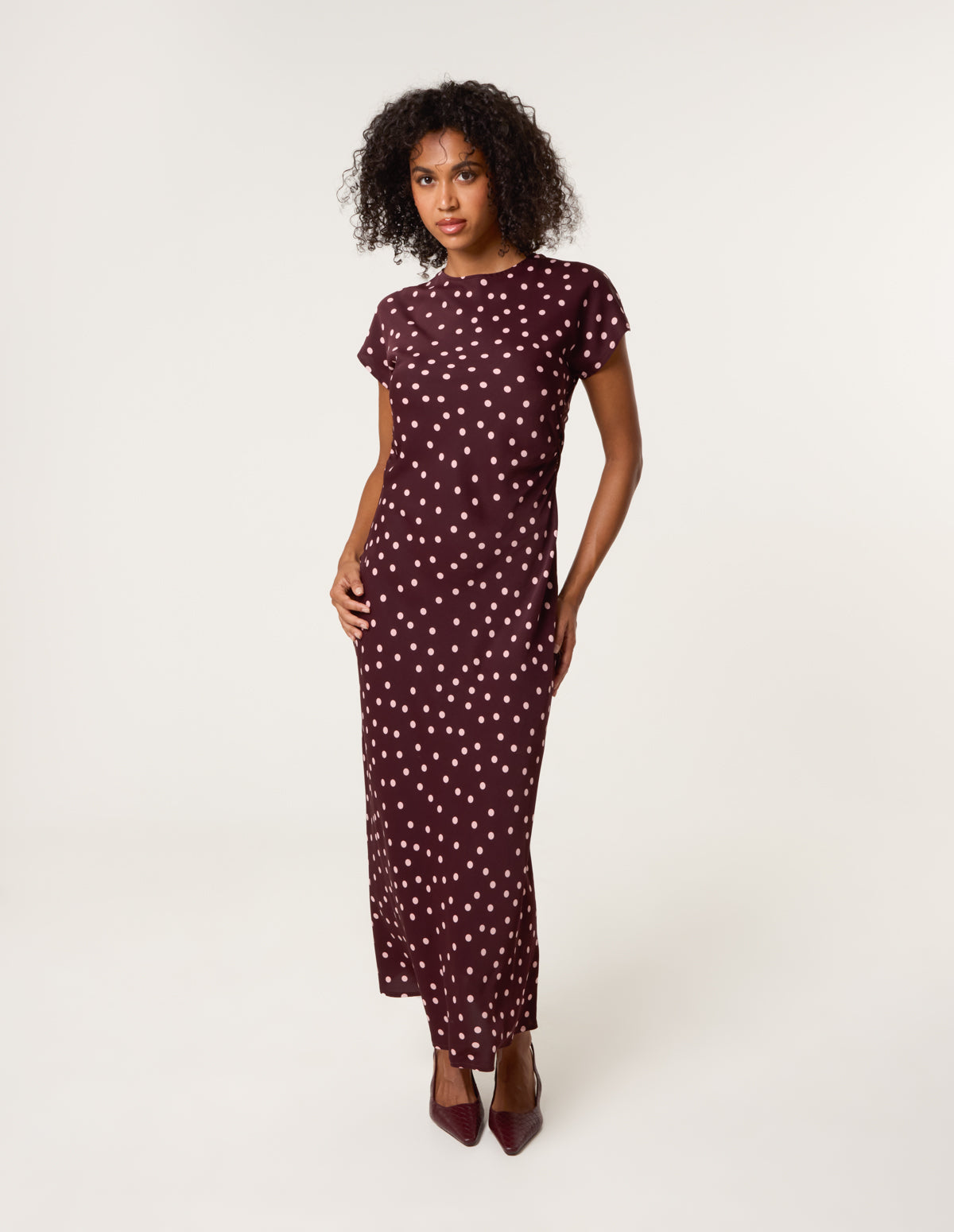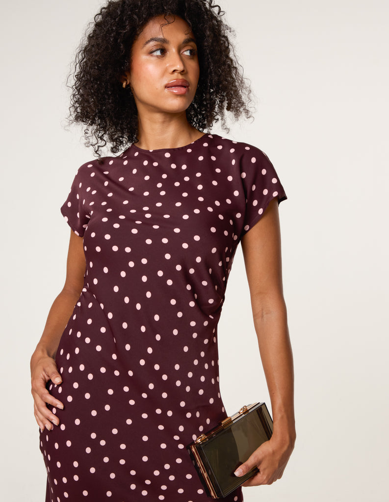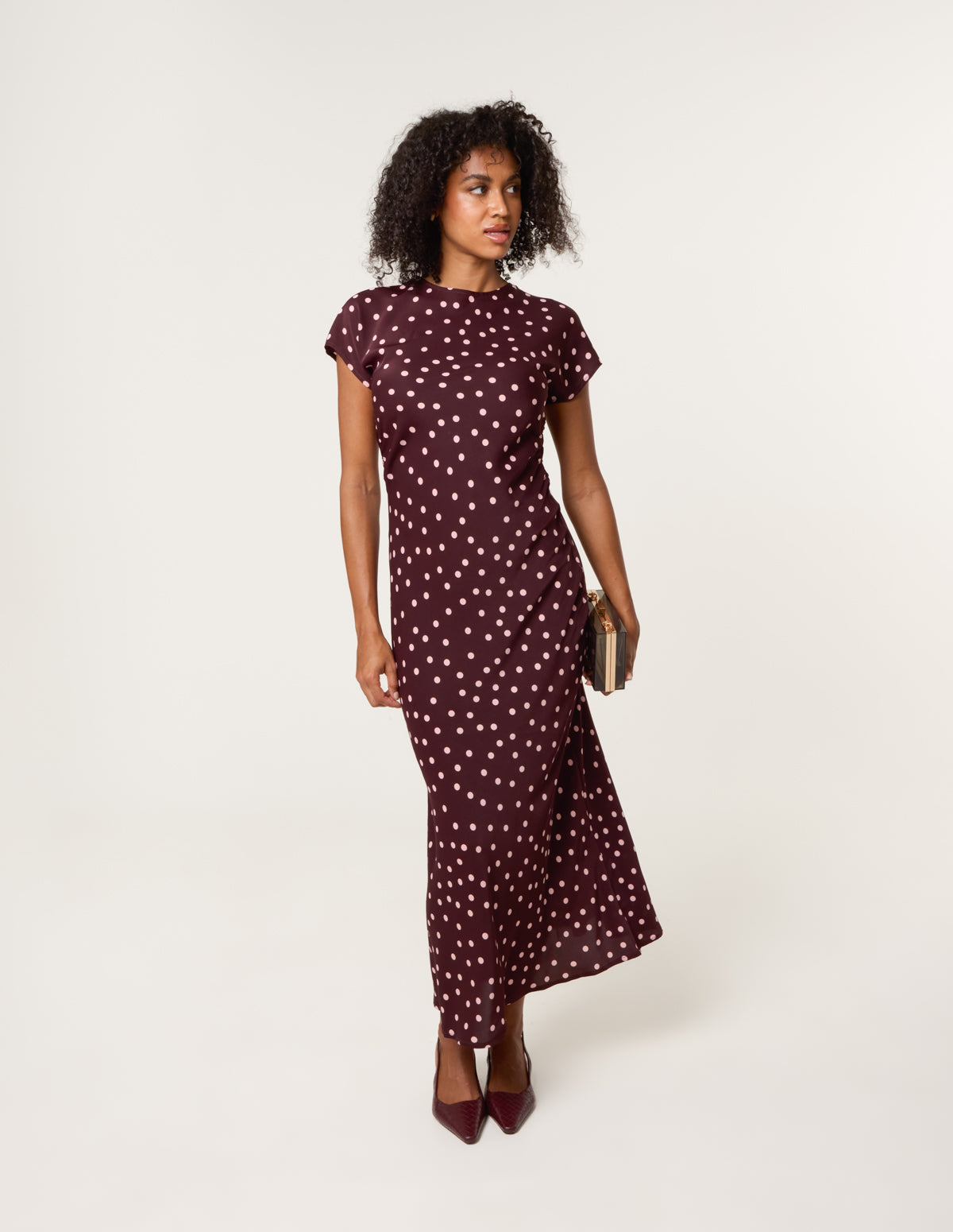 Add a playful element to daytime or evening looks with this polka dot silk slip dress.