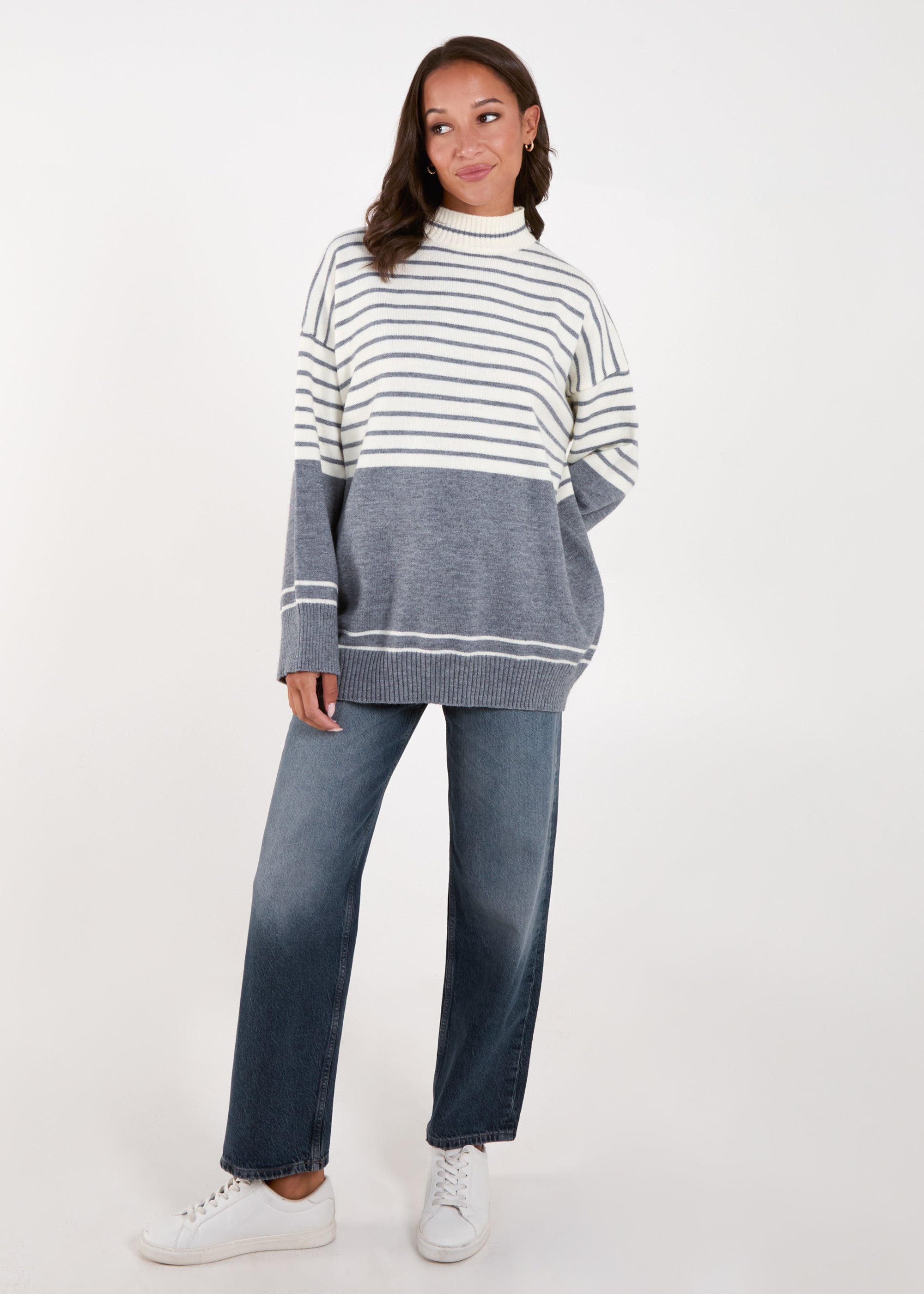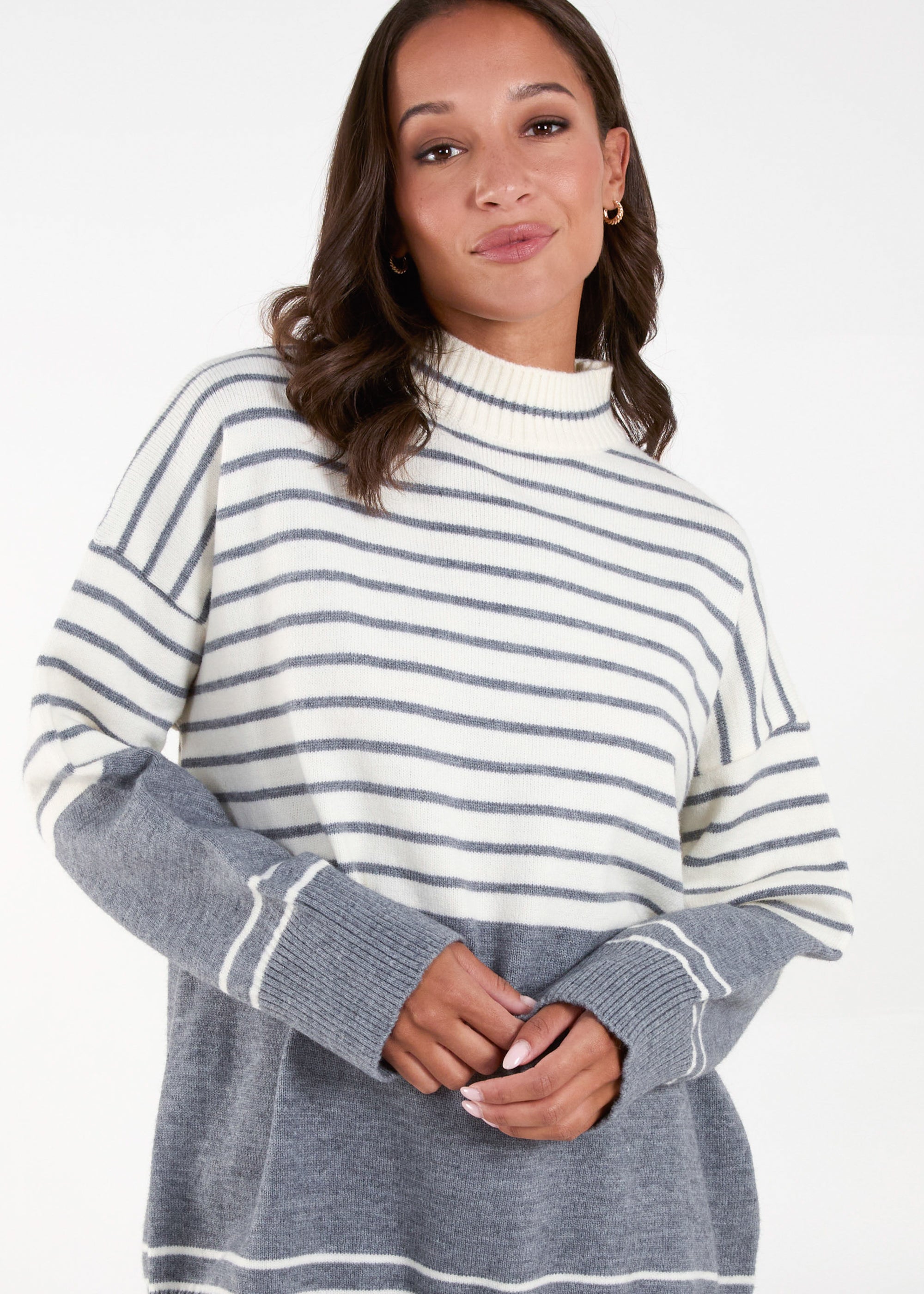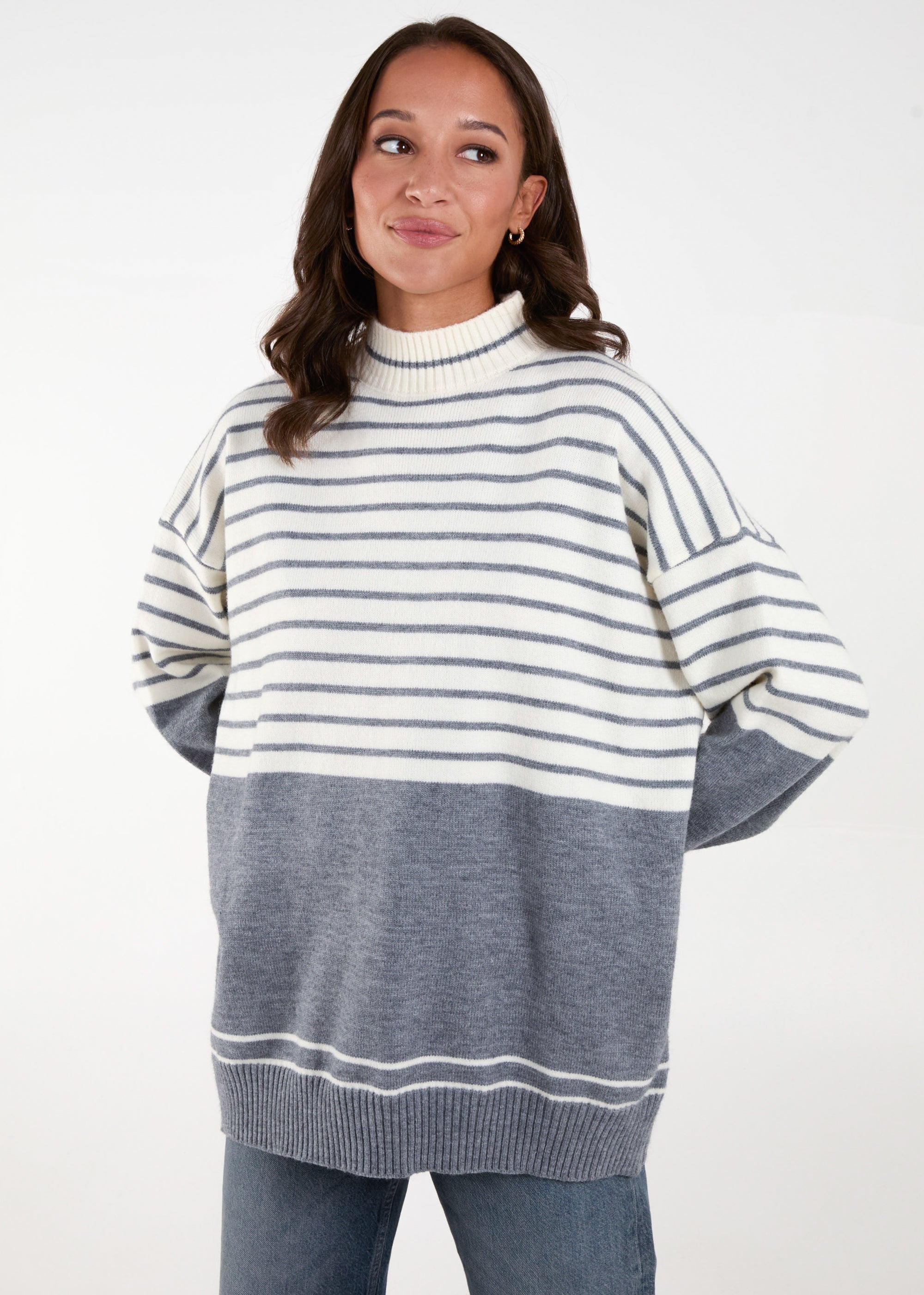 A fun option for those colder days ahead! This stripe jumper, is a cute fun option for you! Team with jeans and chunky boots, and PU jacket for the perfect Autumnal look!