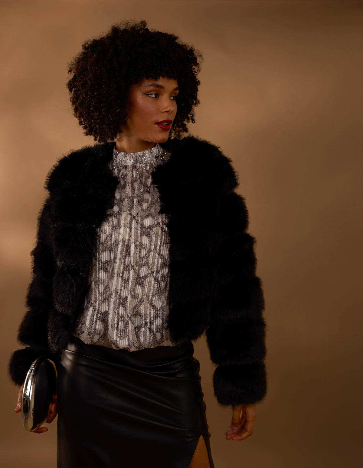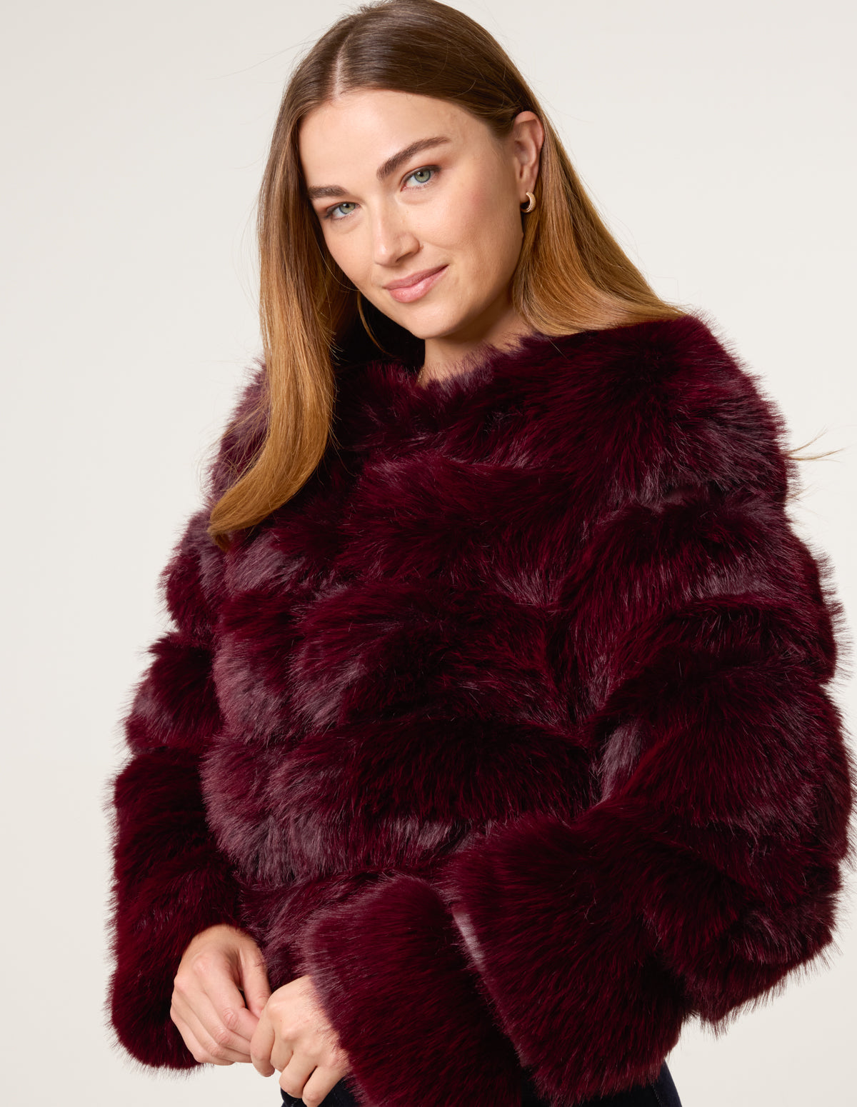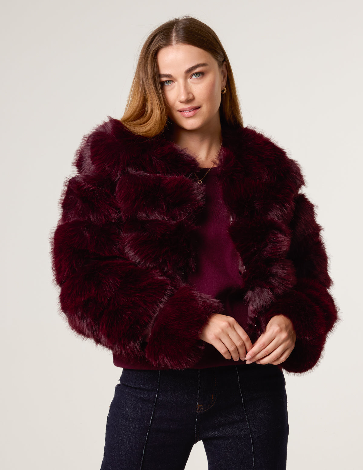 A stunning trimmed faux fur coat with pelted details. This coat will provide all the glam you need all season long.
