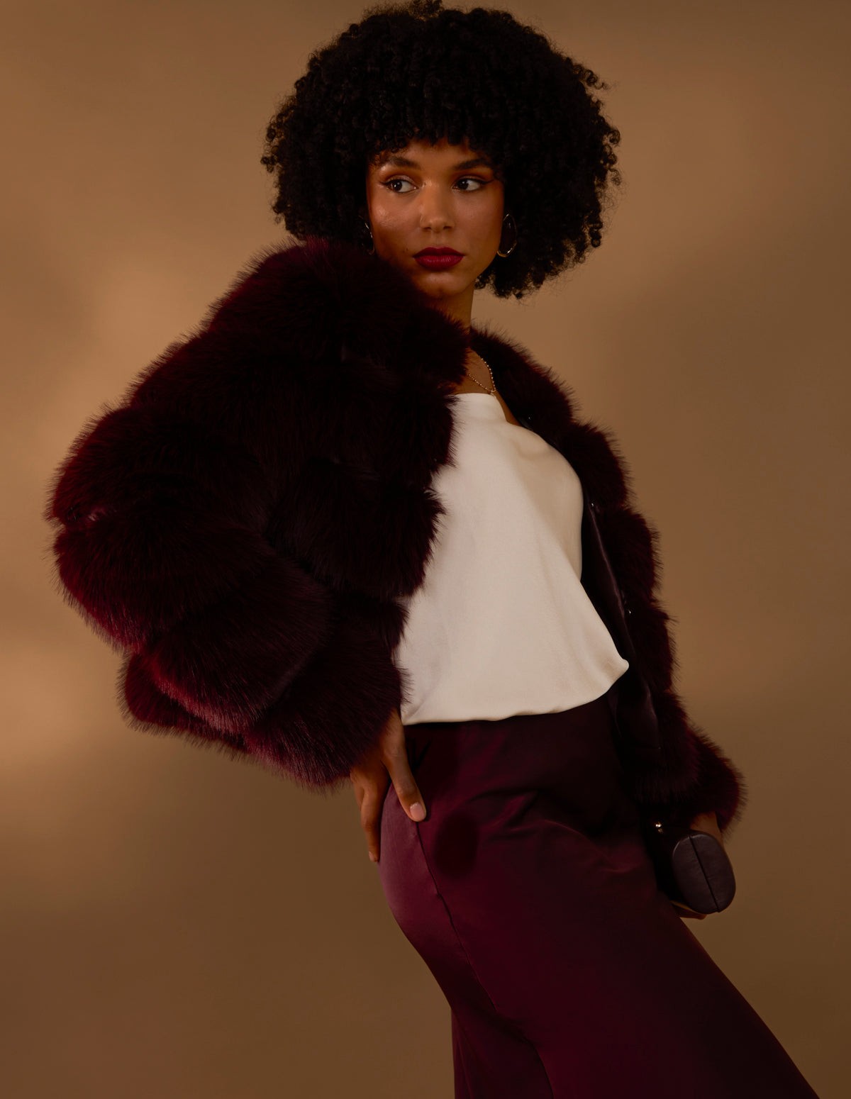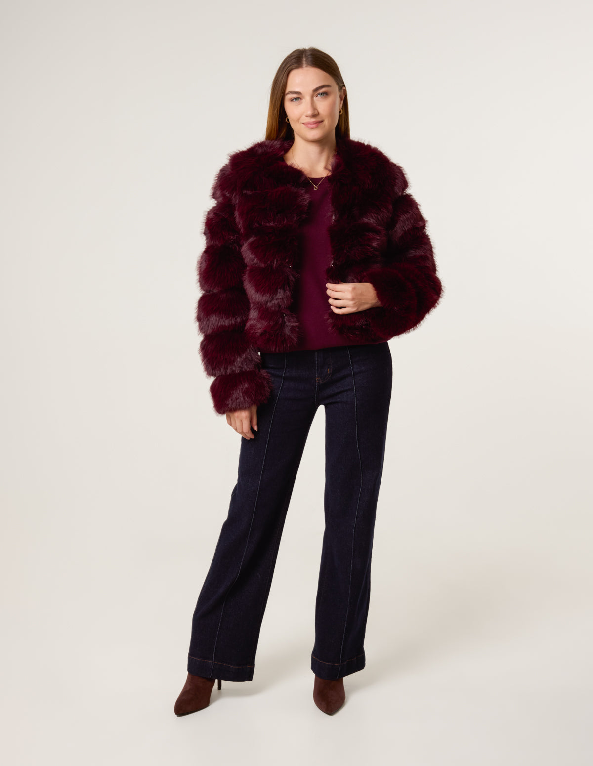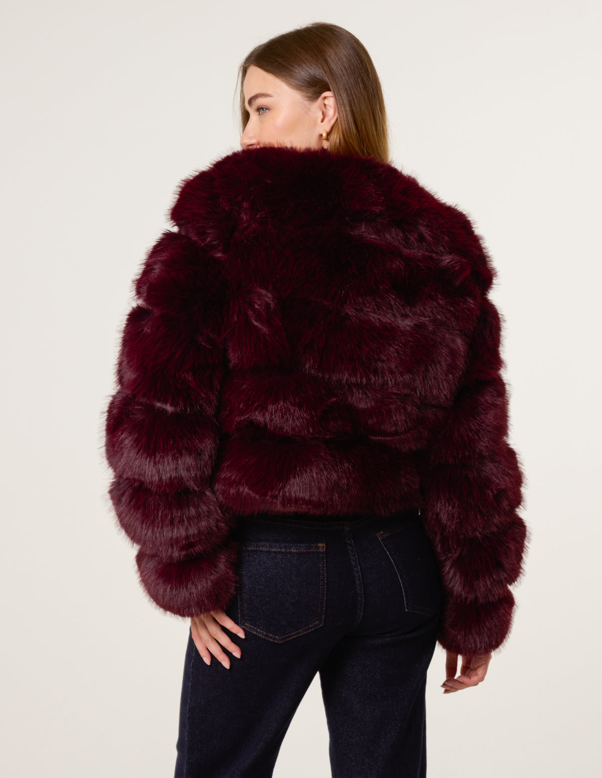 A stunning trimmed faux fur coat with pelted details. This coat will provide all the glam you need all season long.